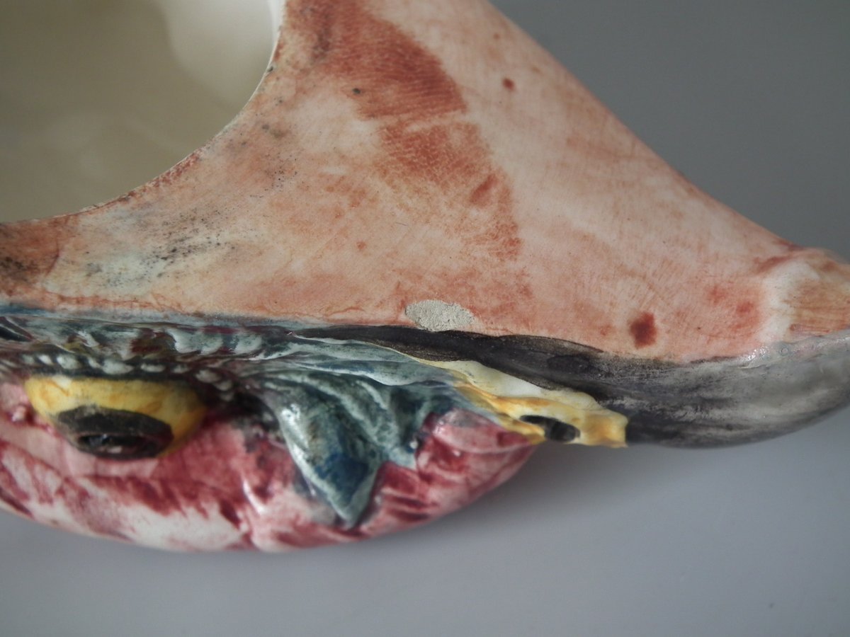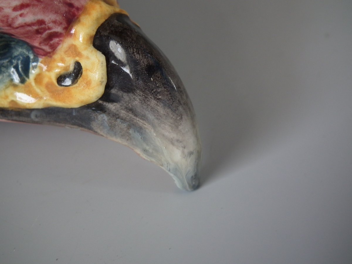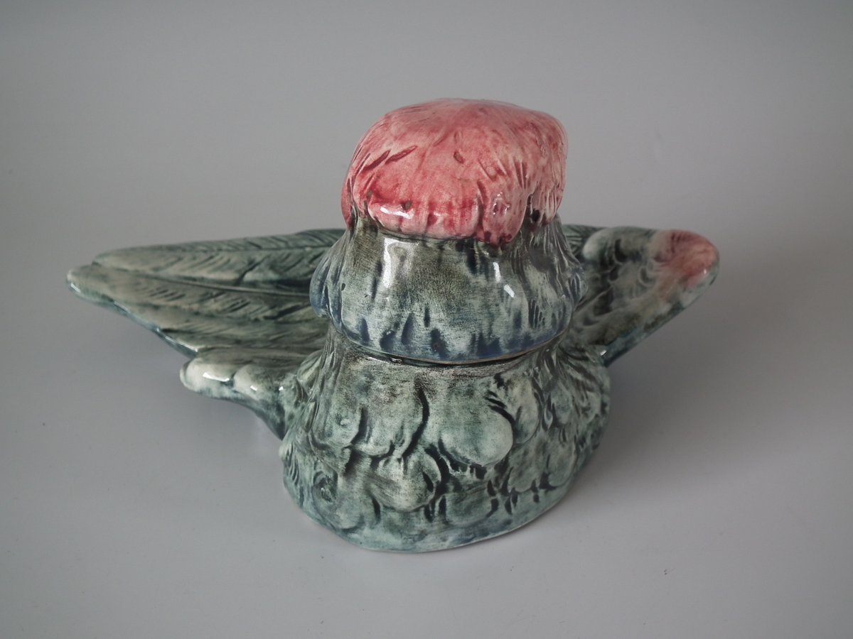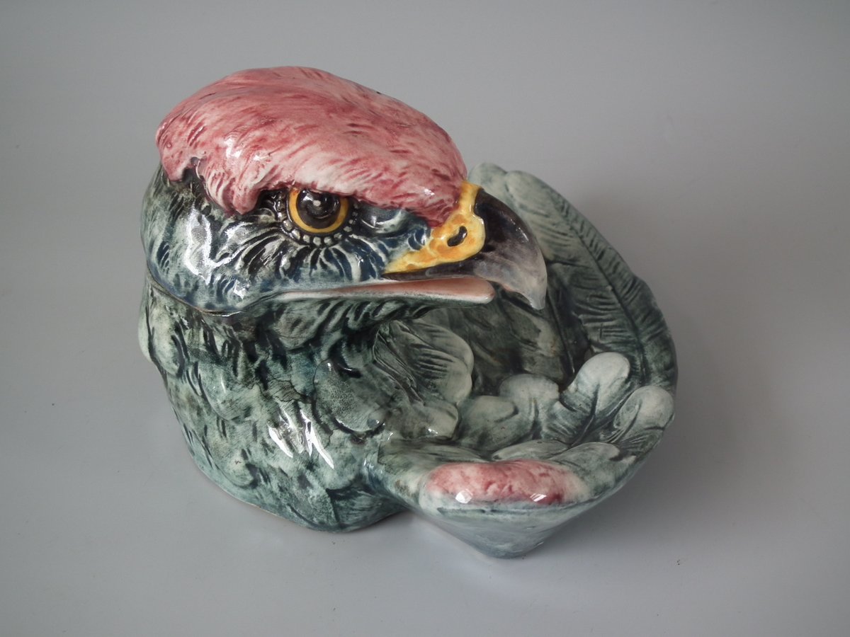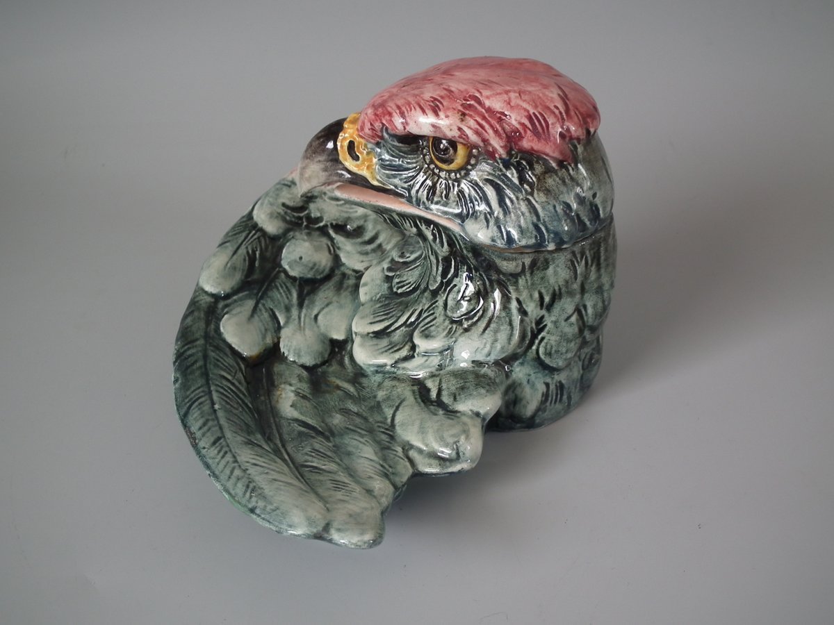 Victorian, circa 1900. 4.5ins high, 8.3ins wide, 5.9ins depth. English Majolica inkwell which features an eagle's head and wing.
