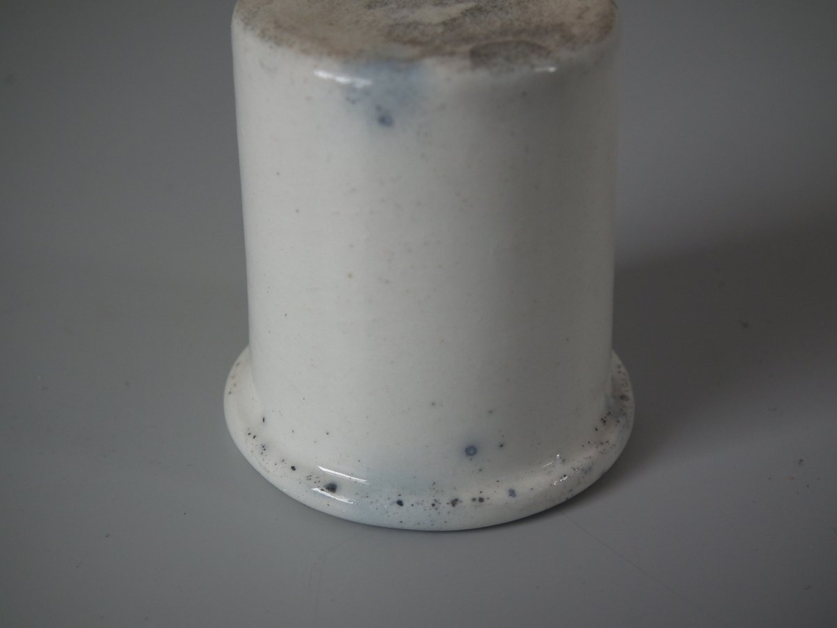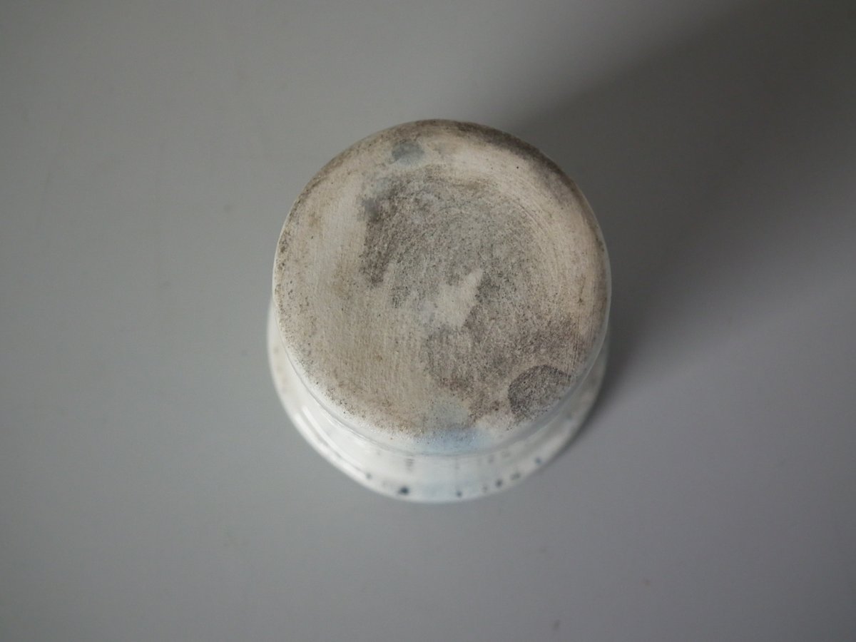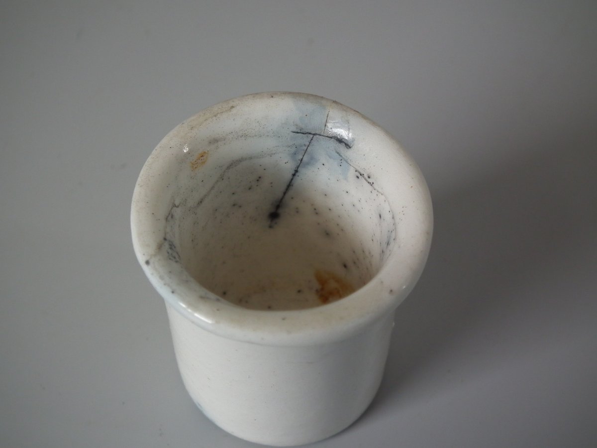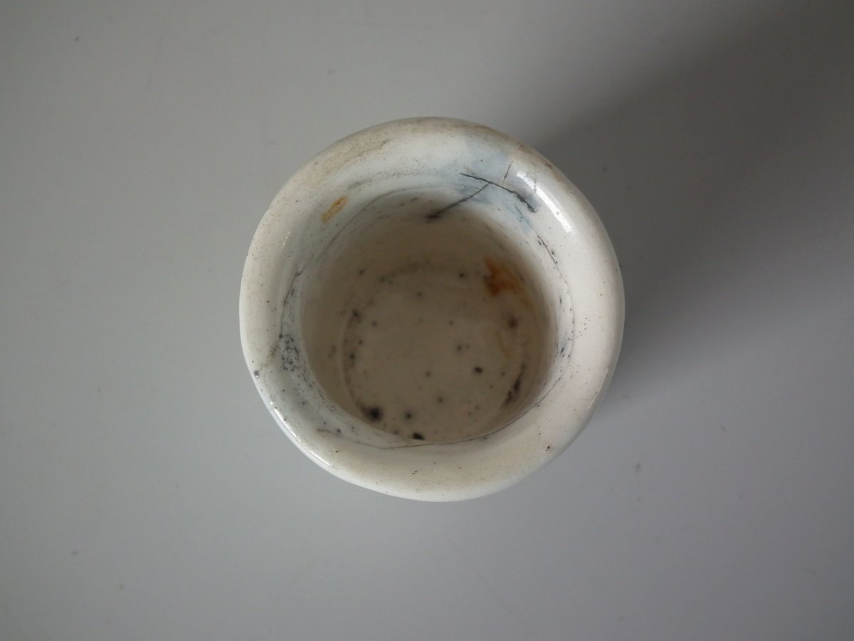 some ink staining caused through use. KILN EFFECTS: shrinkage cracks to interior. Glaze pops to the interior.