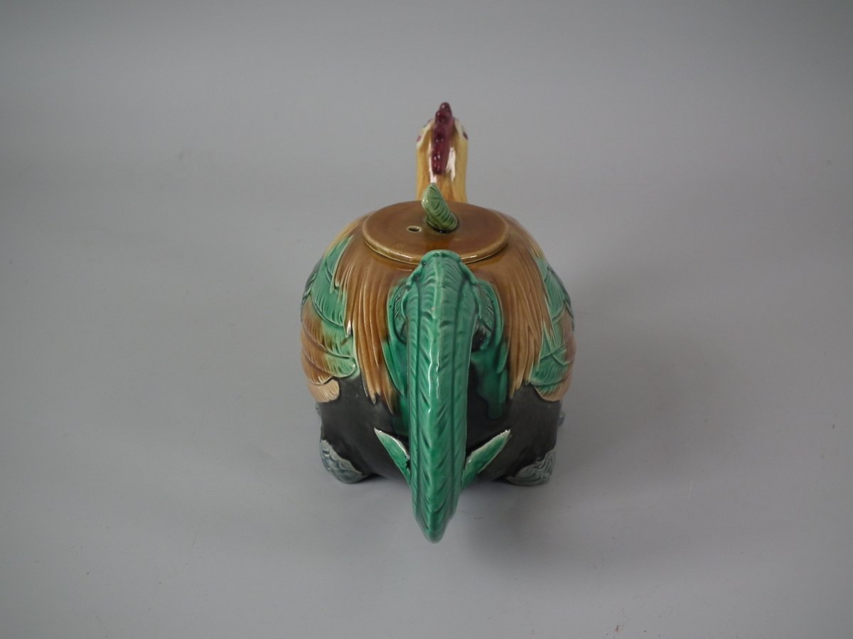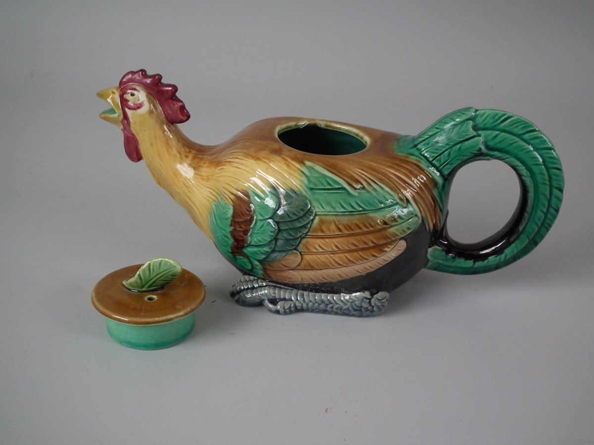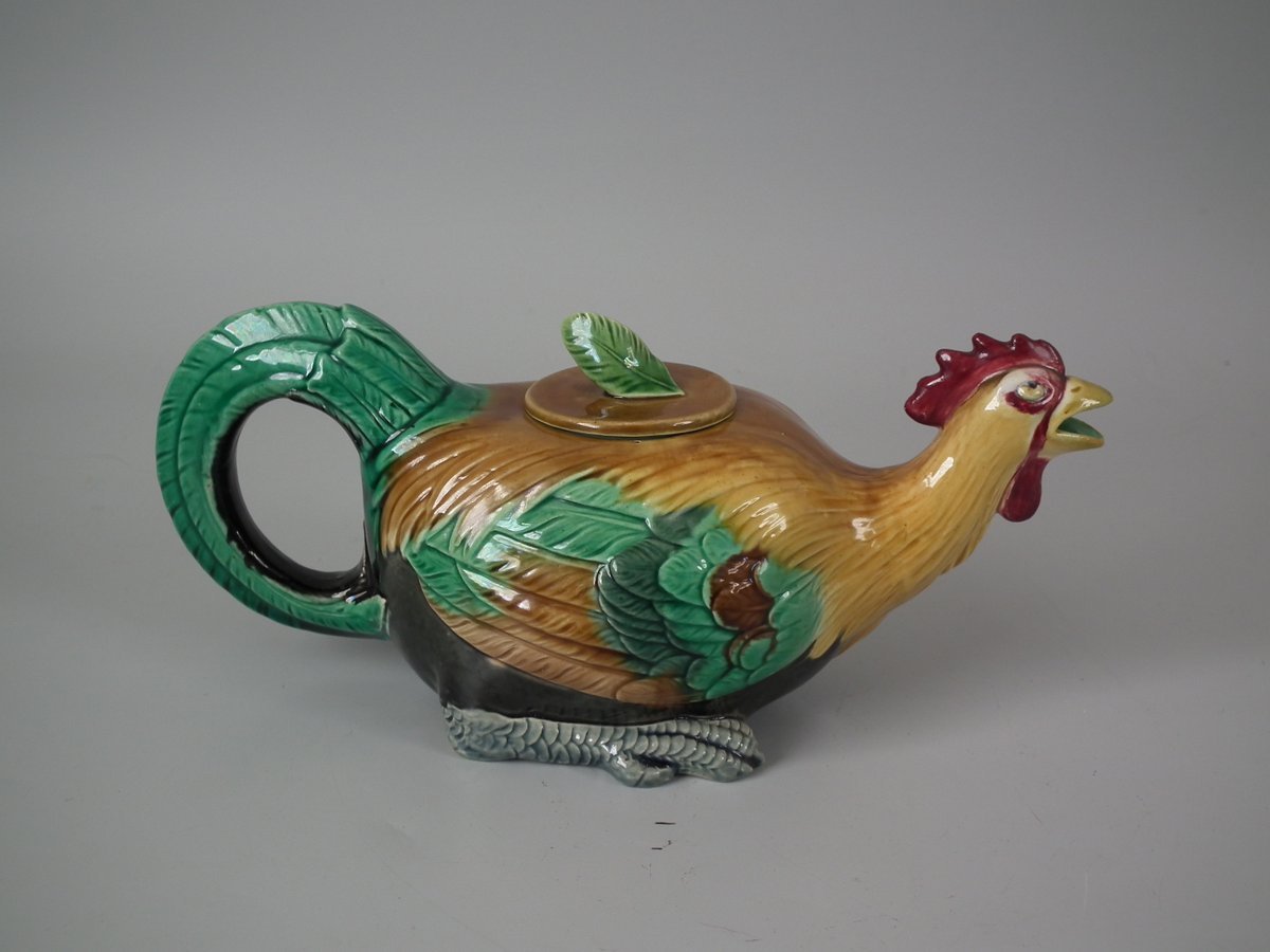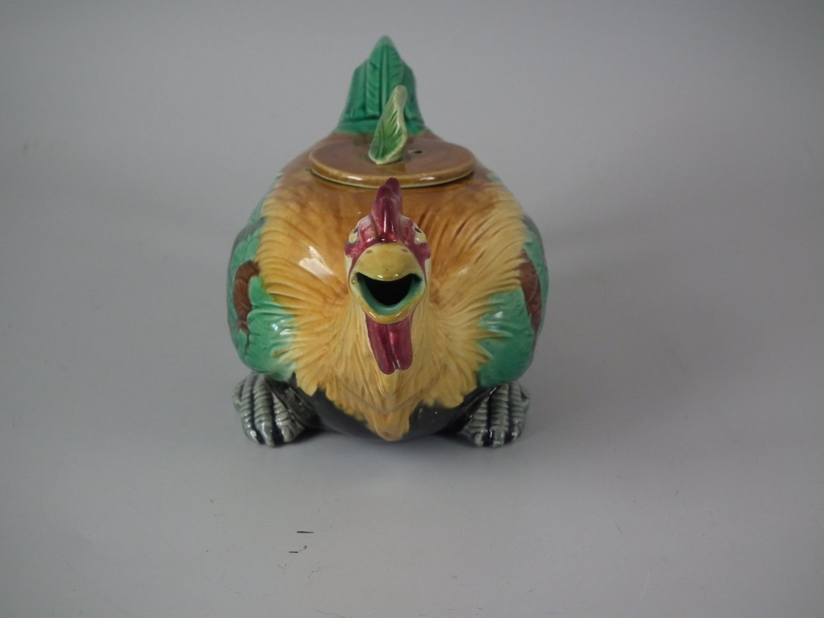 Victorian, circa 1876. 3.3ins high, 7.7ins wide, 3.1ins depth. Minton Majolica teapot which features a cockerel.