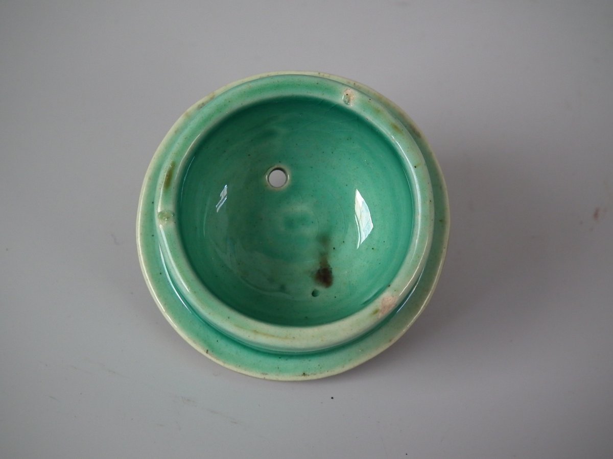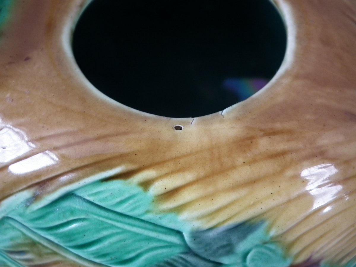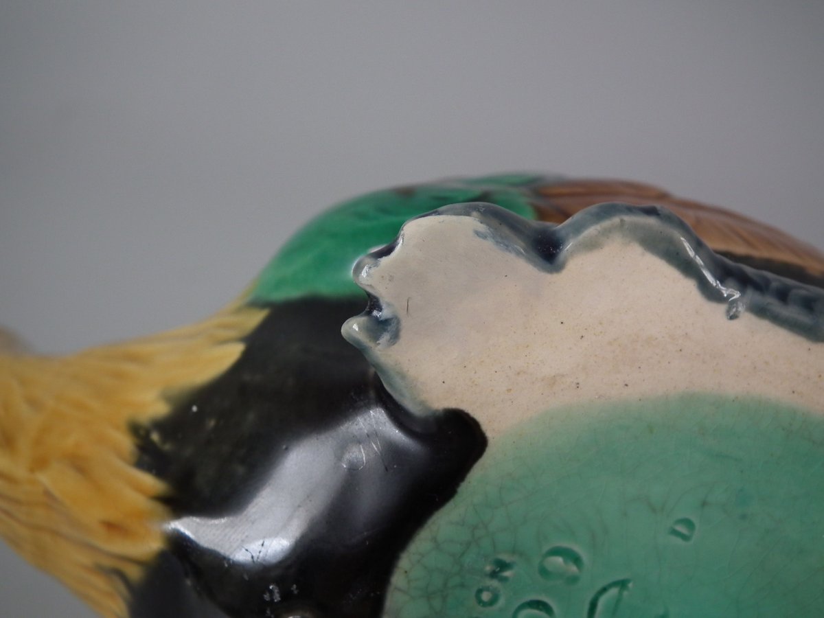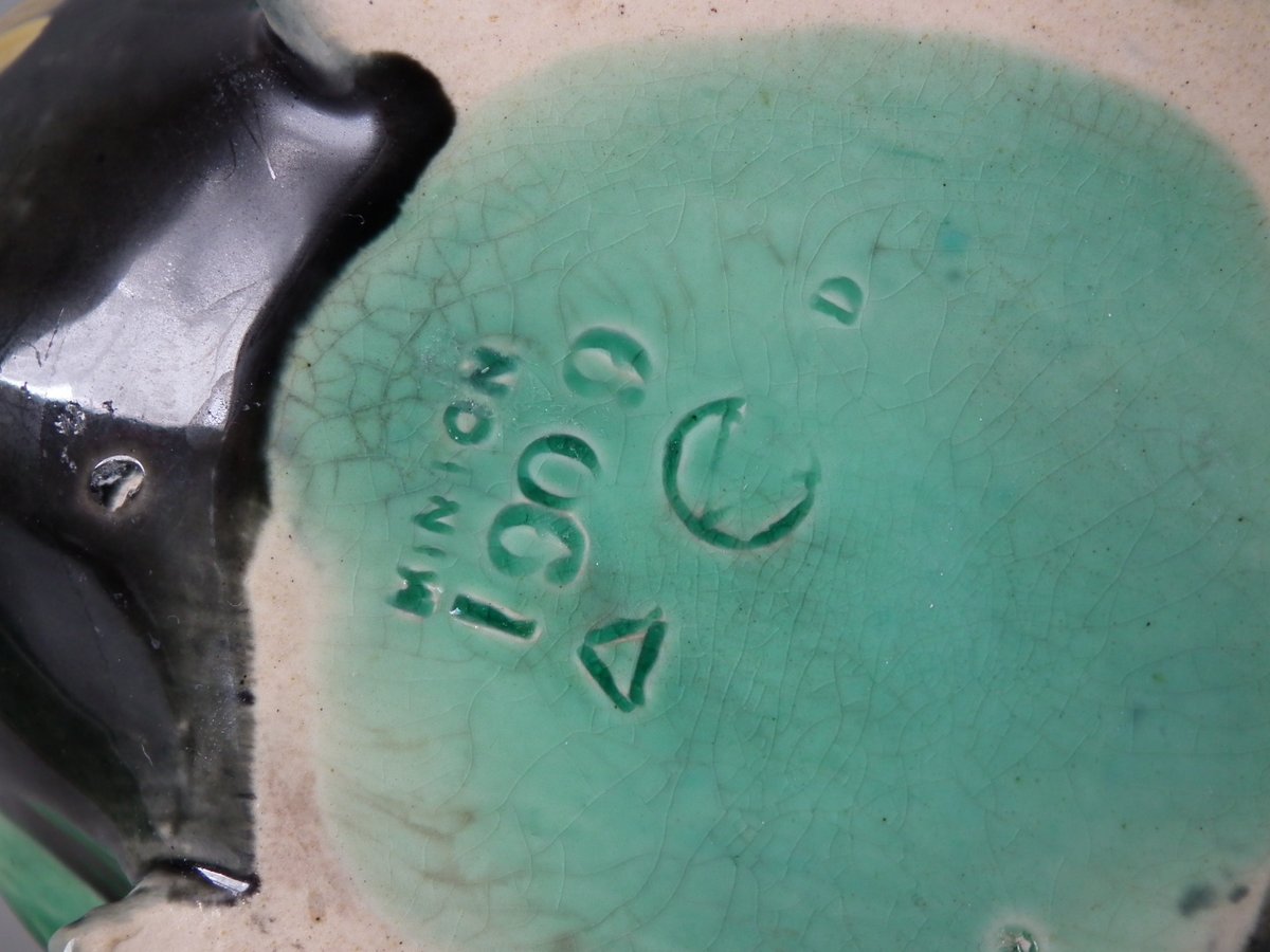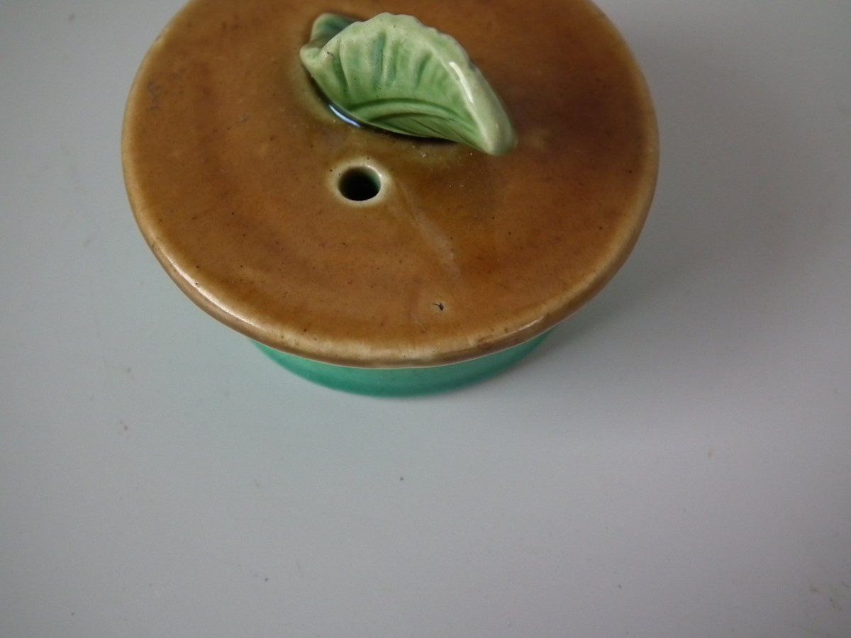 Victorian, circa 1876. 3.3ins high, 7.7ins wide, 3.1ins depth. Minton Majolica teapot which features a cockerel.