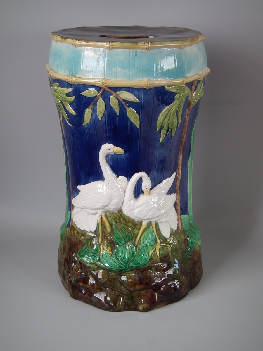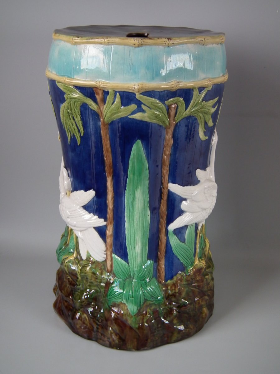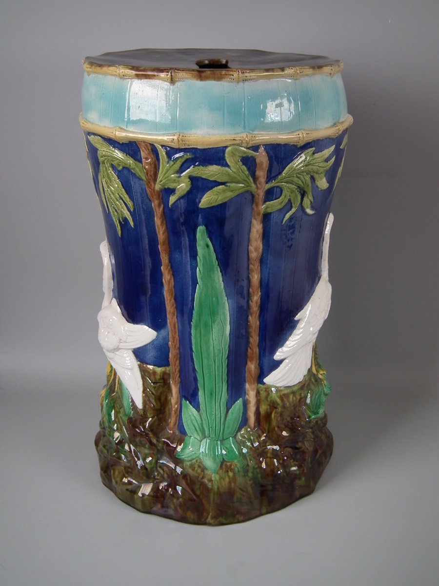 Victorian, circa 1880. 20.9ins high, 12.6ins wide, 12.6ins depth. Forester Majolica garden seat which features storks stood on rocky ground
