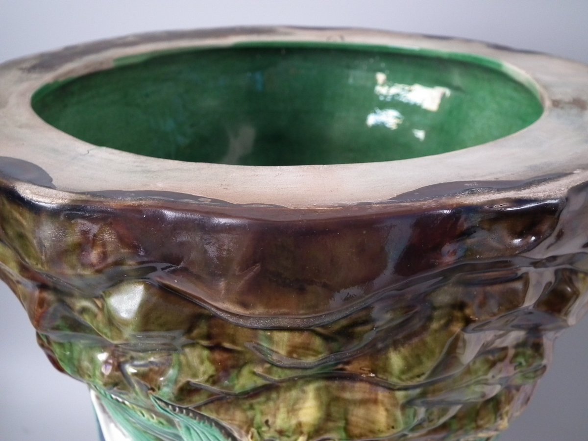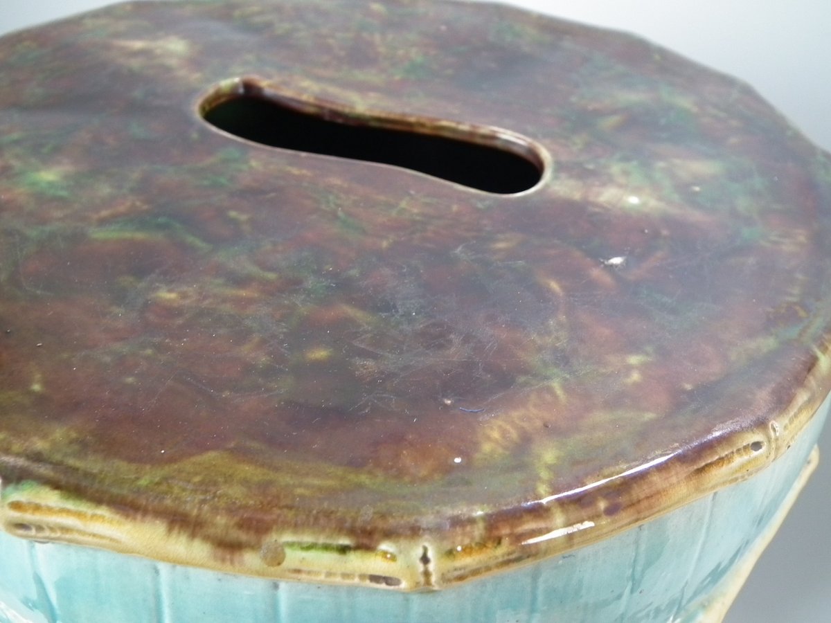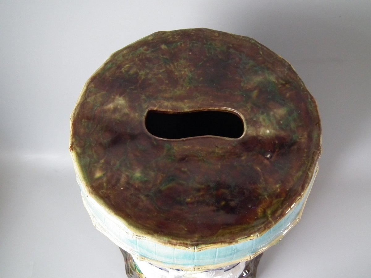 Victorian, circa 1880. 20.9ins high, 12.6ins wide, 12.6ins depth. Forester Majolica garden seat which features storks stood on rocky ground