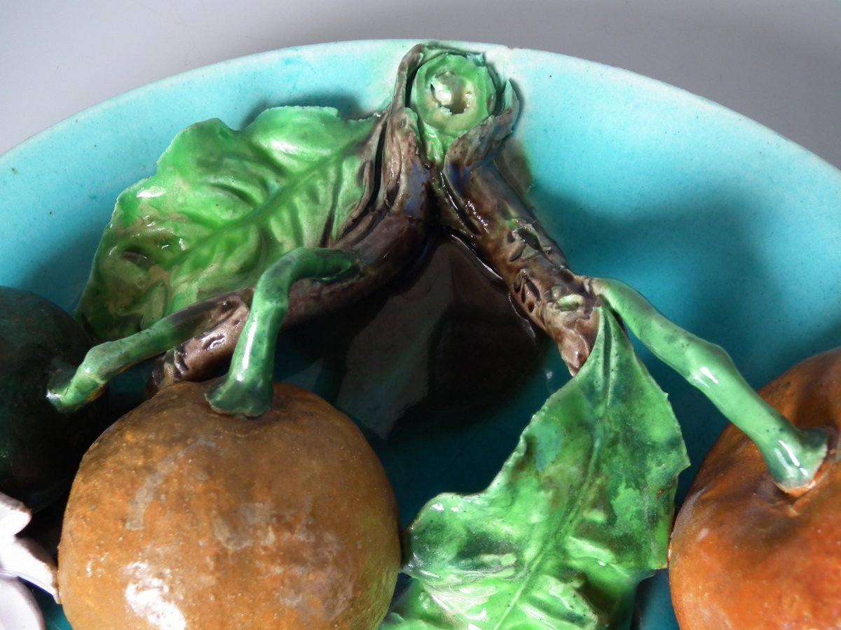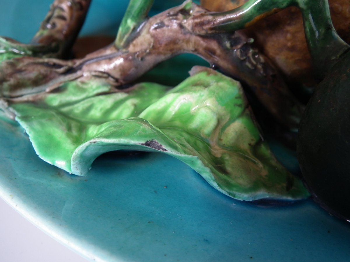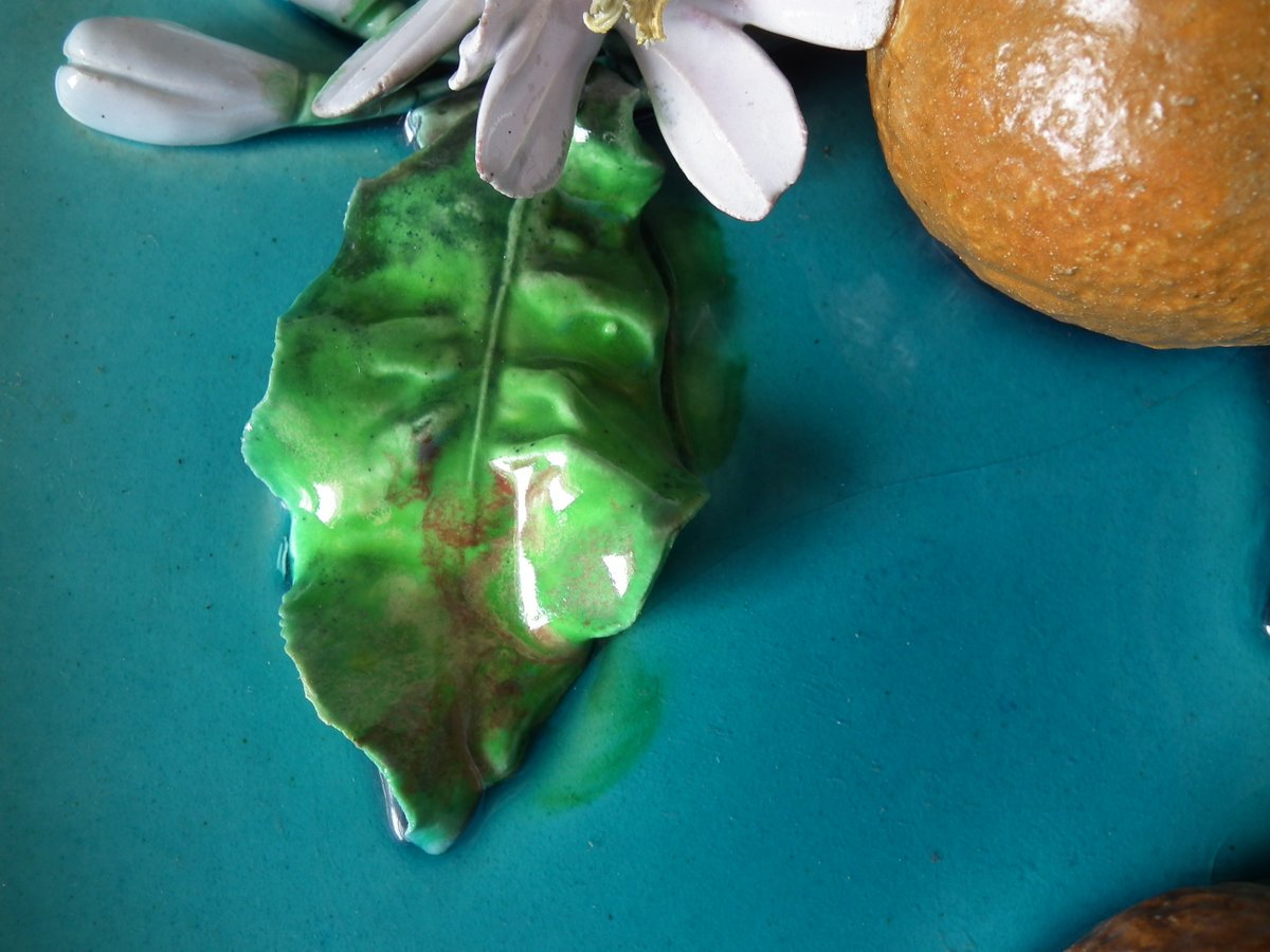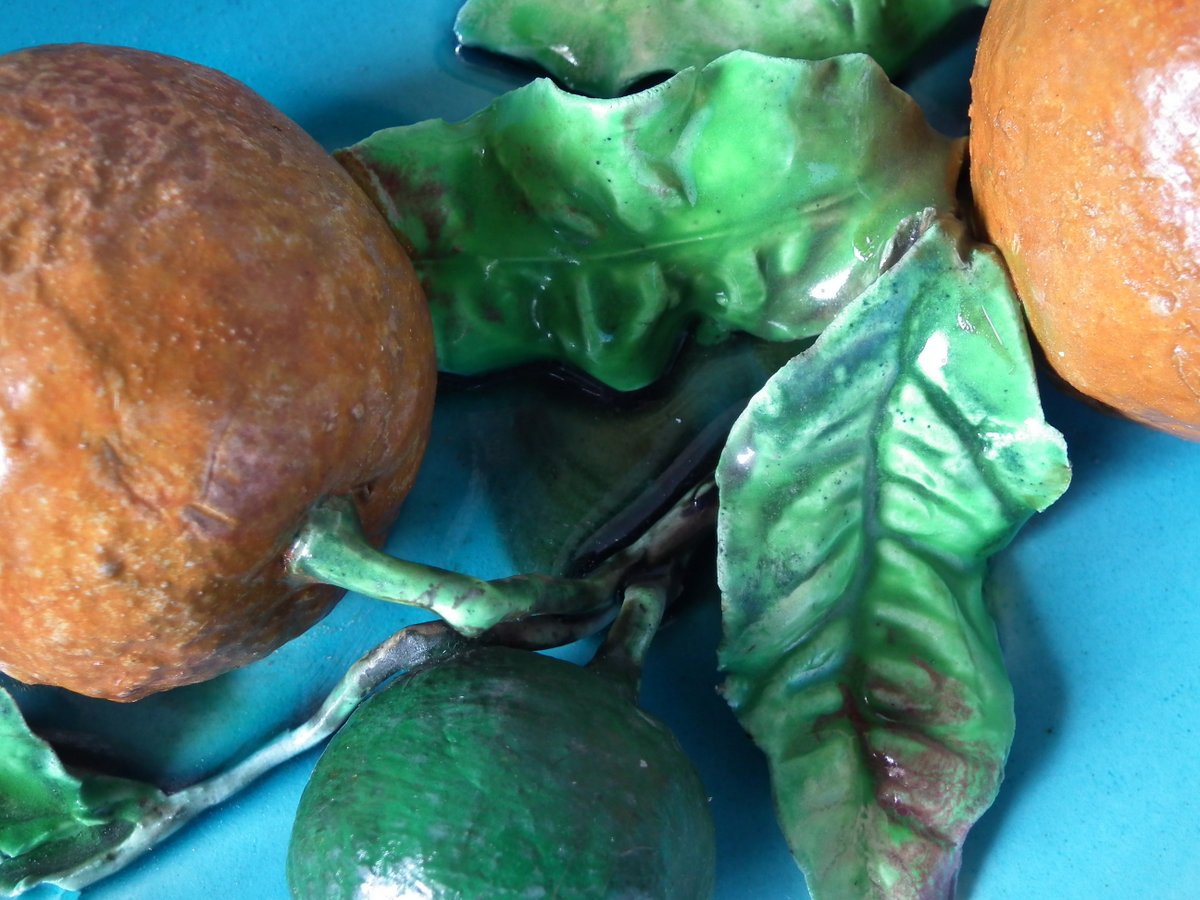 Circa 1880. 11ins high, 11ins wide, 3.5ins depth. Menton Majolica wall plate which features oranges, leaves and flowers.