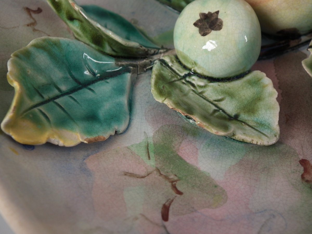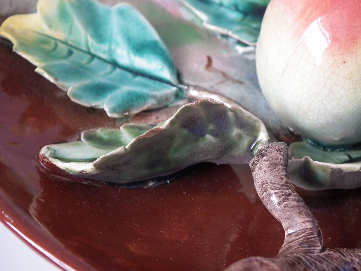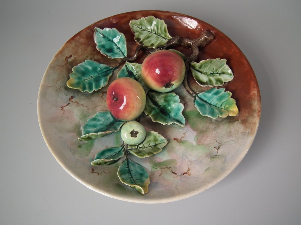 Circa 1910. 10.2ins high, 10.2ins wide, 3ins depth. Unidentified French Majolica wall plate which features apples on a branch.