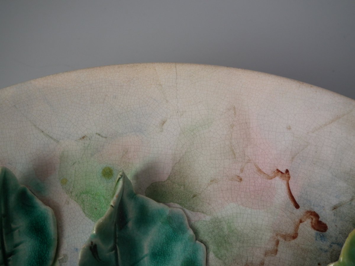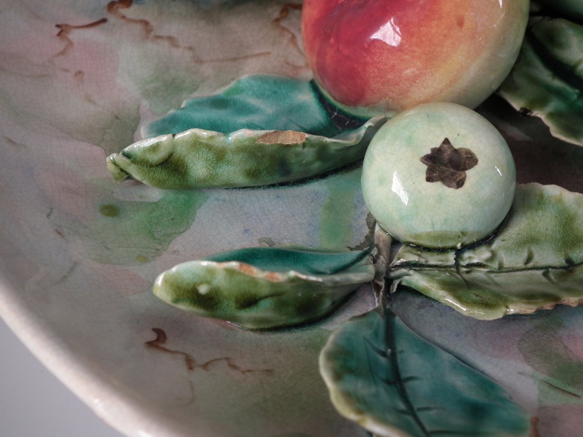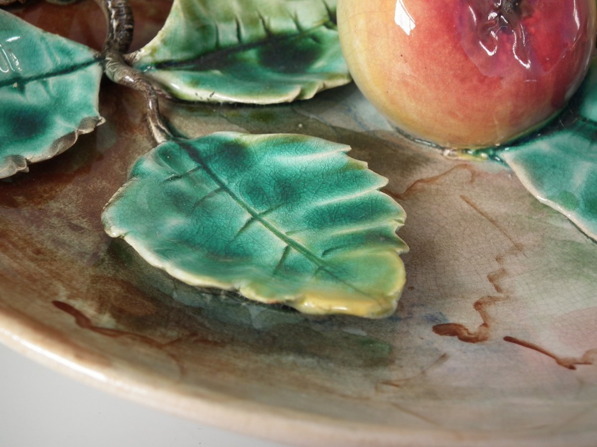Circa 1910. 10.2ins high, 10.2ins wide, 3ins depth. Unidentified French Majolica wall plate which features apples on a branch.