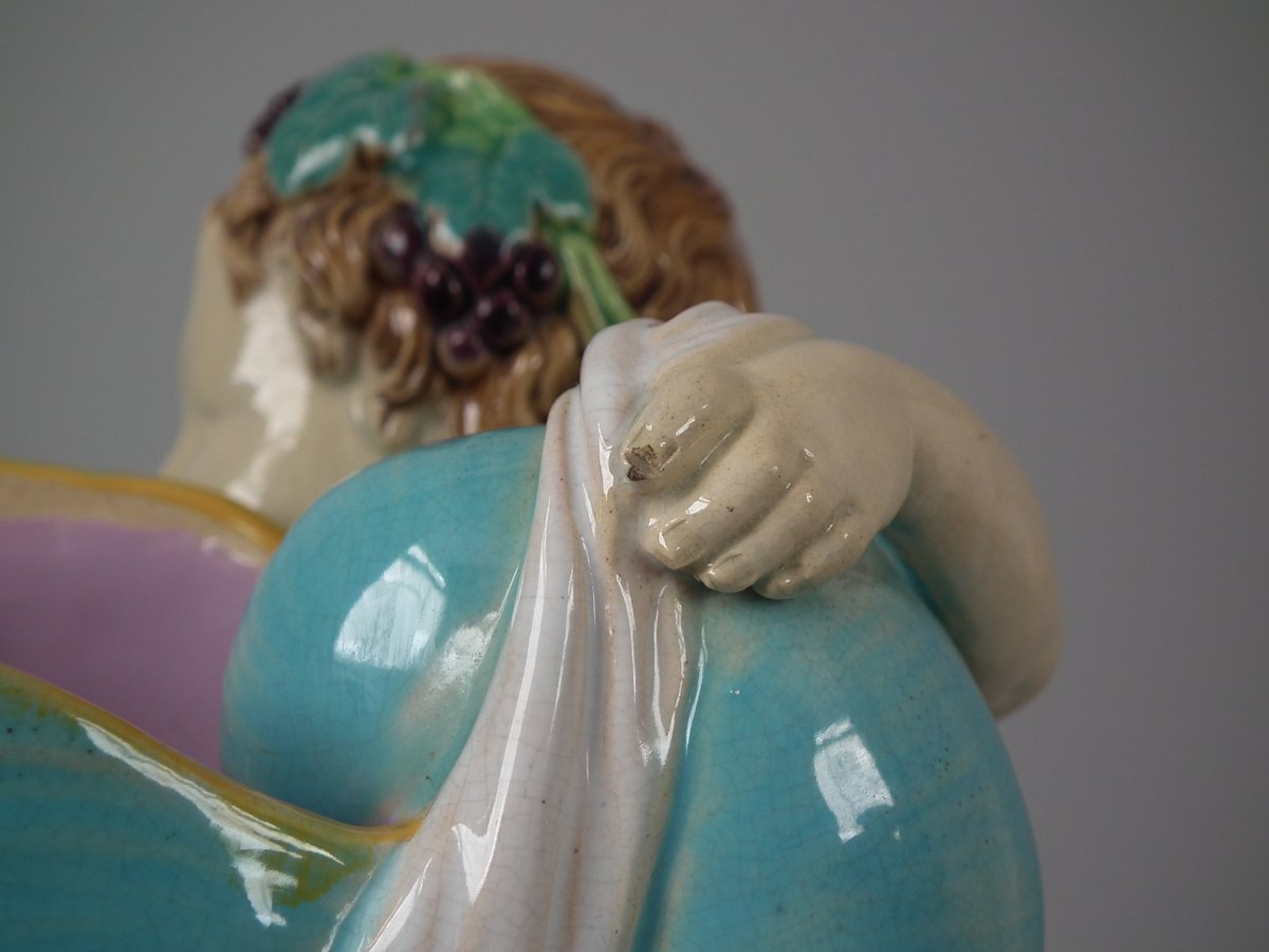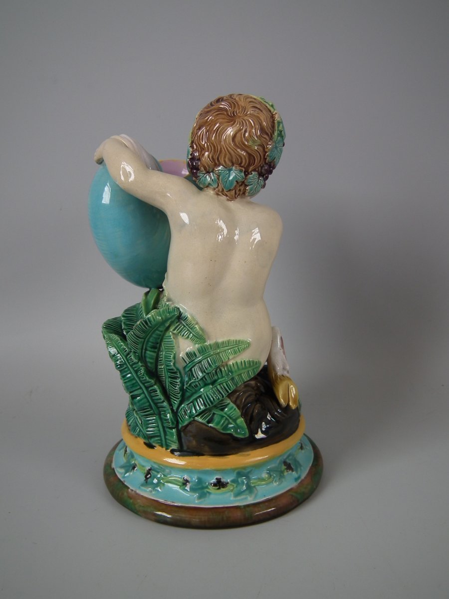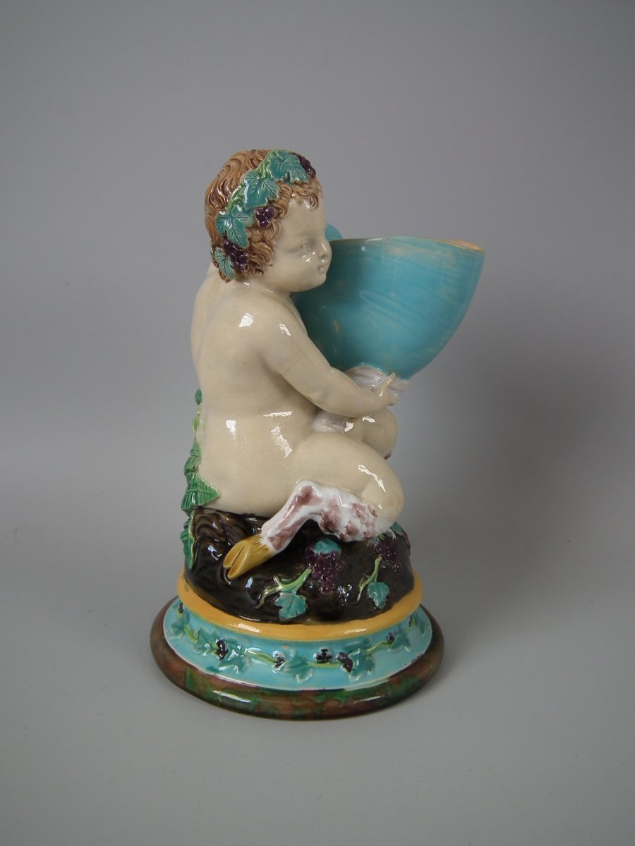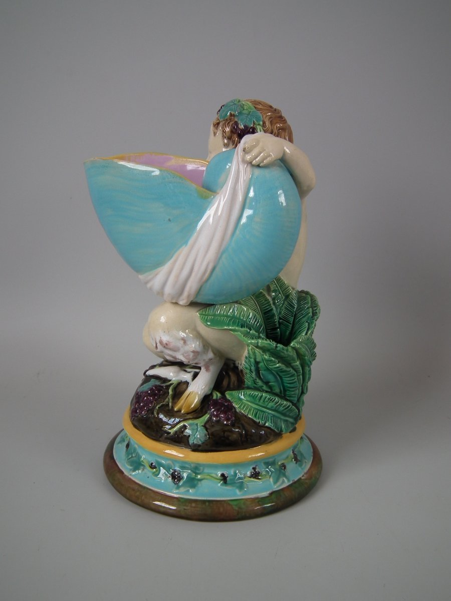 Victorian, circa 1870. 8.7ins high, 5.5ins wide, 5.3ins depth. George Jones Majolica figure which features a faun holding a shell and a leafy vase behind.