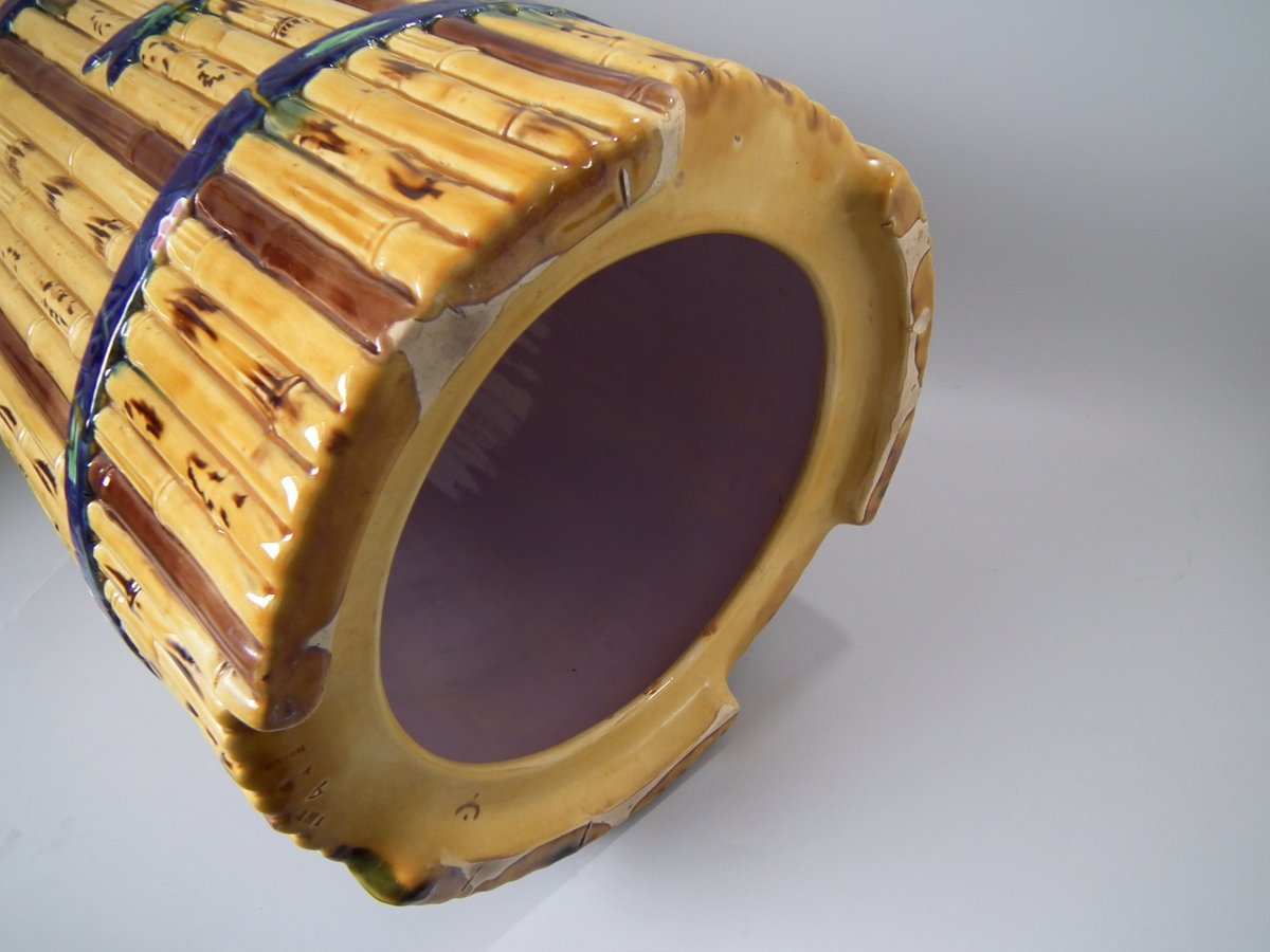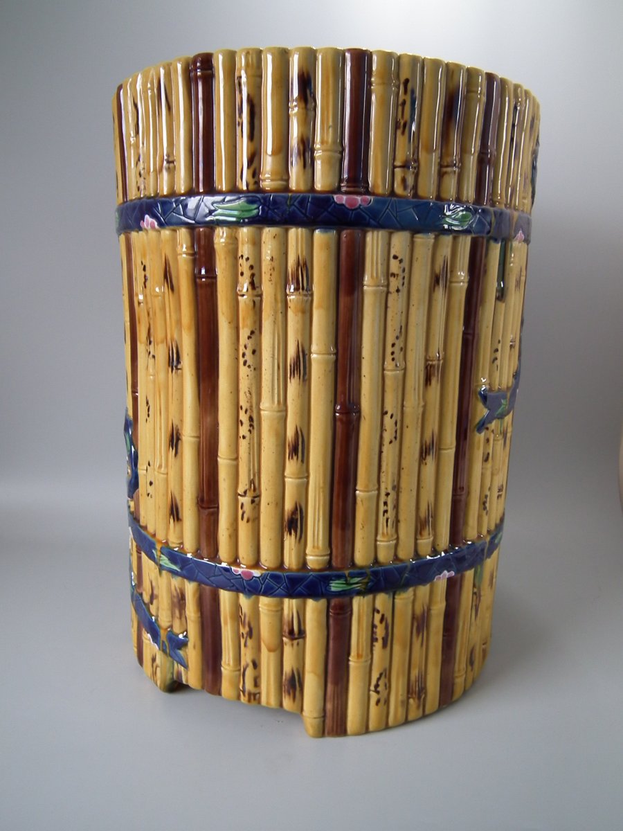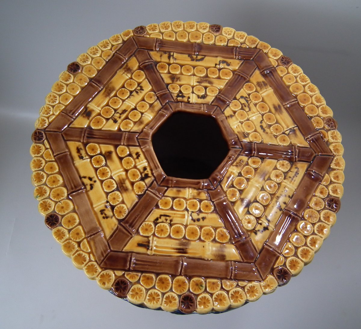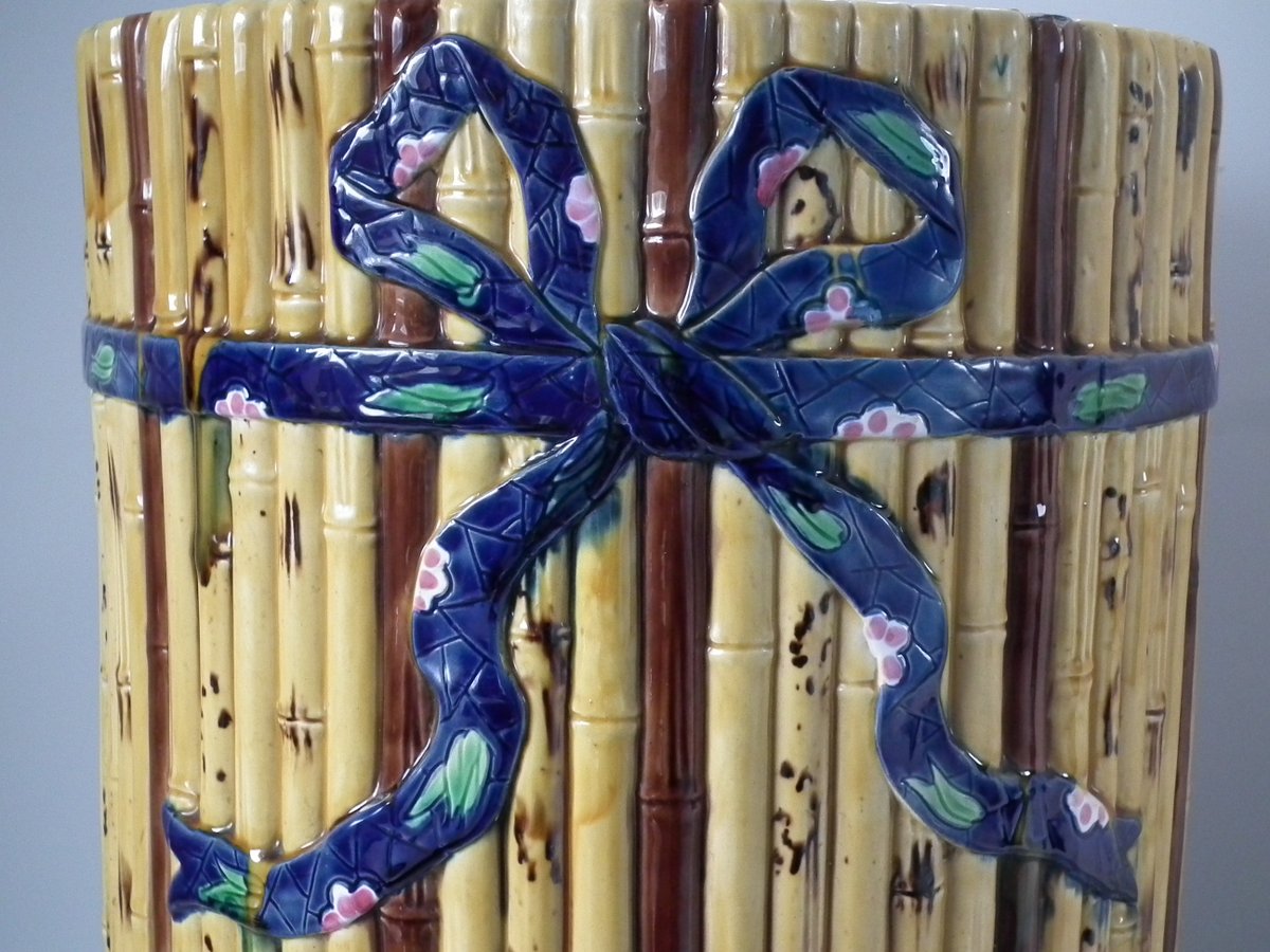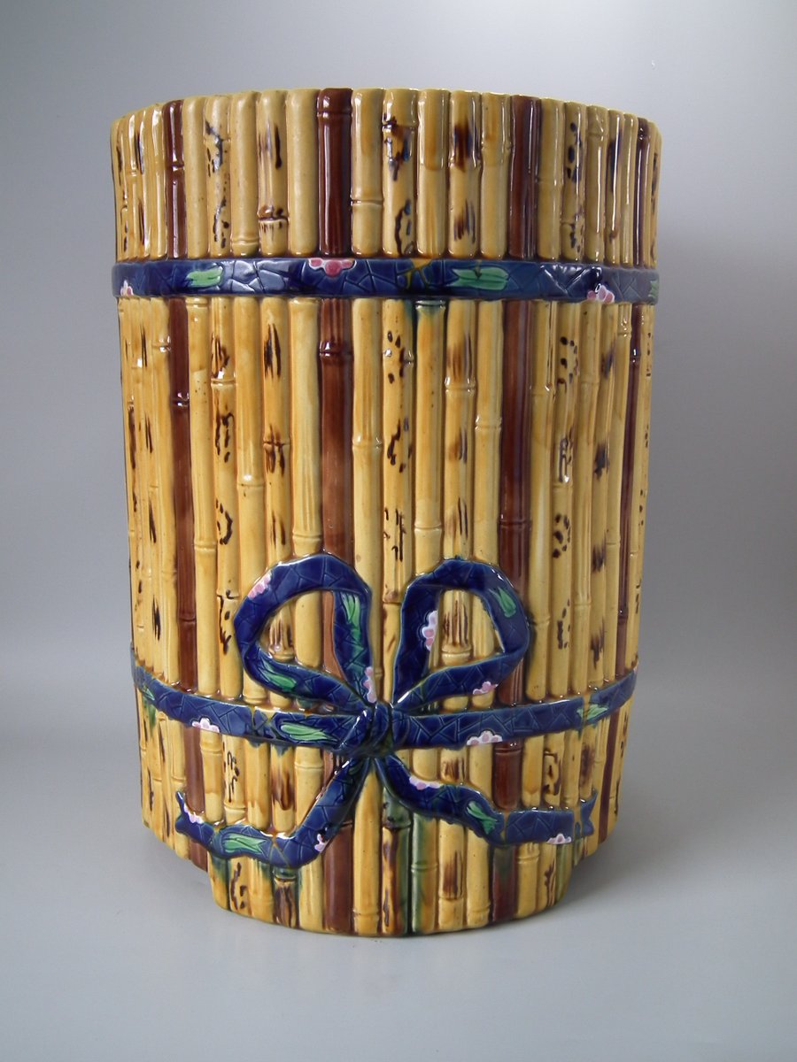 Victorian, circa 1865. 18.5ins high, 13.4ins wide, 13.4ins depth. Minton Majolica garden seat which features a bundle of bamboo tied with decorated blue ribbon.