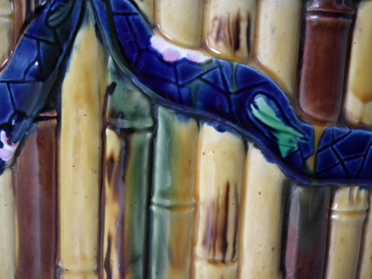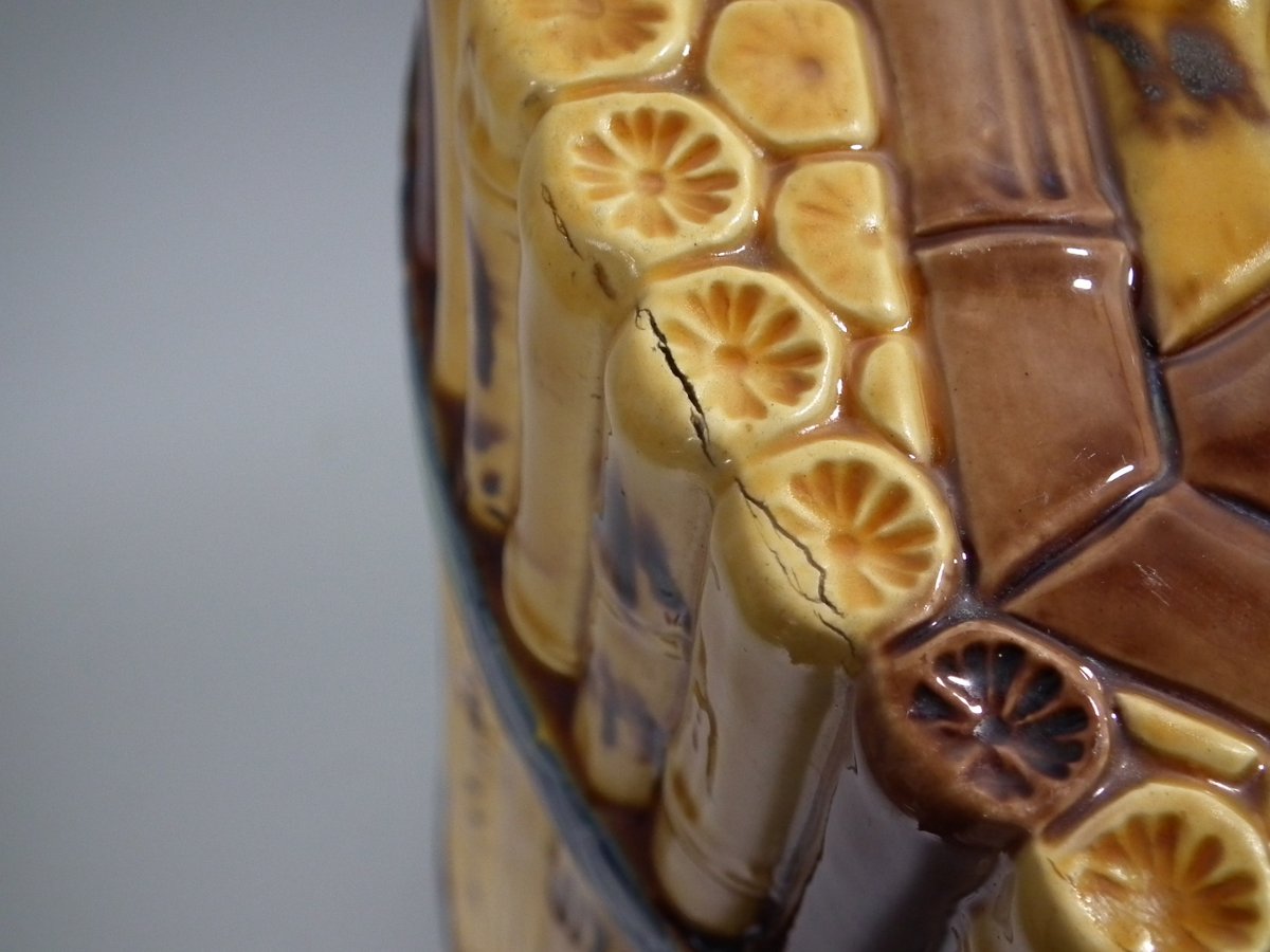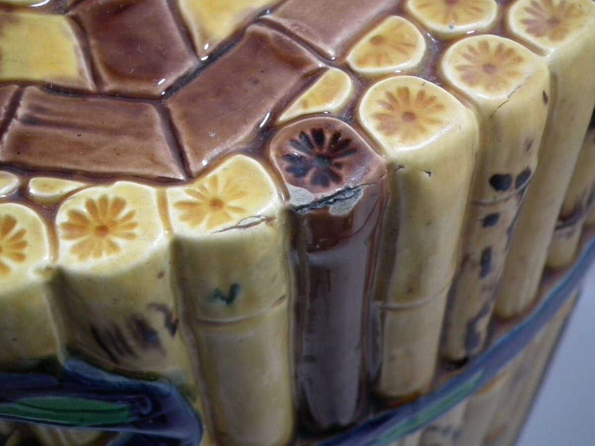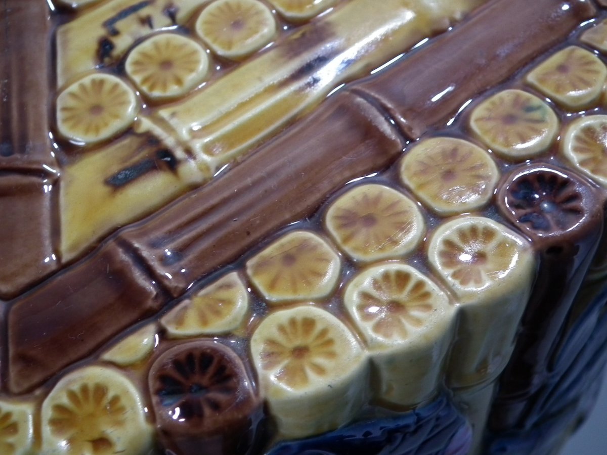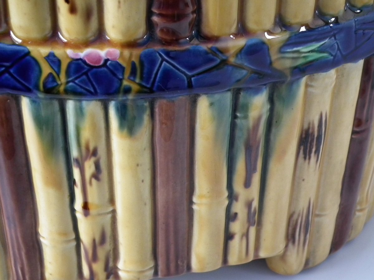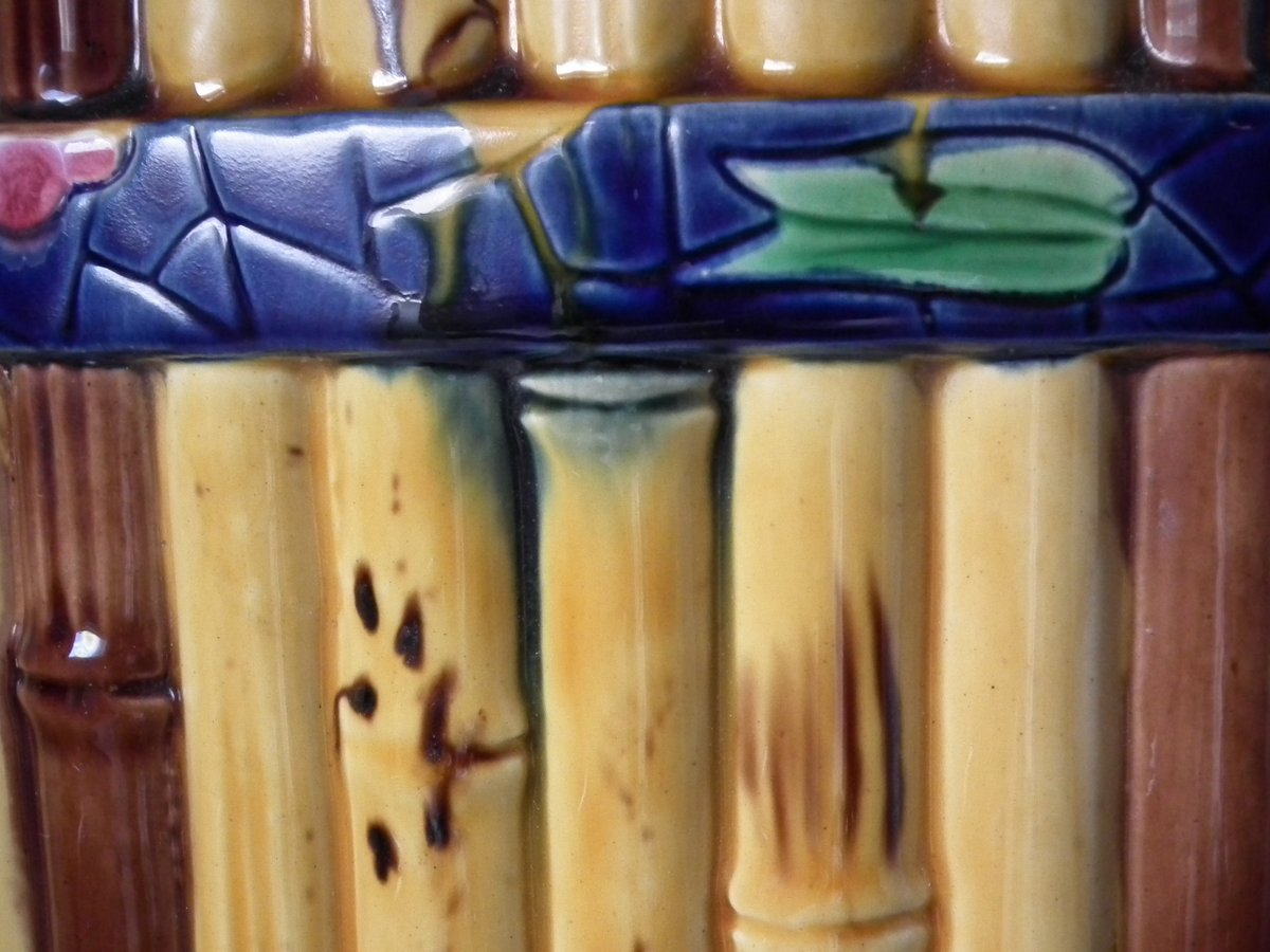 Victorian, circa 1865. 18.5ins high, 13.4ins wide, 13.4ins depth. Minton Majolica garden seat which features a bundle of bamboo tied with decorated blue ribbon.