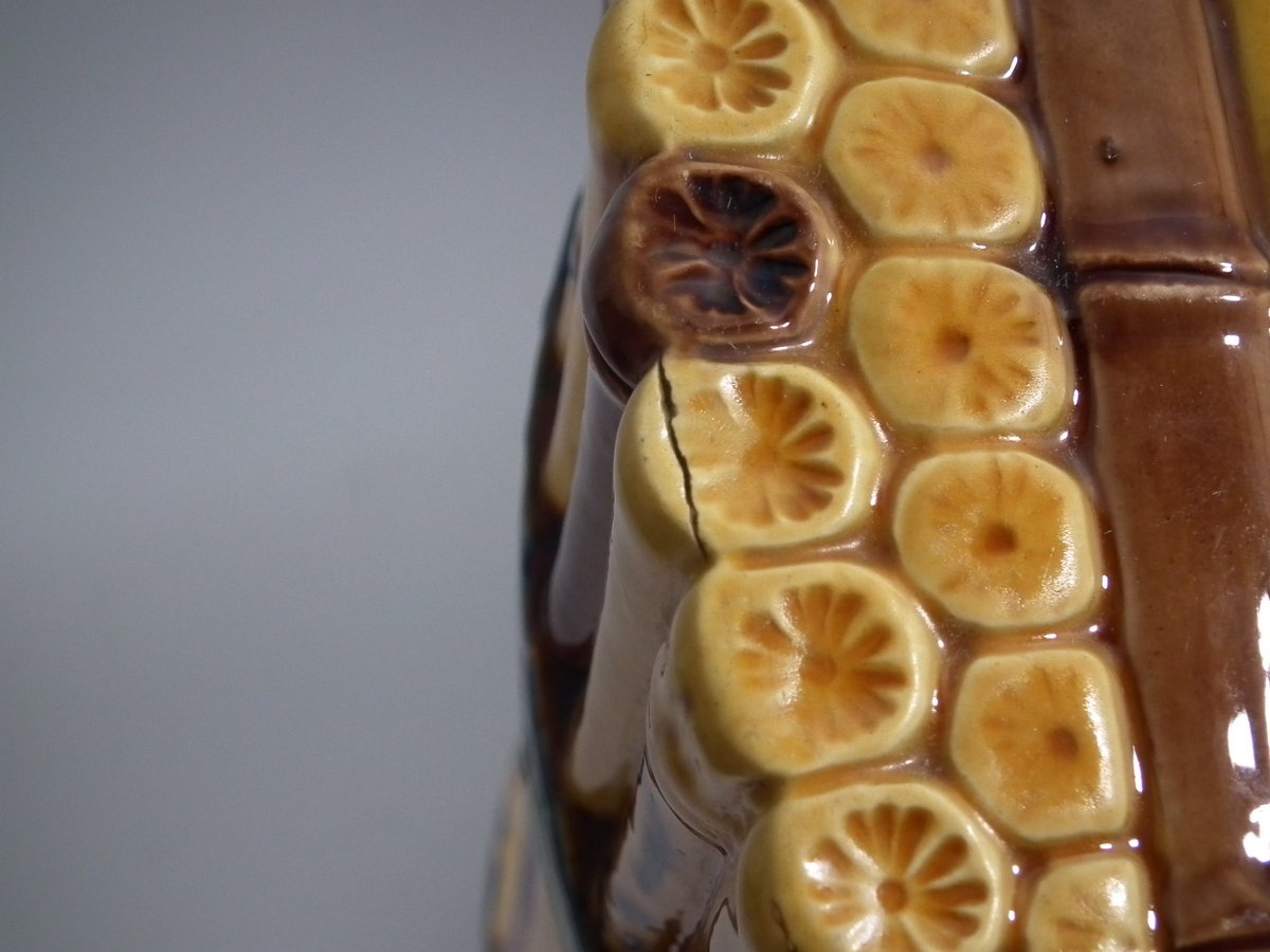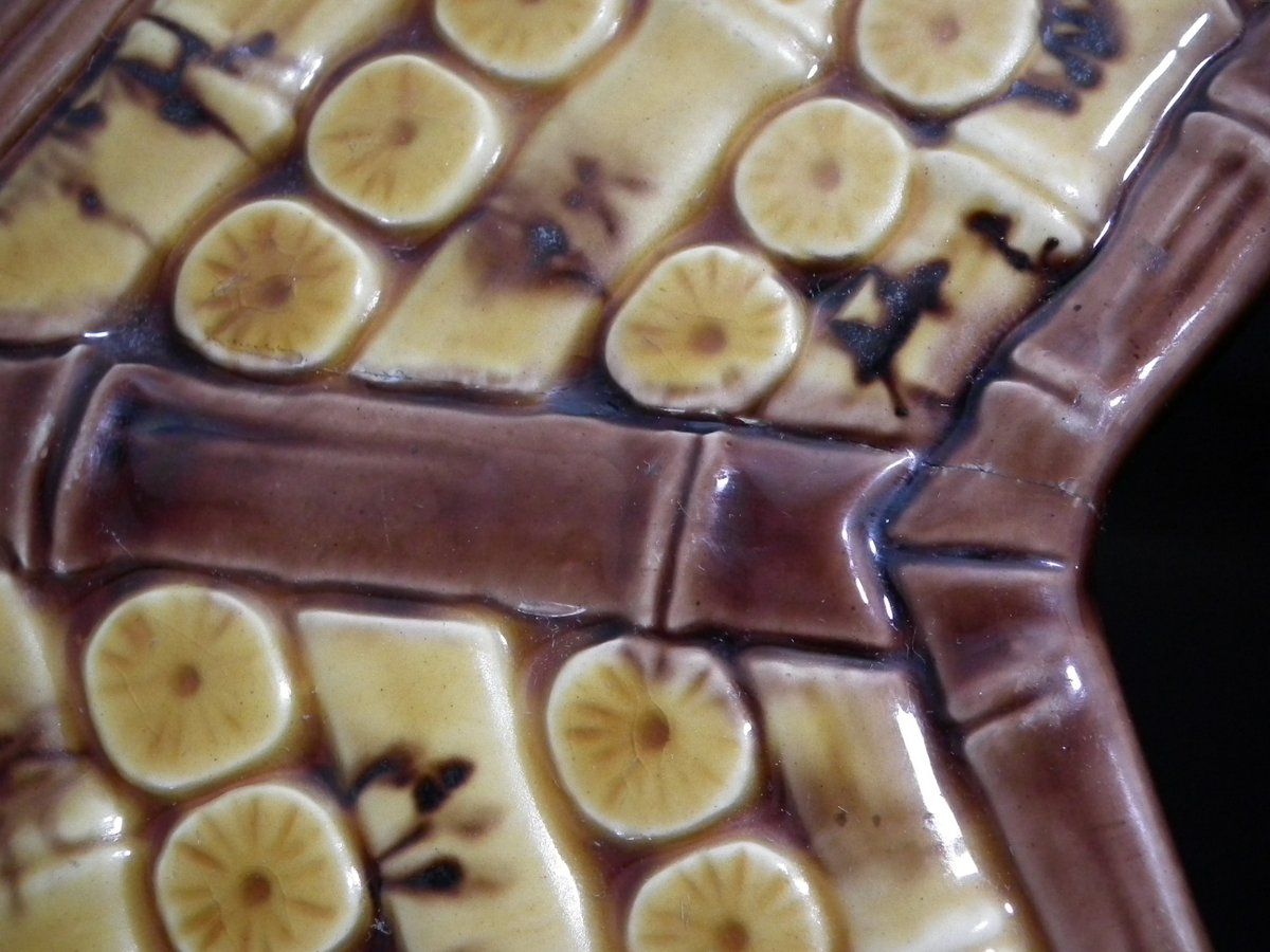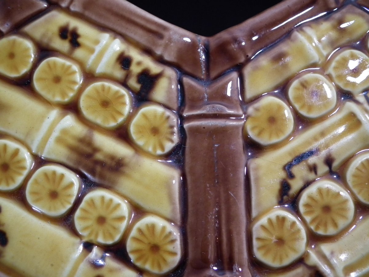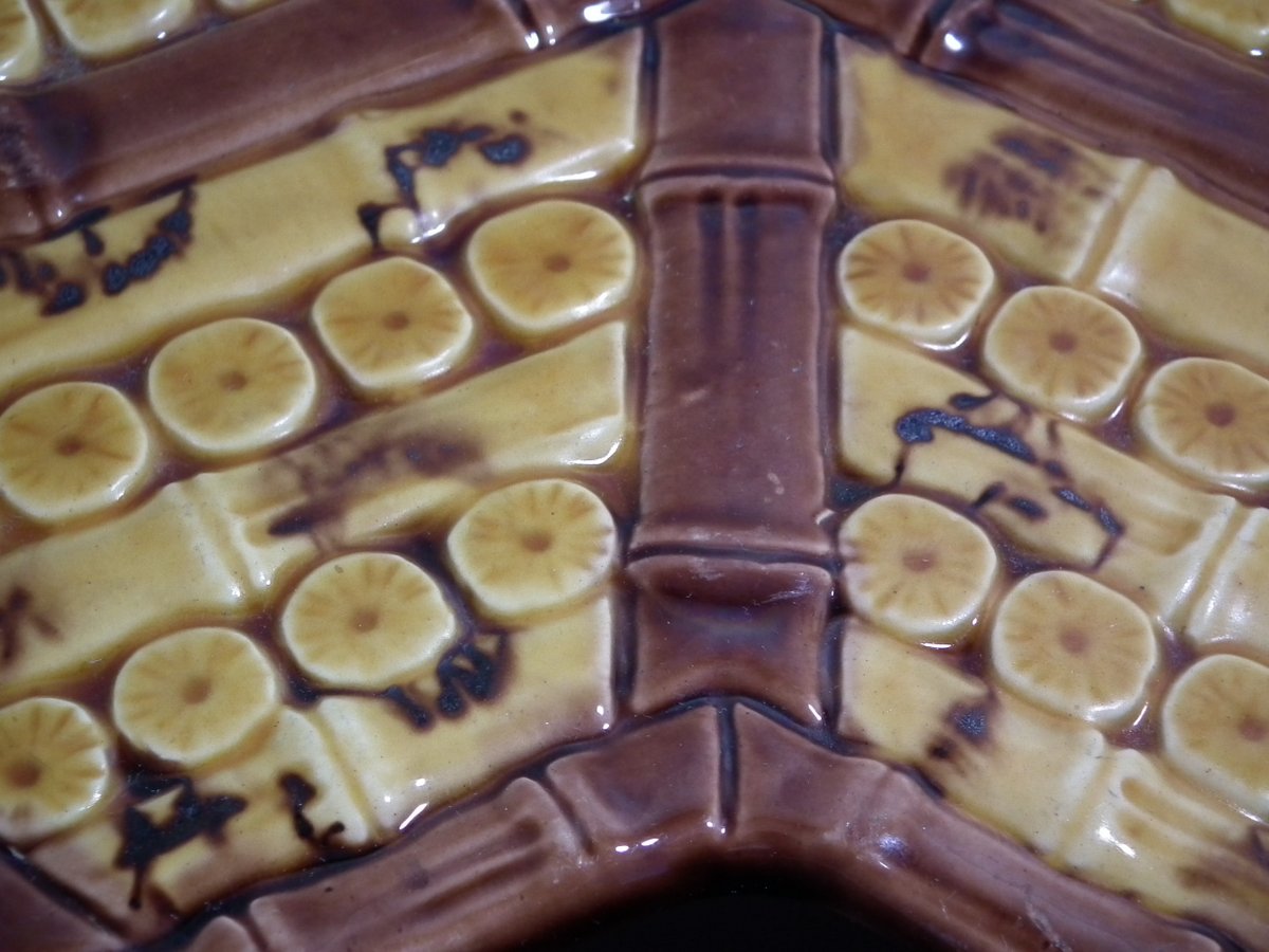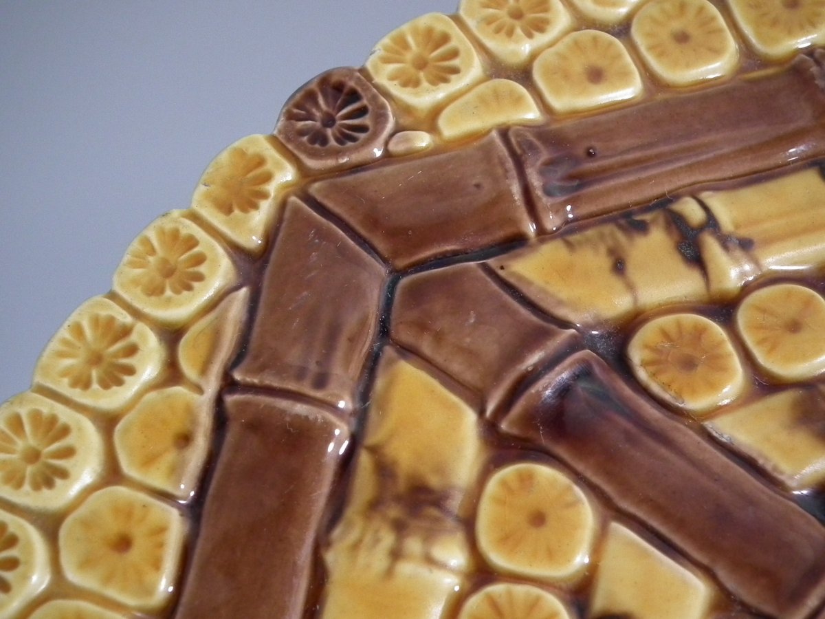 Victorian, circa 1865. 18.5ins high, 13.4ins wide, 13.4ins depth. Minton Majolica garden seat which features a bundle of bamboo tied with decorated blue ribbon.