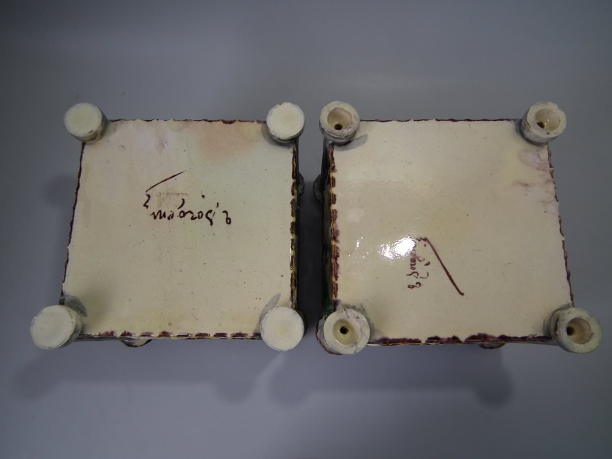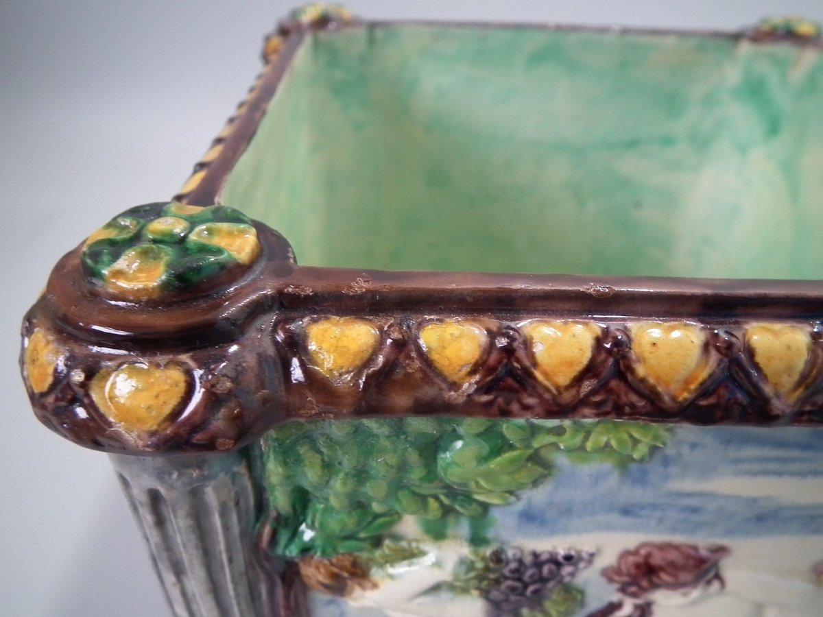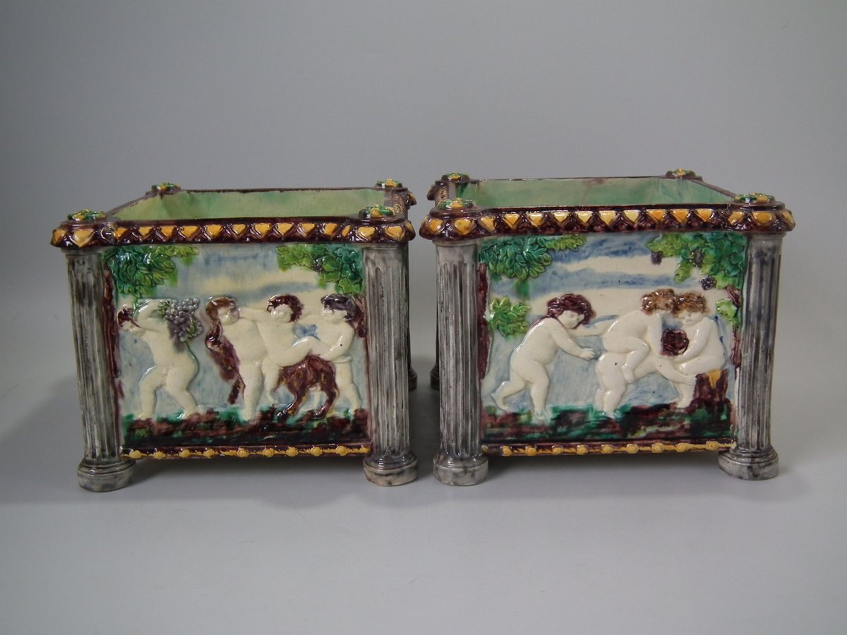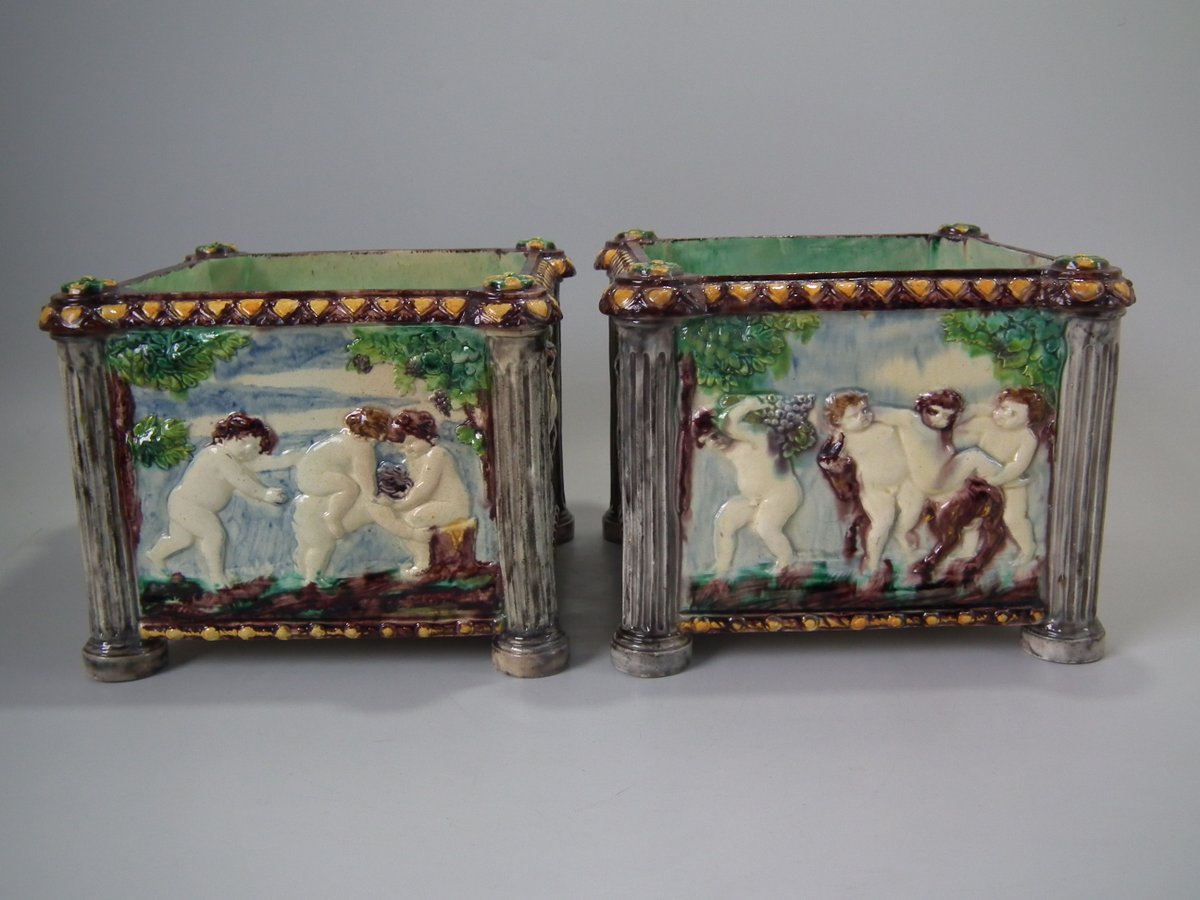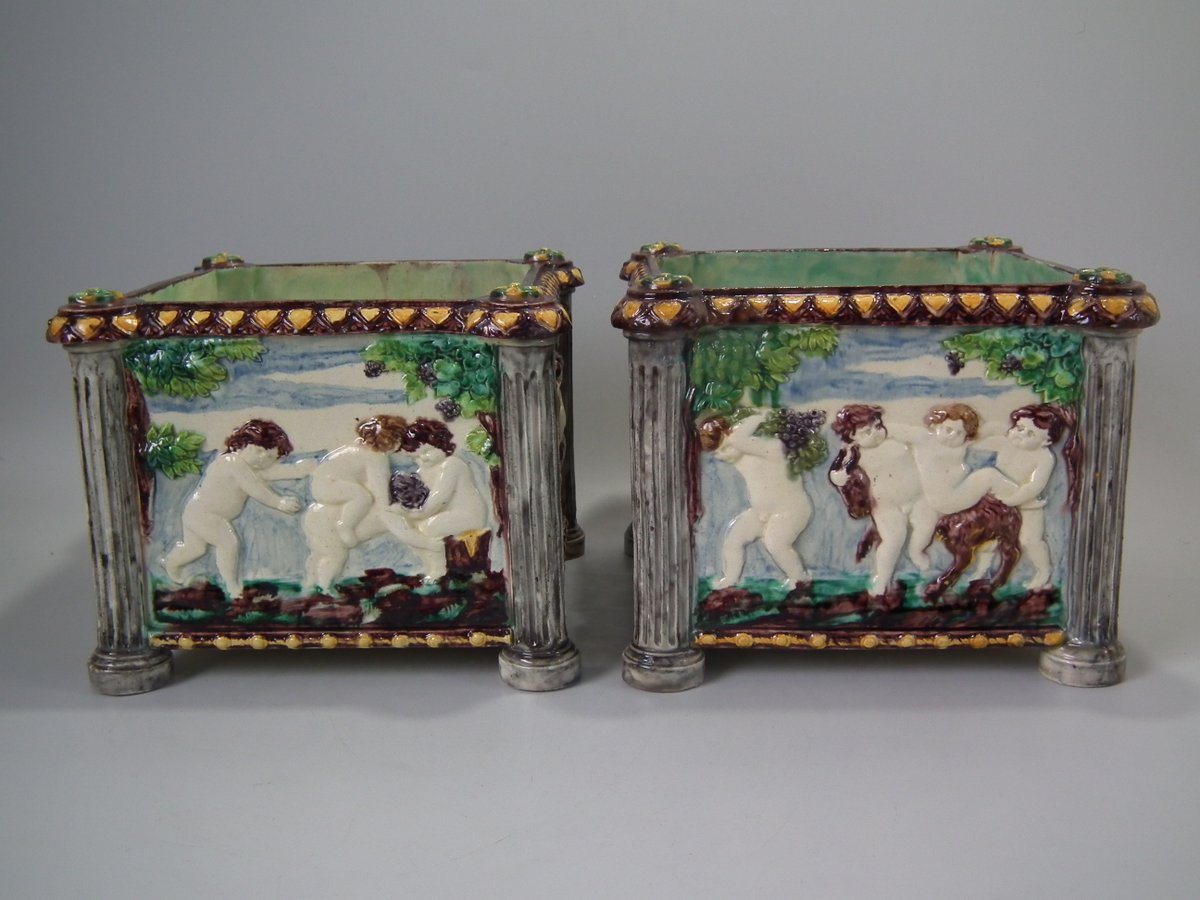 Circa 1880. Tallest is 6.7ins high, 8.7ins wide, 8.7ins depth. Pair of Thomas Sergent Palissy-style Majolica planters with a mythological theme which feature playful scenes of putti picking grapes. Columns on the corners.