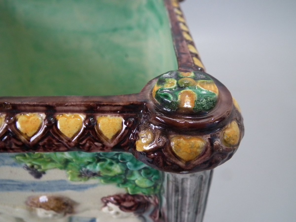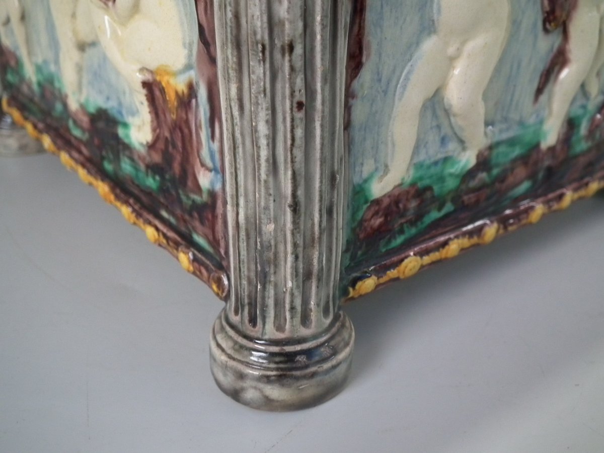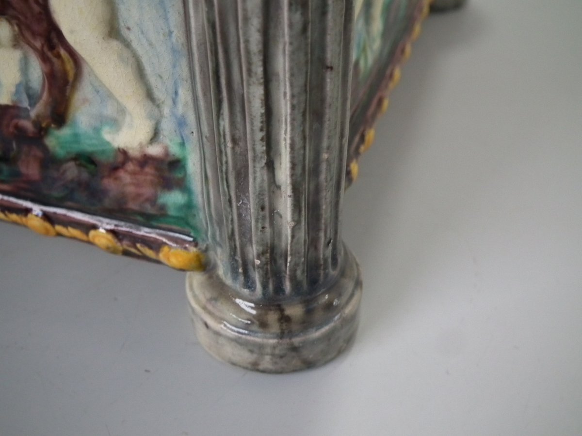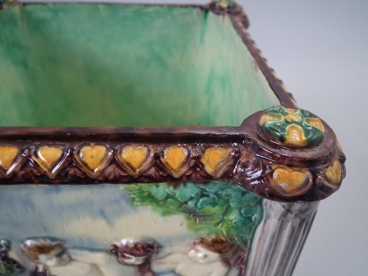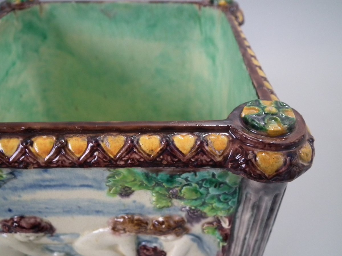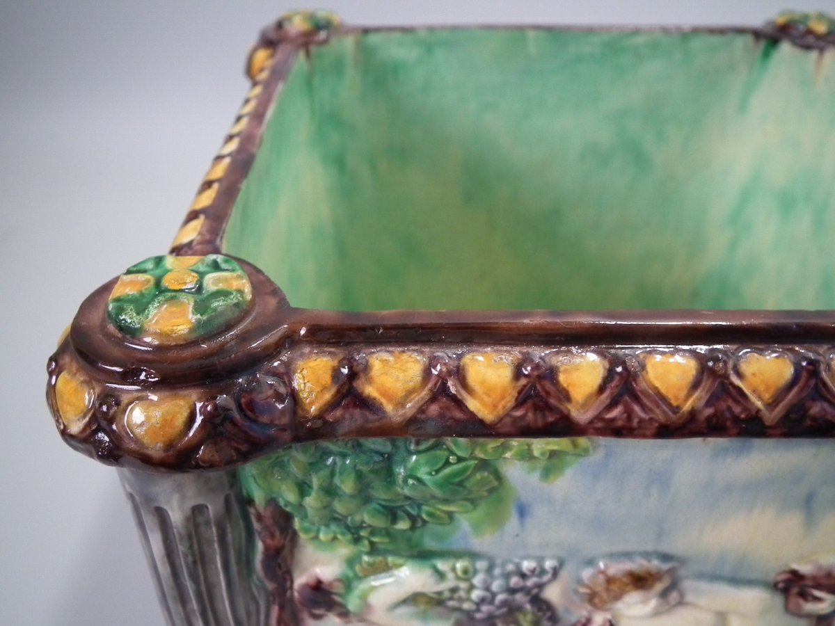 Circa 1880. Tallest is 6.7ins high, 8.7ins wide, 8.7ins depth. Pair of Thomas Sergent Palissy-style Majolica planters with a mythological theme which feature playful scenes of putti picking grapes. Columns on the corners.