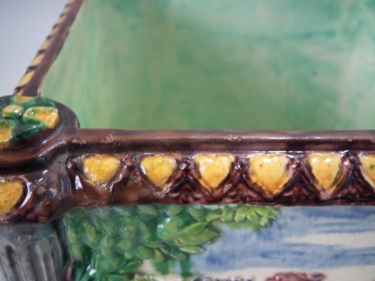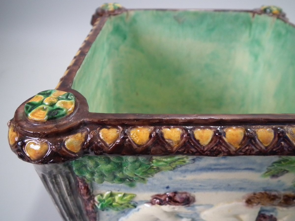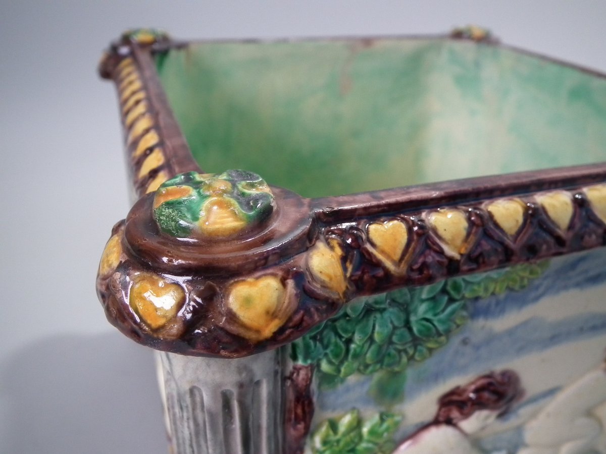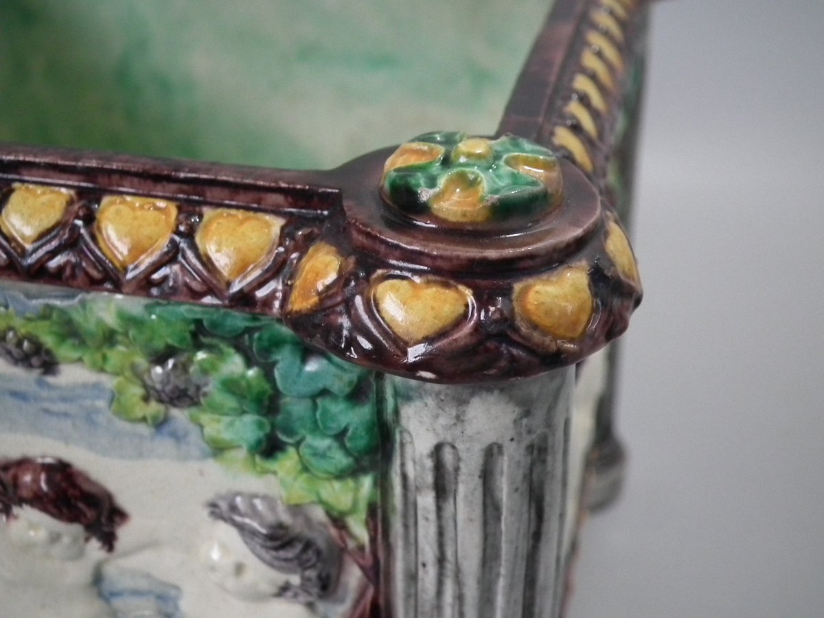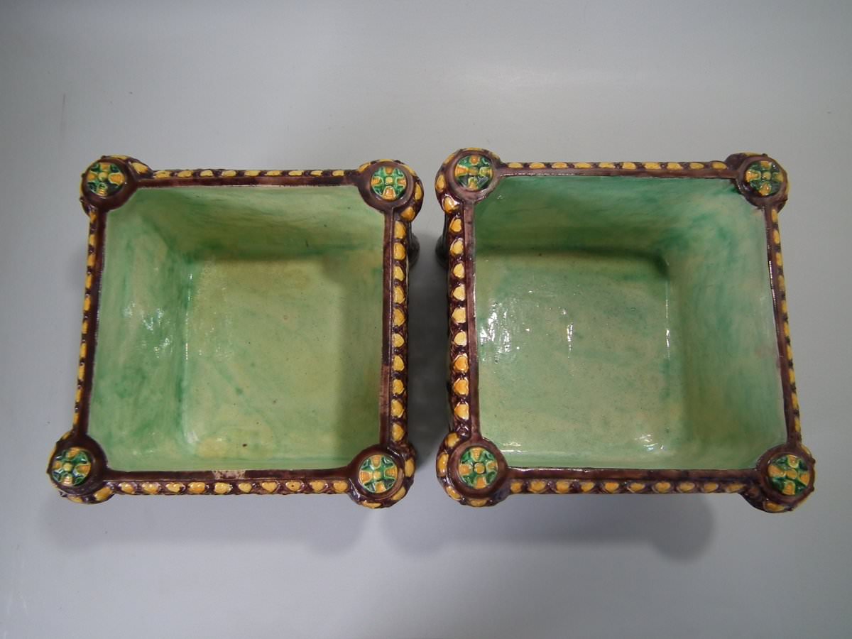 Circa 1880. Tallest is 6.7ins high, 8.7ins wide, 8.7ins depth. Pair of Thomas Sergent Palissy-style Majolica planters with a mythological theme which feature playful scenes of putti picking grapes. Columns on the corners.