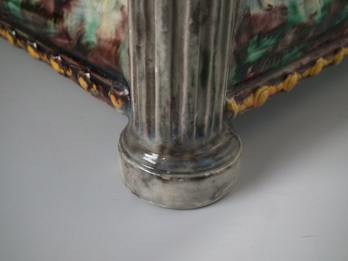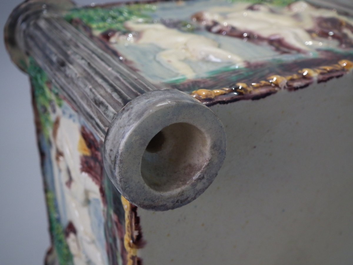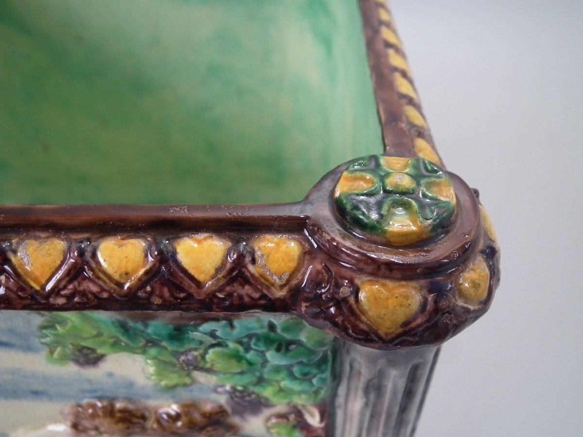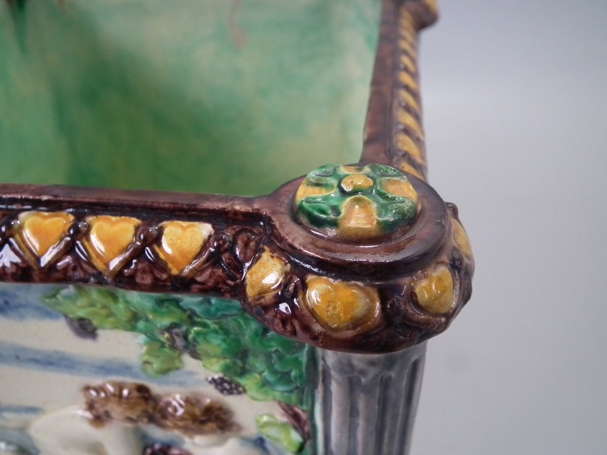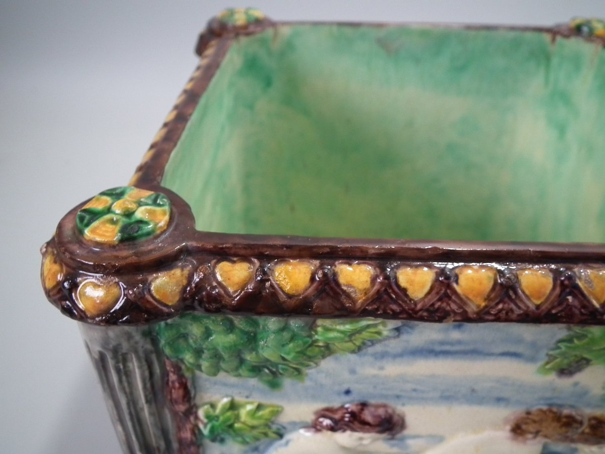 Circa 1880. Tallest is 6.7ins high, 8.7ins wide, 8.7ins depth. Pair of Thomas Sergent Palissy-style Majolica planters with a mythological theme which feature playful scenes of putti picking grapes. Columns on the corners.