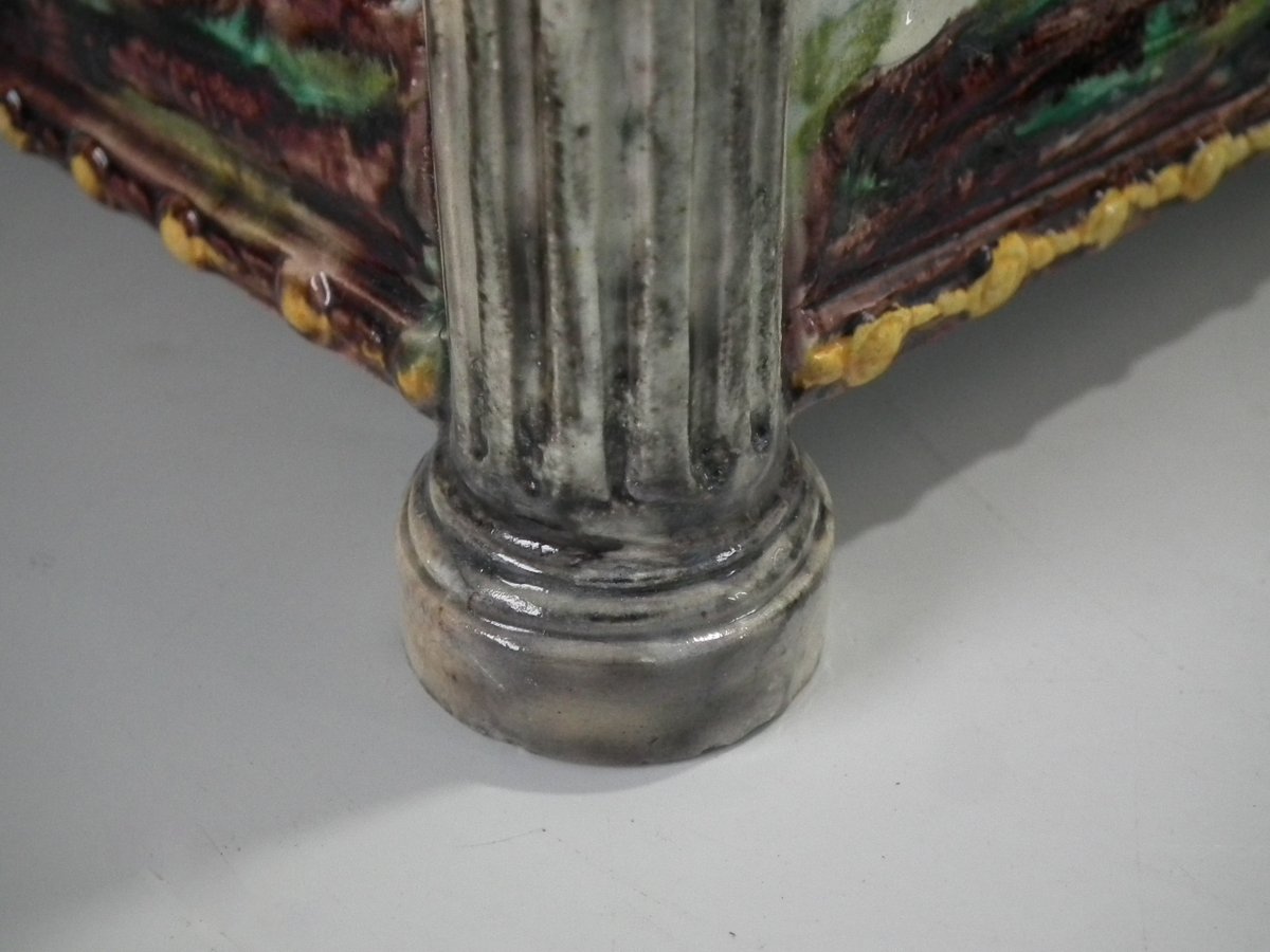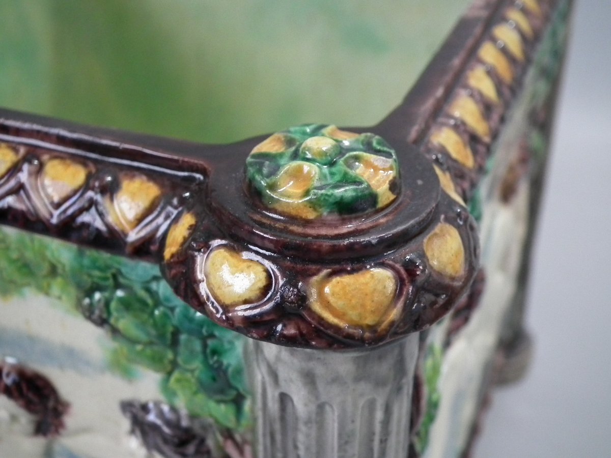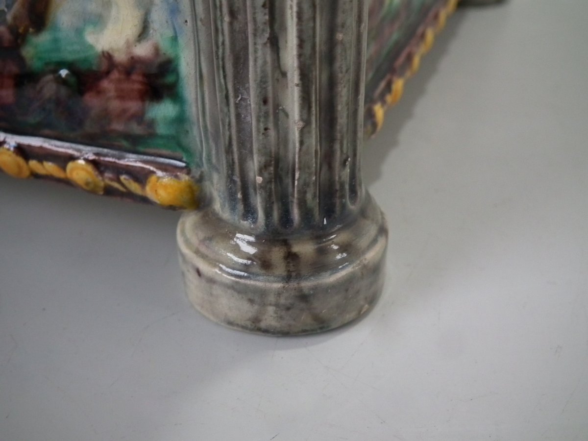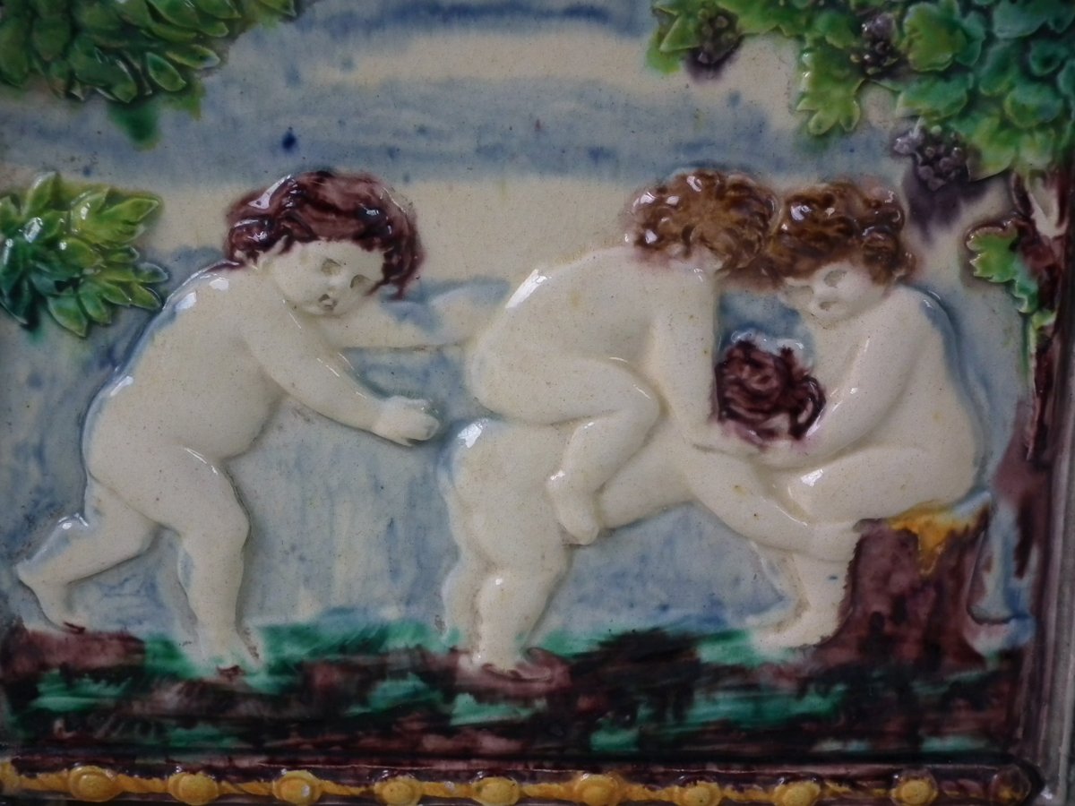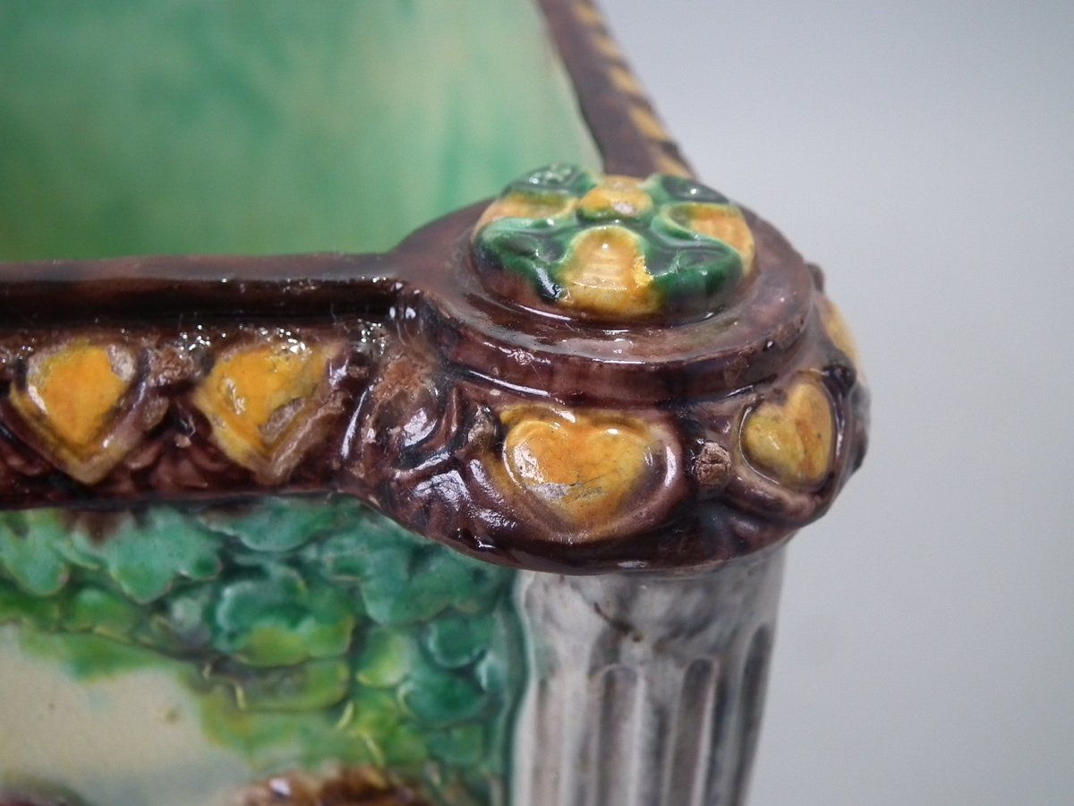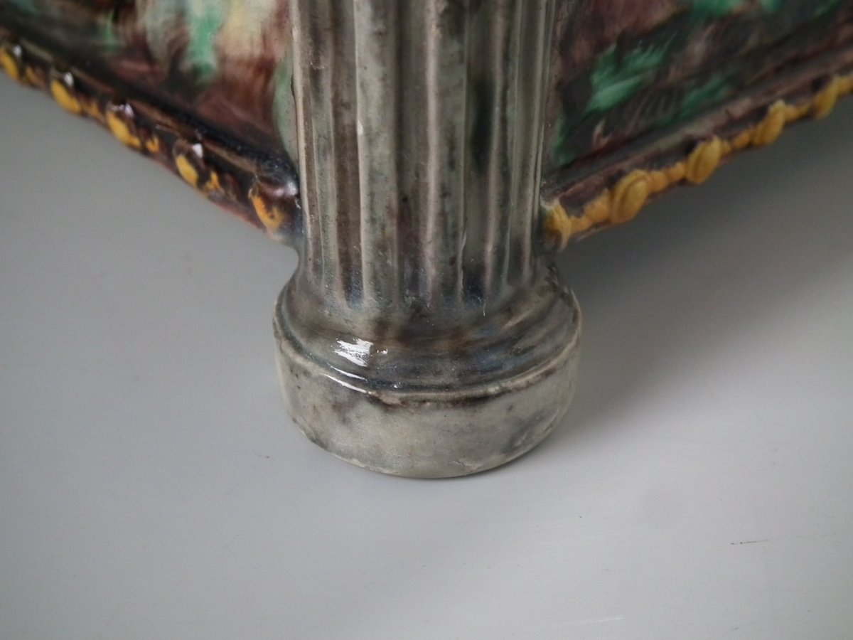 Circa 1880. Tallest is 6.7ins high, 8.7ins wide, 8.7ins depth. Pair of Thomas Sergent Palissy-style Majolica planters with a mythological theme which feature playful scenes of putti picking grapes. Columns on the corners.