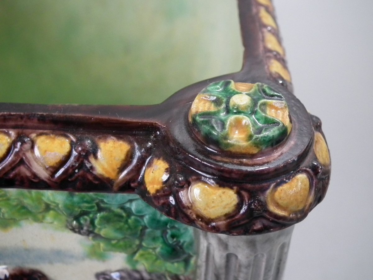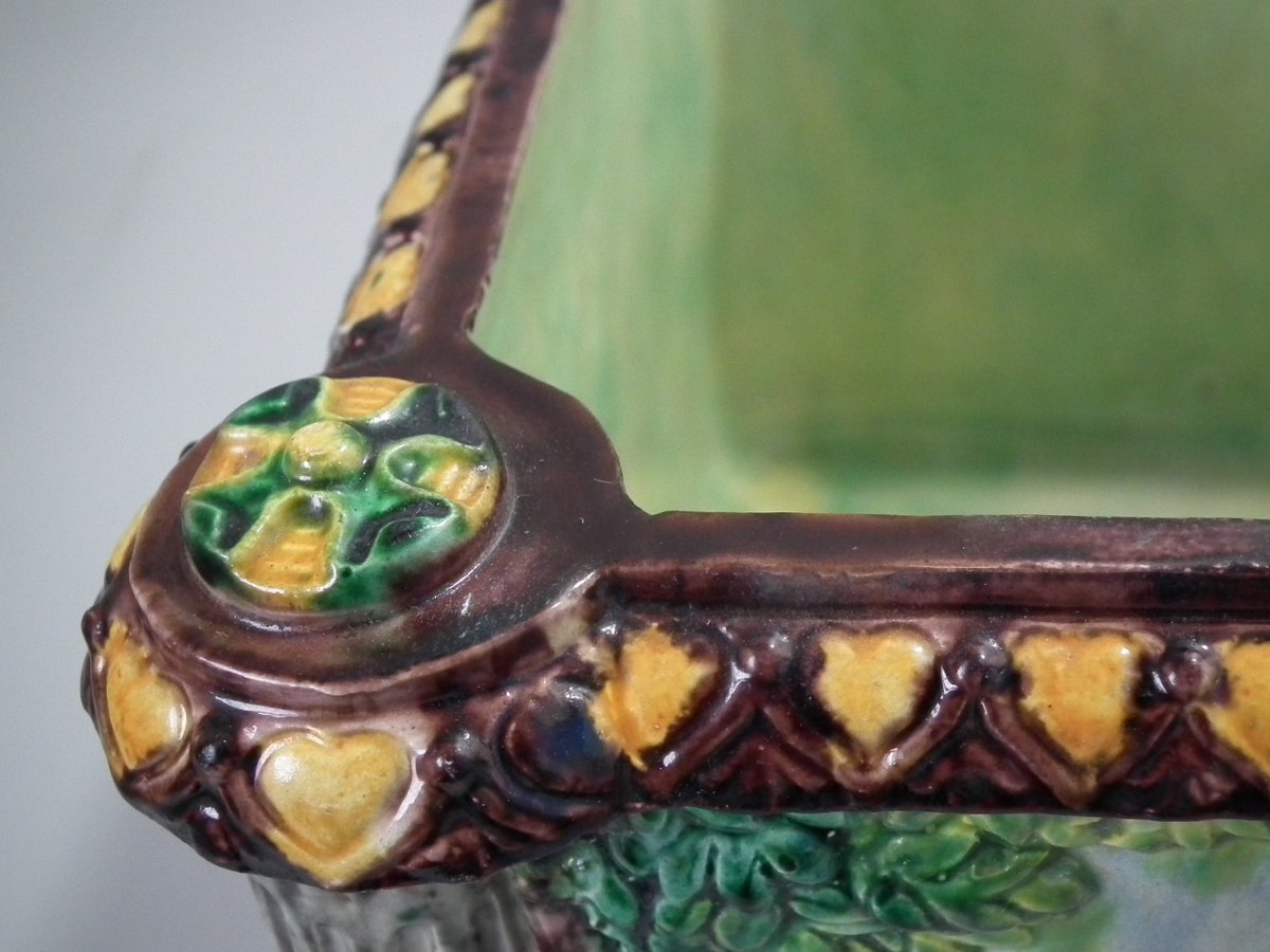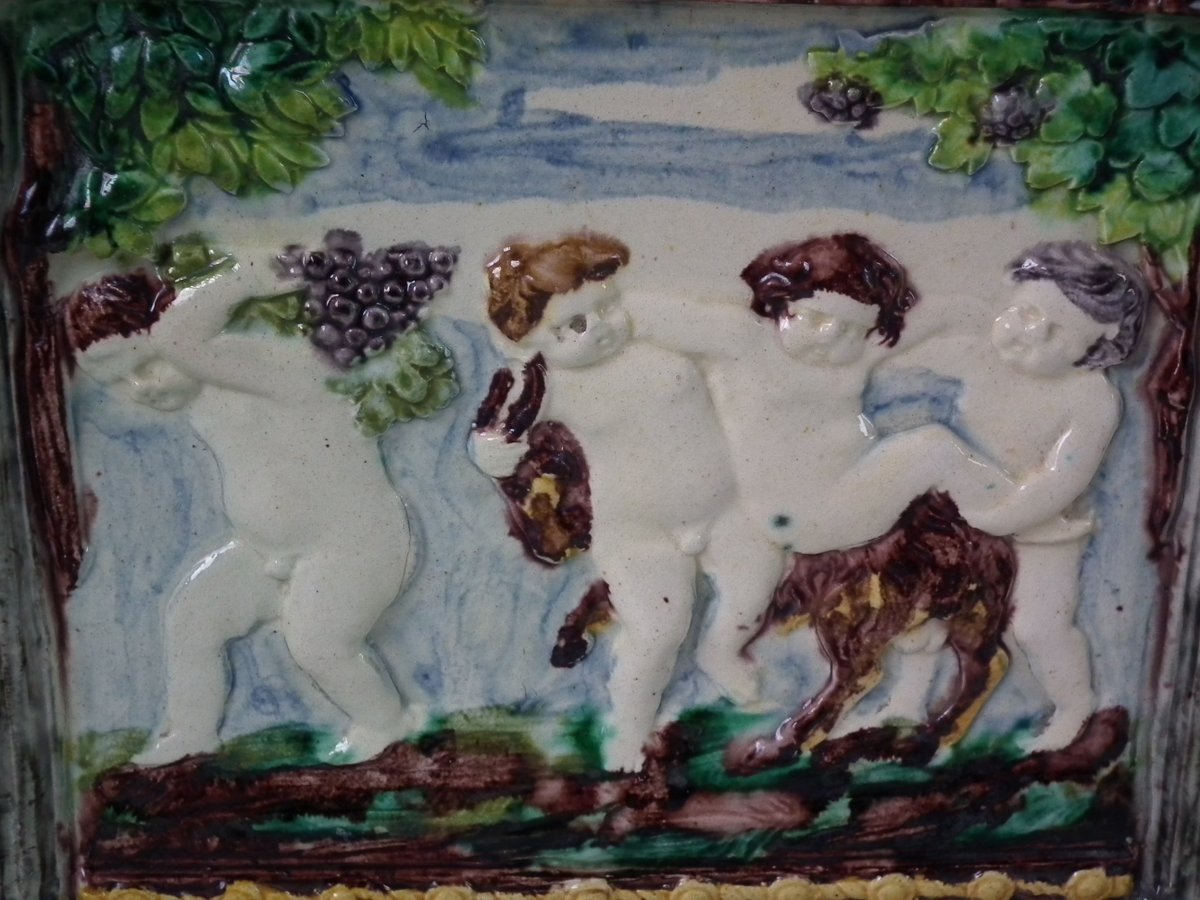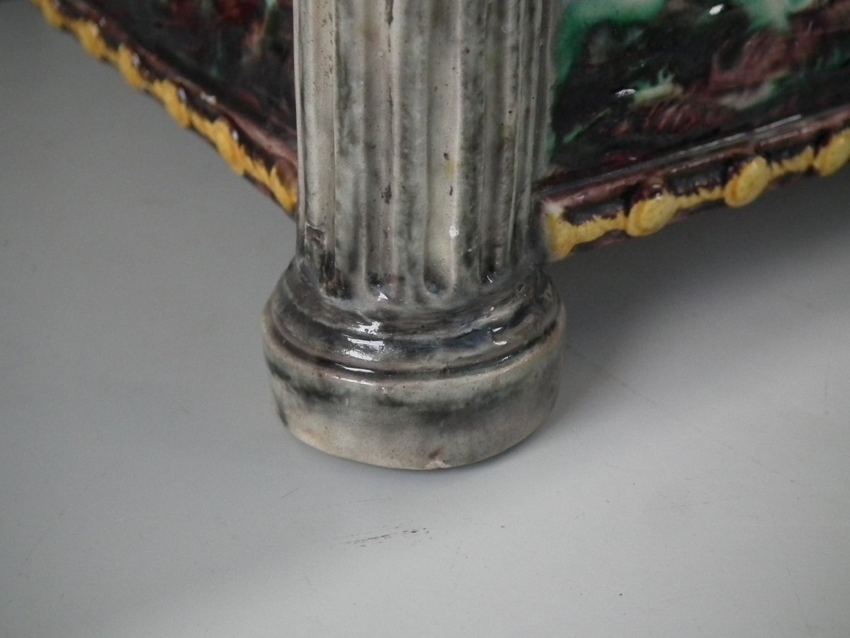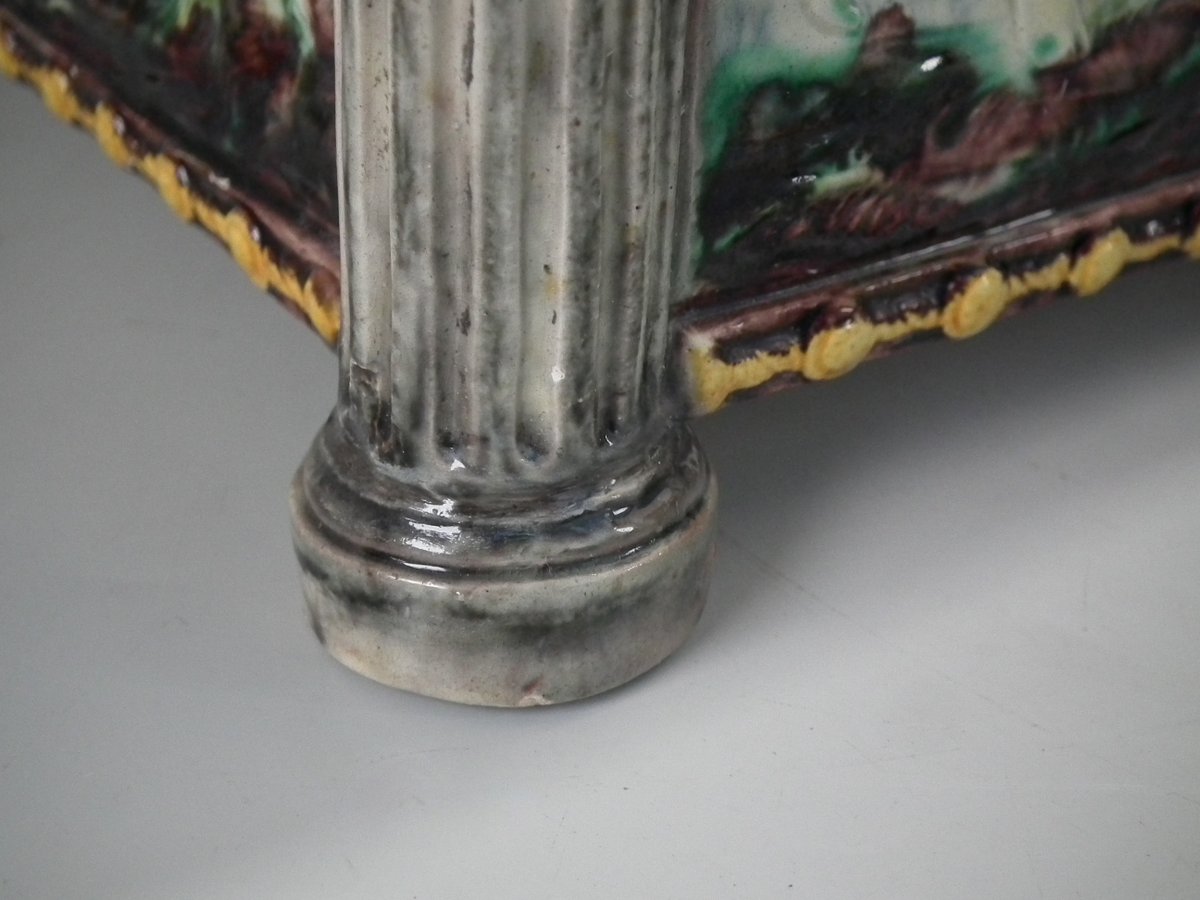 Circa 1880. Tallest is 6.7ins high, 8.7ins wide, 8.7ins depth. Pair of Thomas Sergent Palissy-style Majolica planters with a mythological theme which feature playful scenes of putti picking grapes. Columns on the corners.