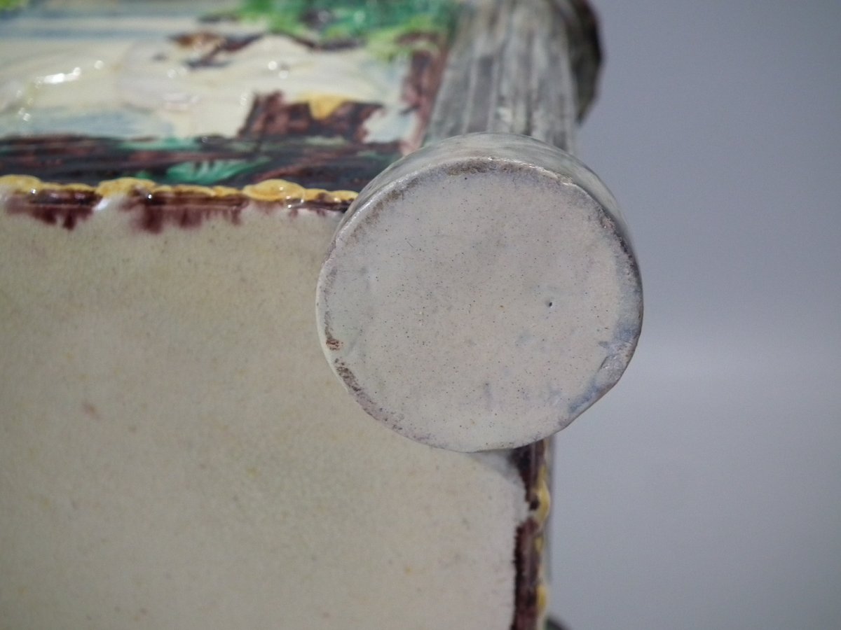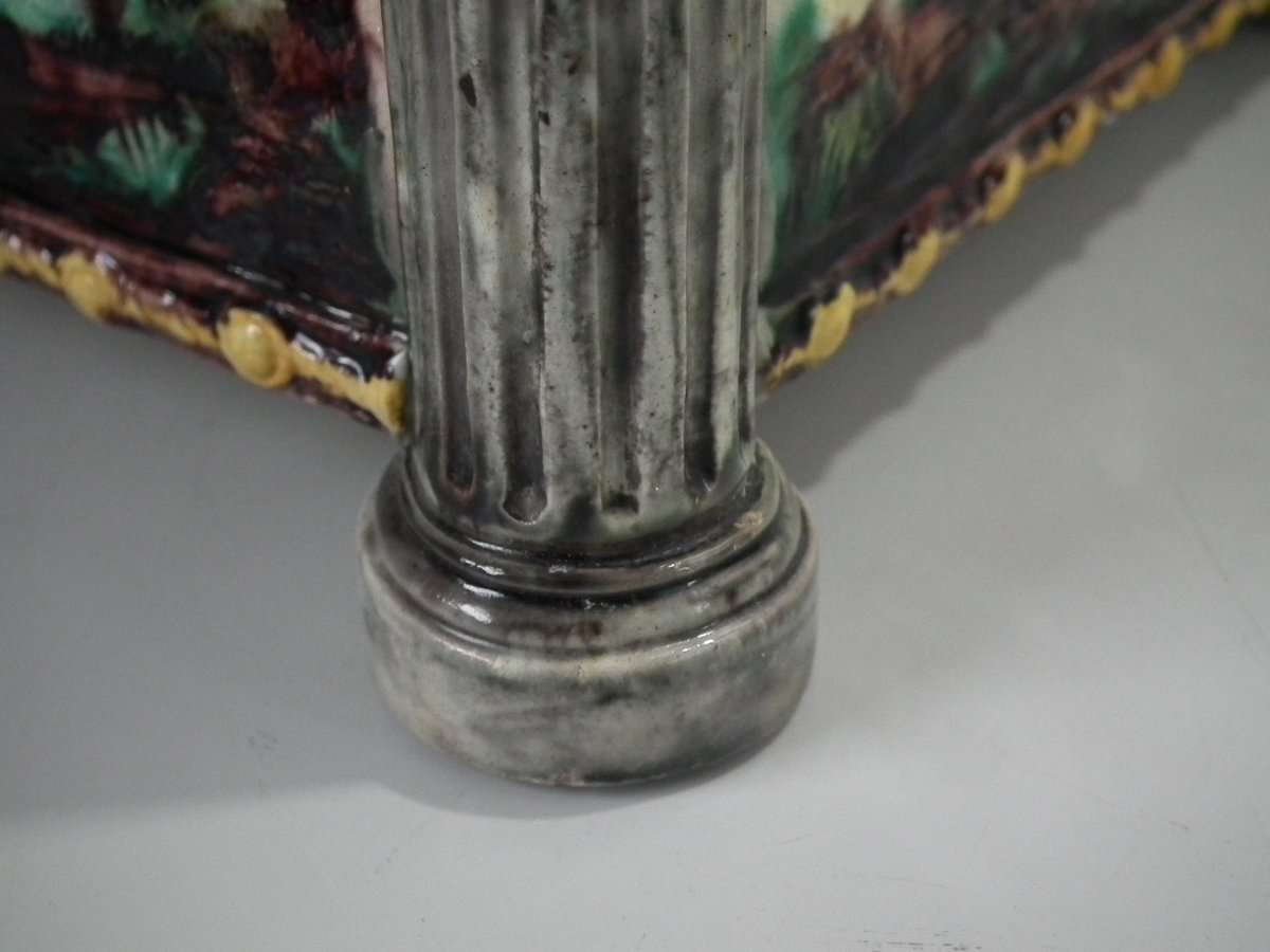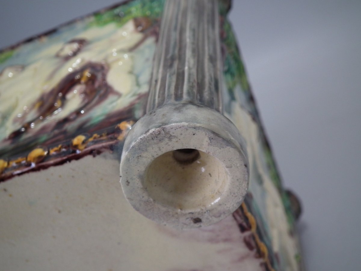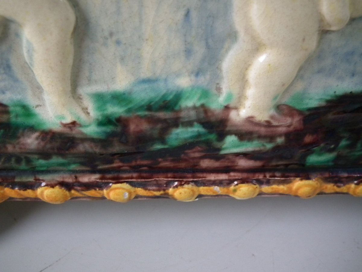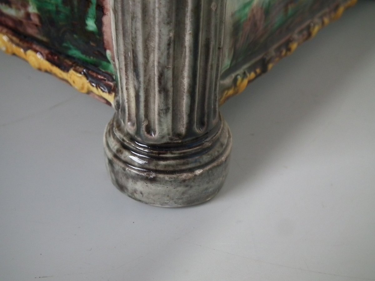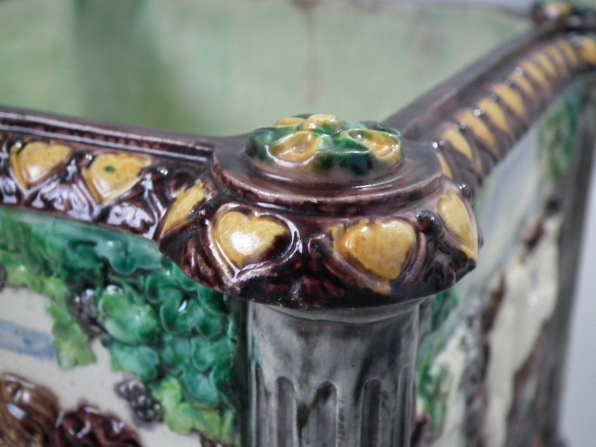 Circa 1880. Tallest is 6.7ins high, 8.7ins wide, 8.7ins depth. Pair of Thomas Sergent Palissy-style Majolica planters with a mythological theme which feature playful scenes of putti picking grapes. Columns on the corners.