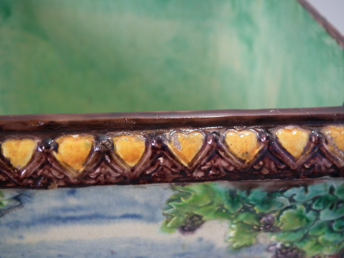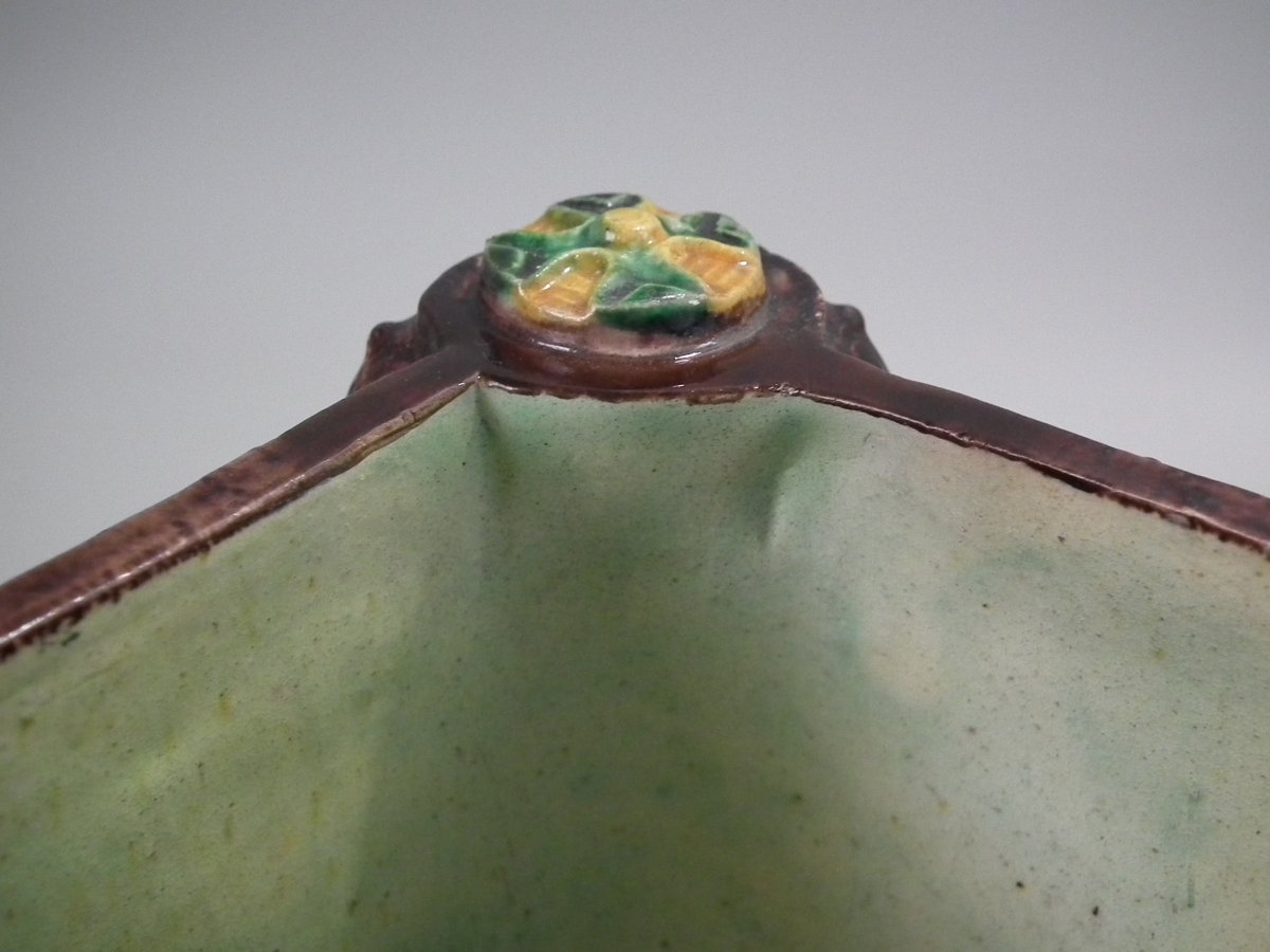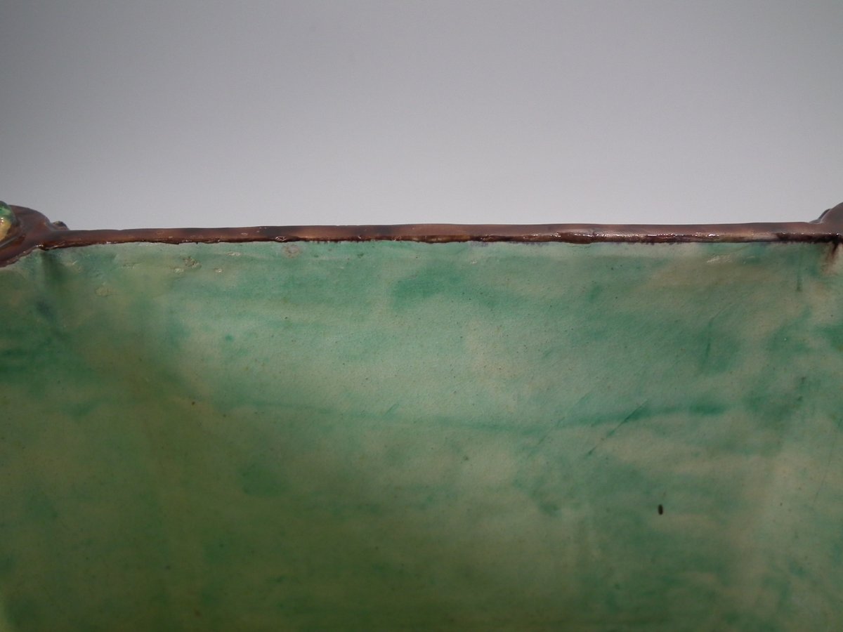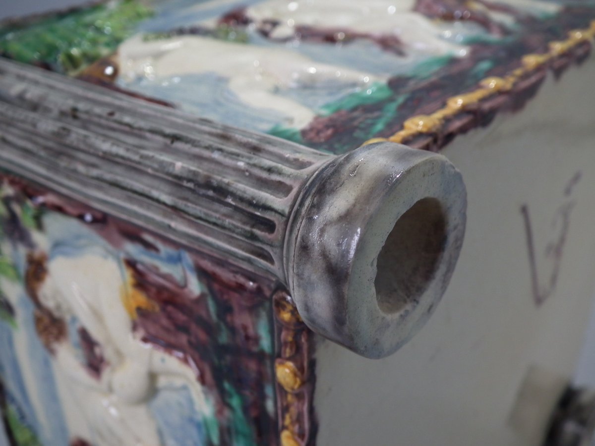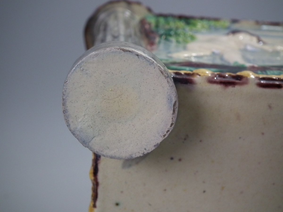 Circa 1880. Tallest is 6.7ins high, 8.7ins wide, 8.7ins depth. Pair of Thomas Sergent Palissy-style Majolica planters with a mythological theme which feature playful scenes of putti picking grapes. Columns on the corners.