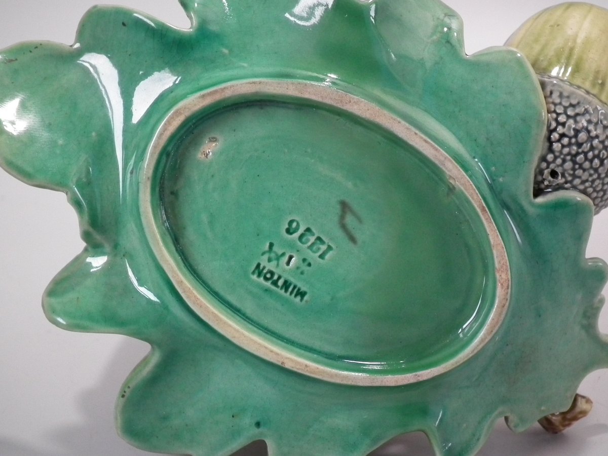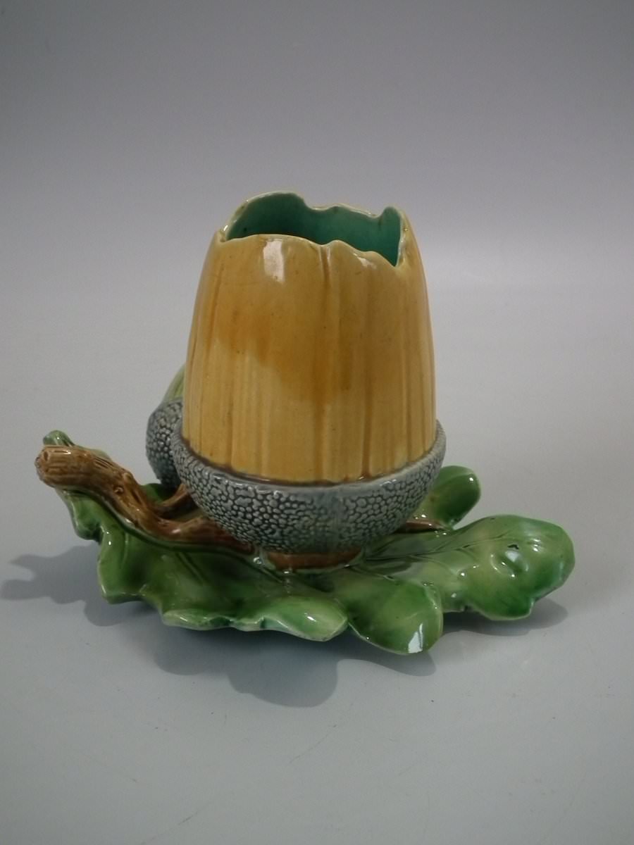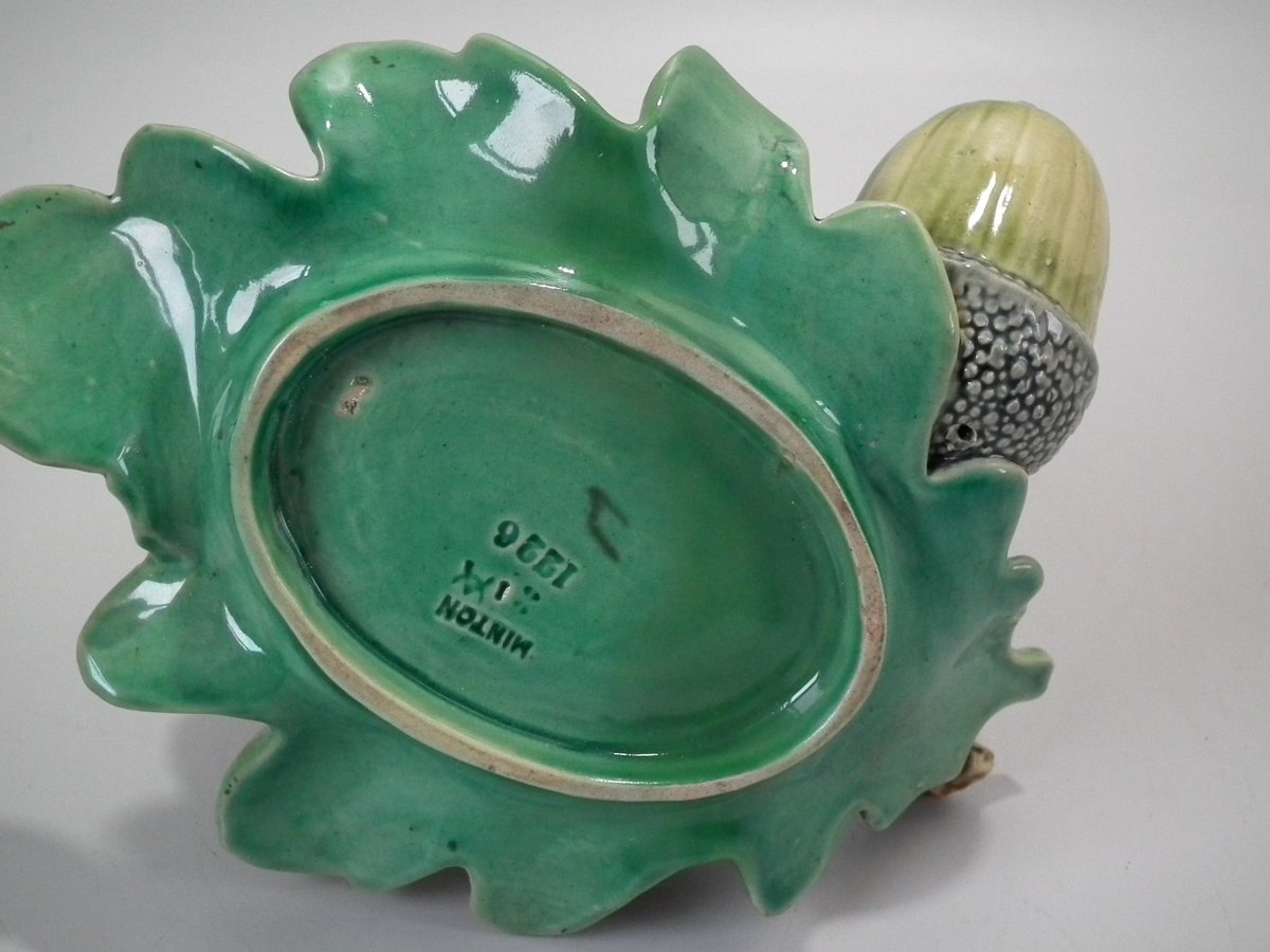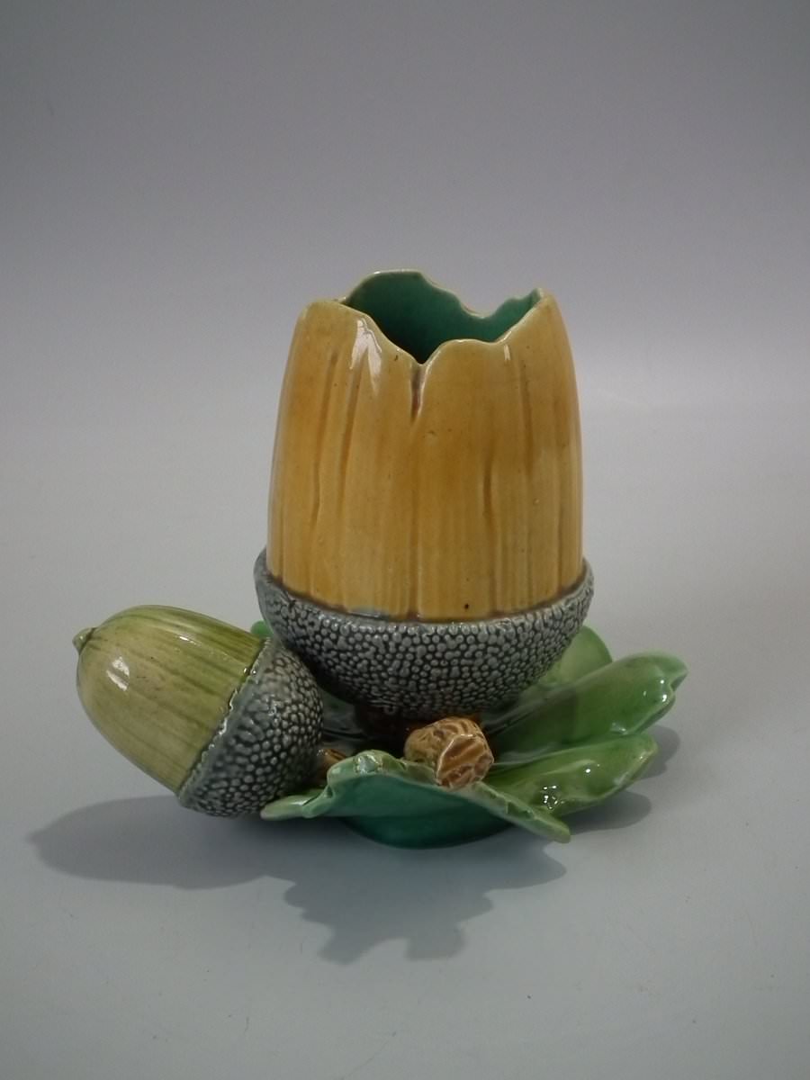 Victorian, circa 1867. 4.9ins high, 6.3ins wide, 5.7ins depth. Minton Majolica vase which features acorns & oak leaves.