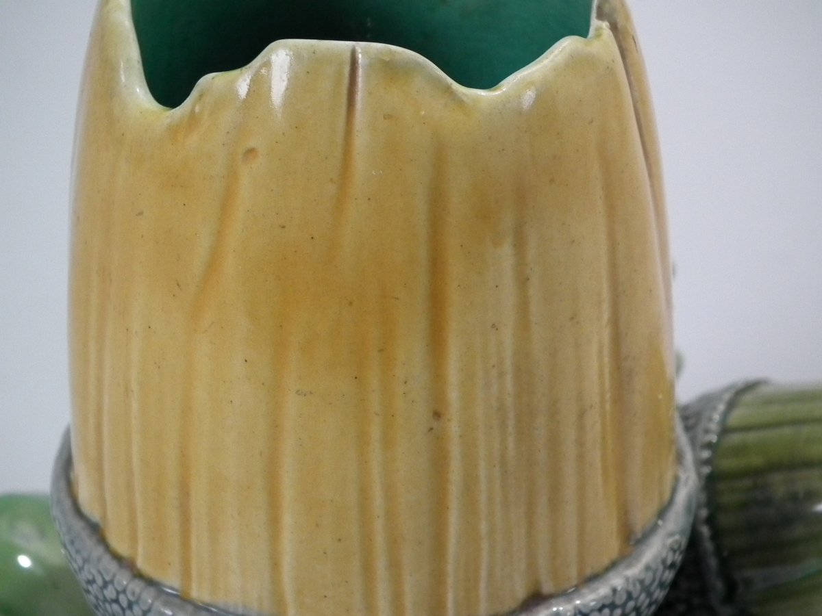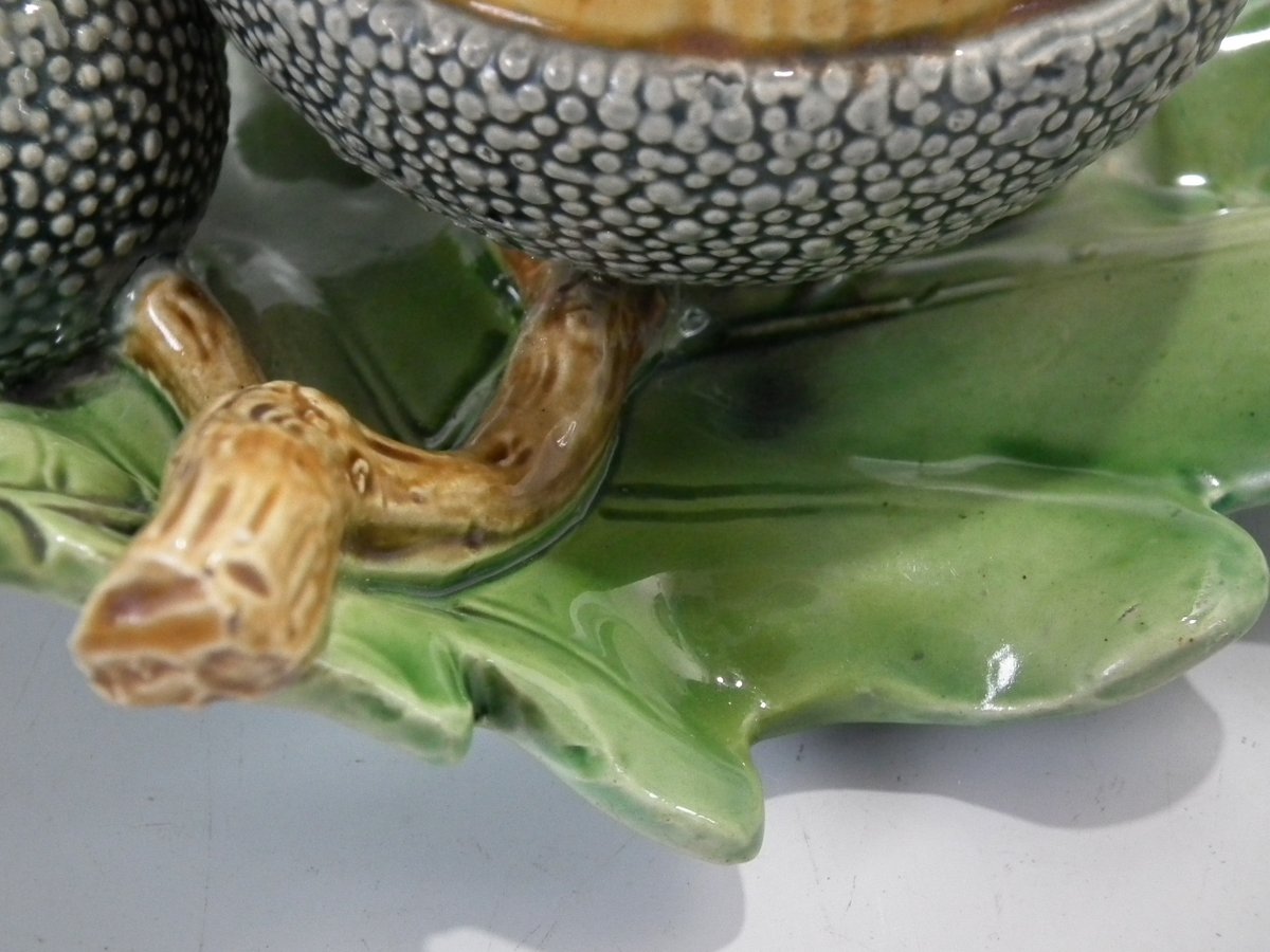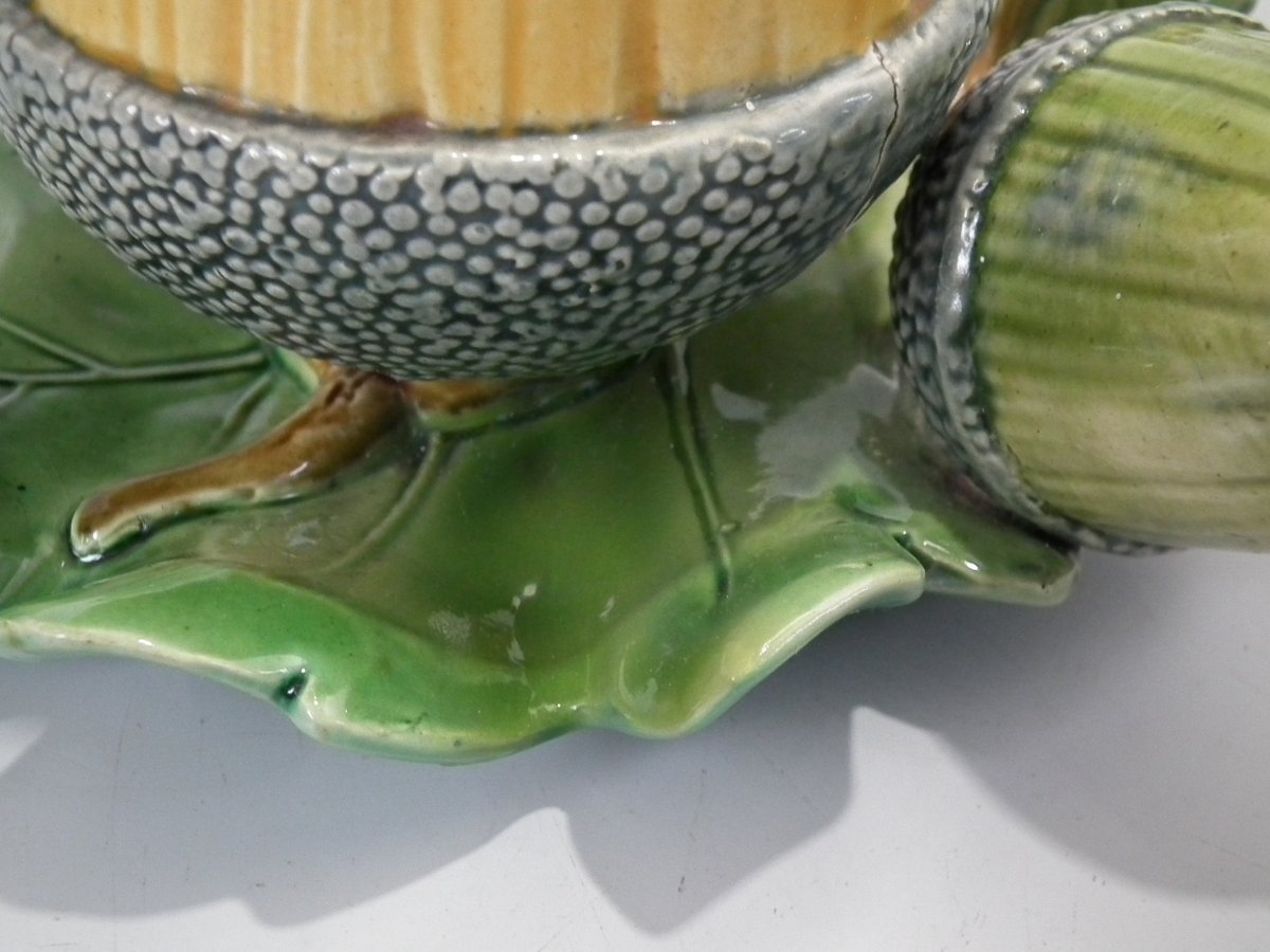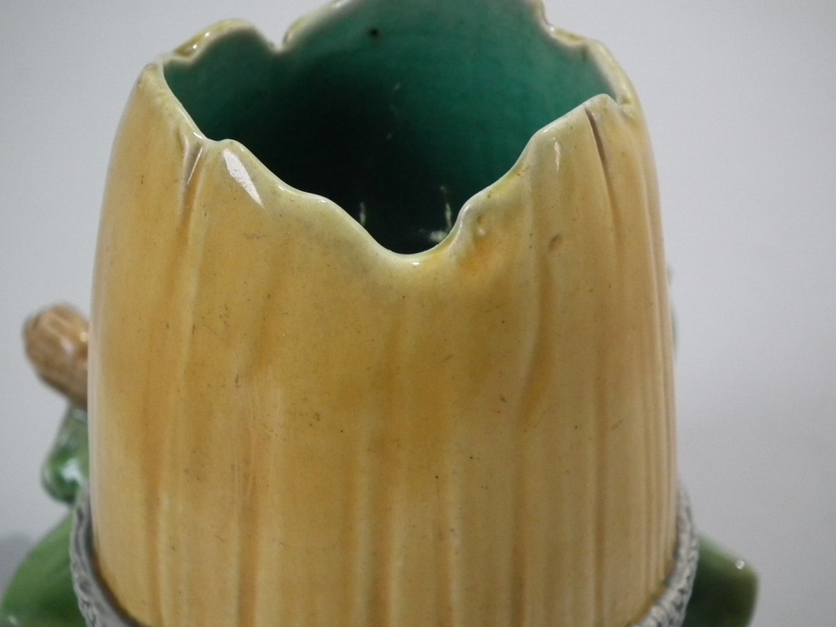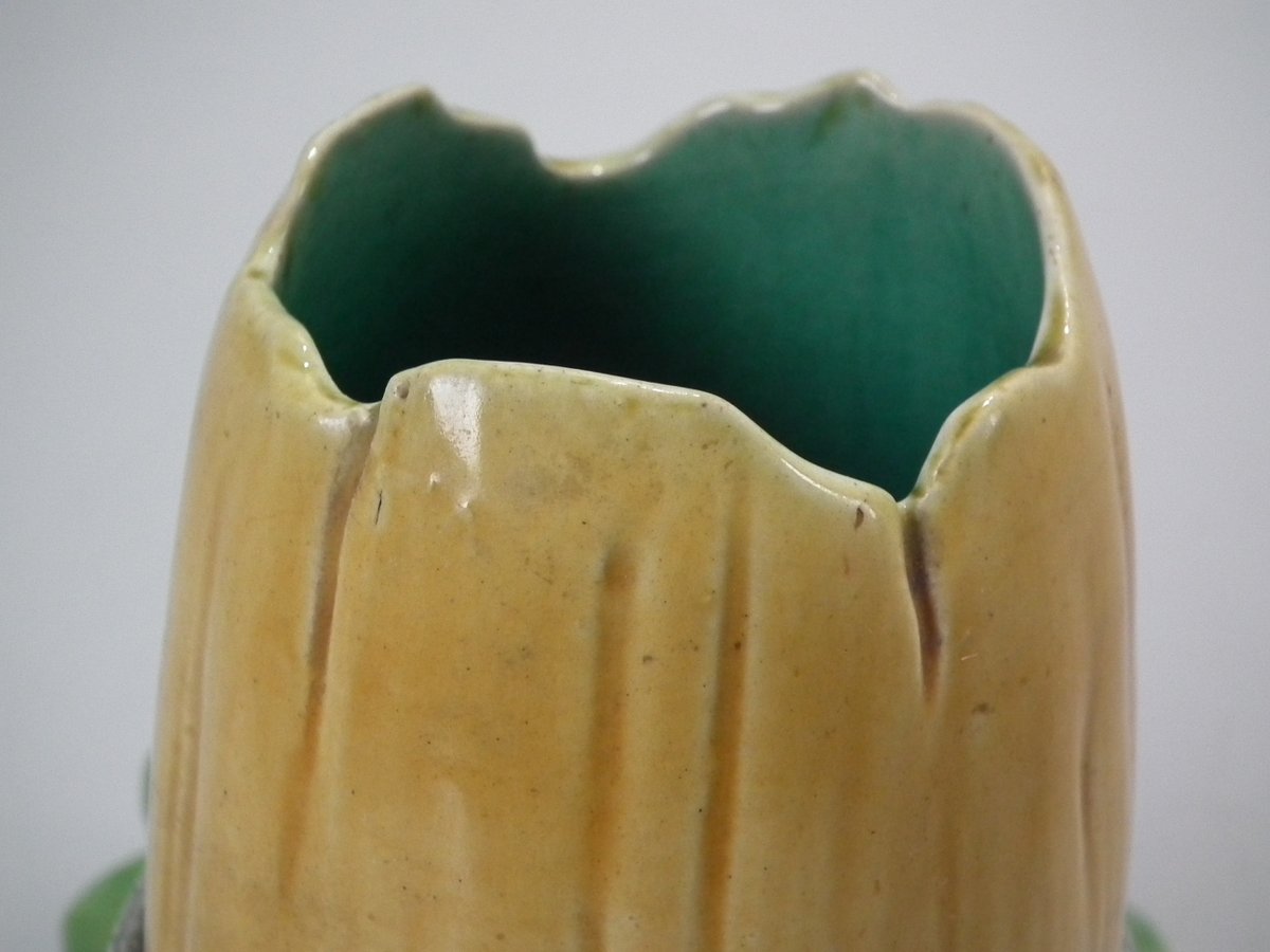 Victorian, circa 1867. 4.9ins high, 6.3ins wide, 5.7ins depth. Minton Majolica vase which features acorns & oak leaves.