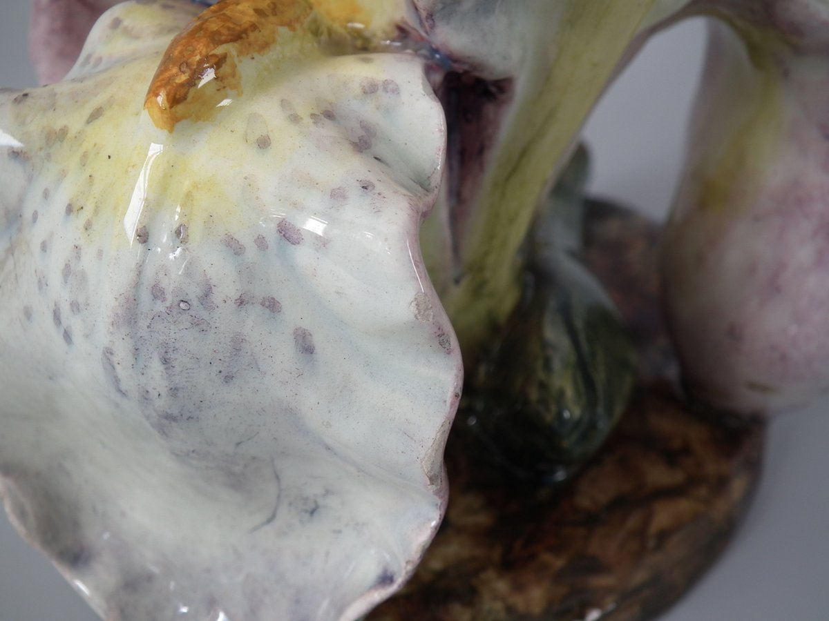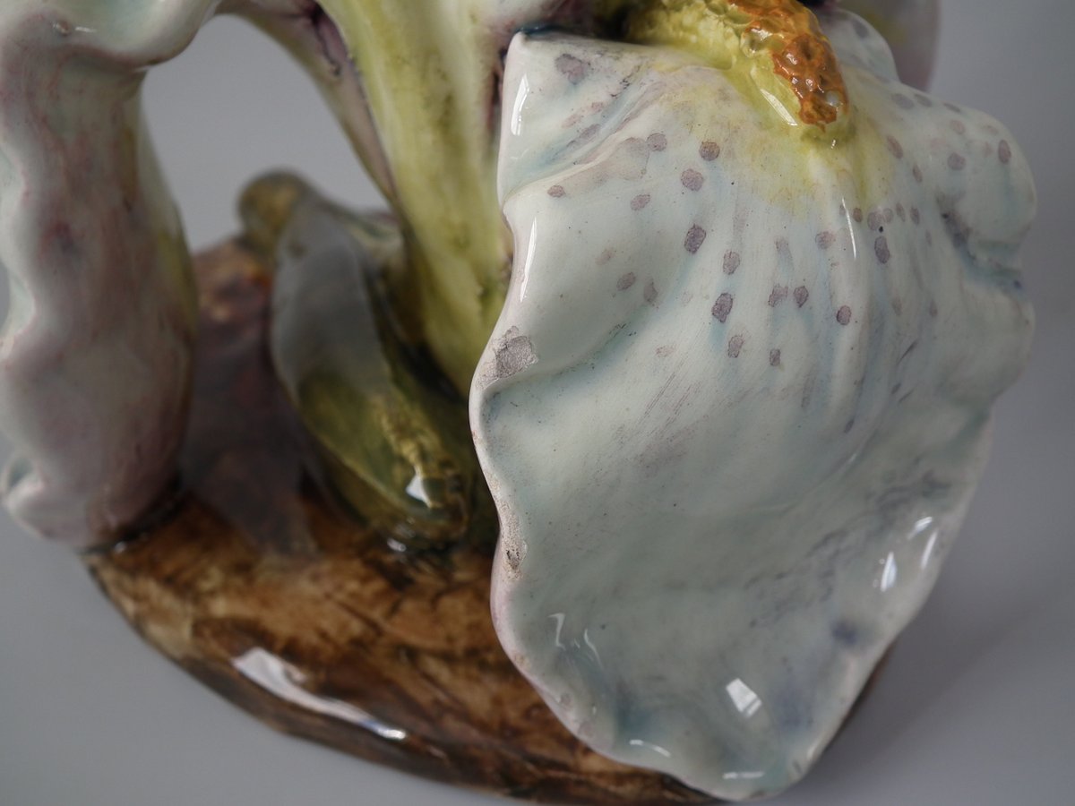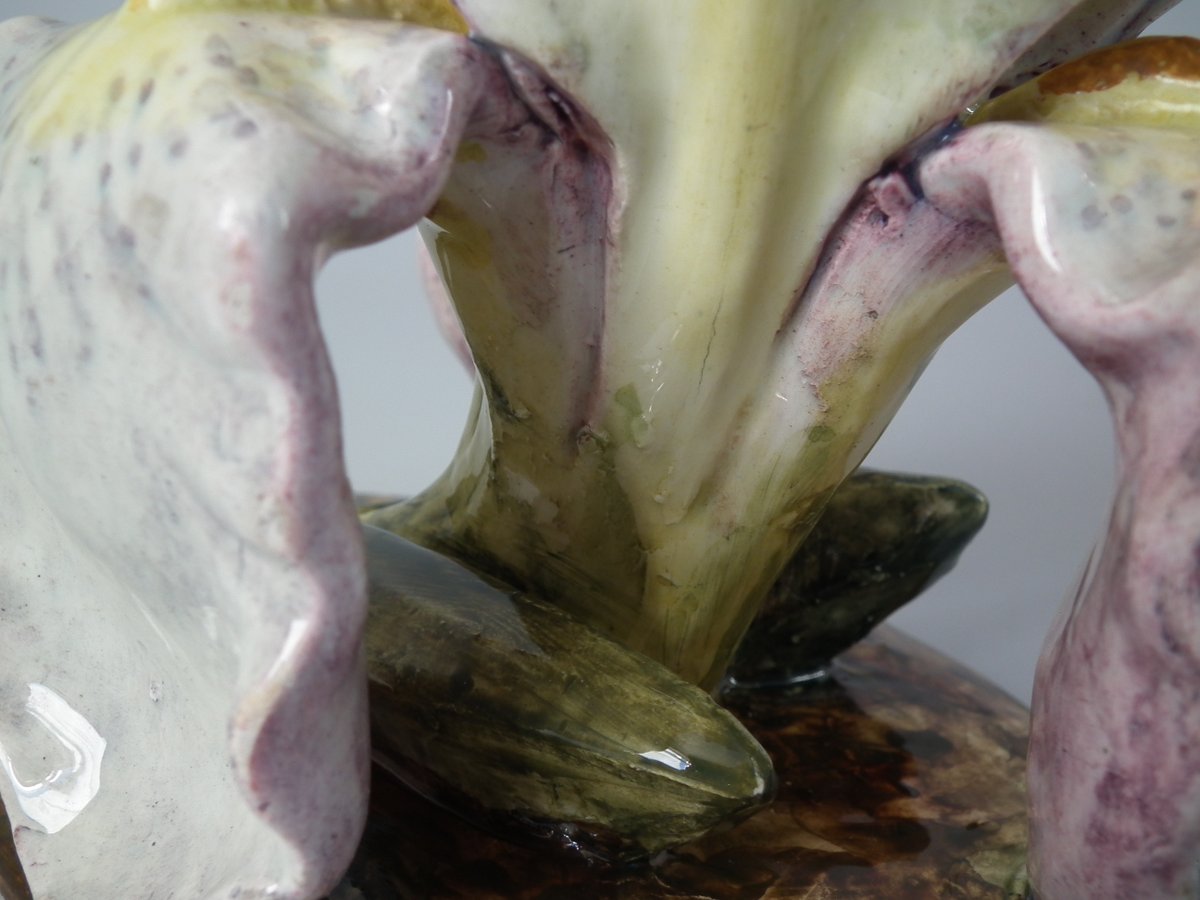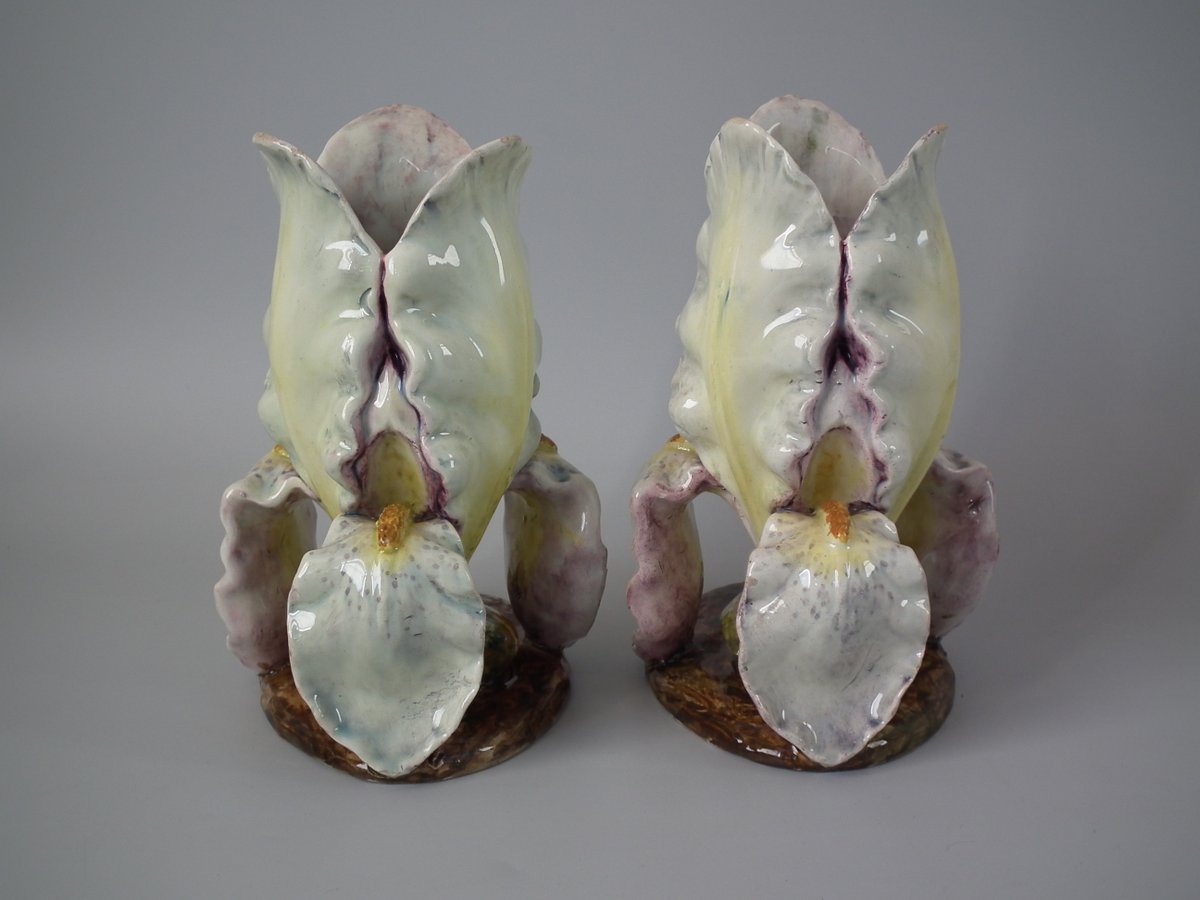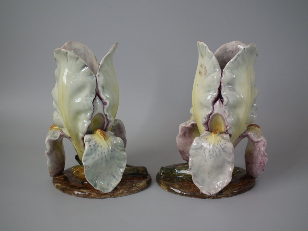 Victorian, circa 1900. Tallest is 8.5ins high, 6.3ins wide, 5.1ins depth. Pair of French Majolica vases which feature iris flowers.