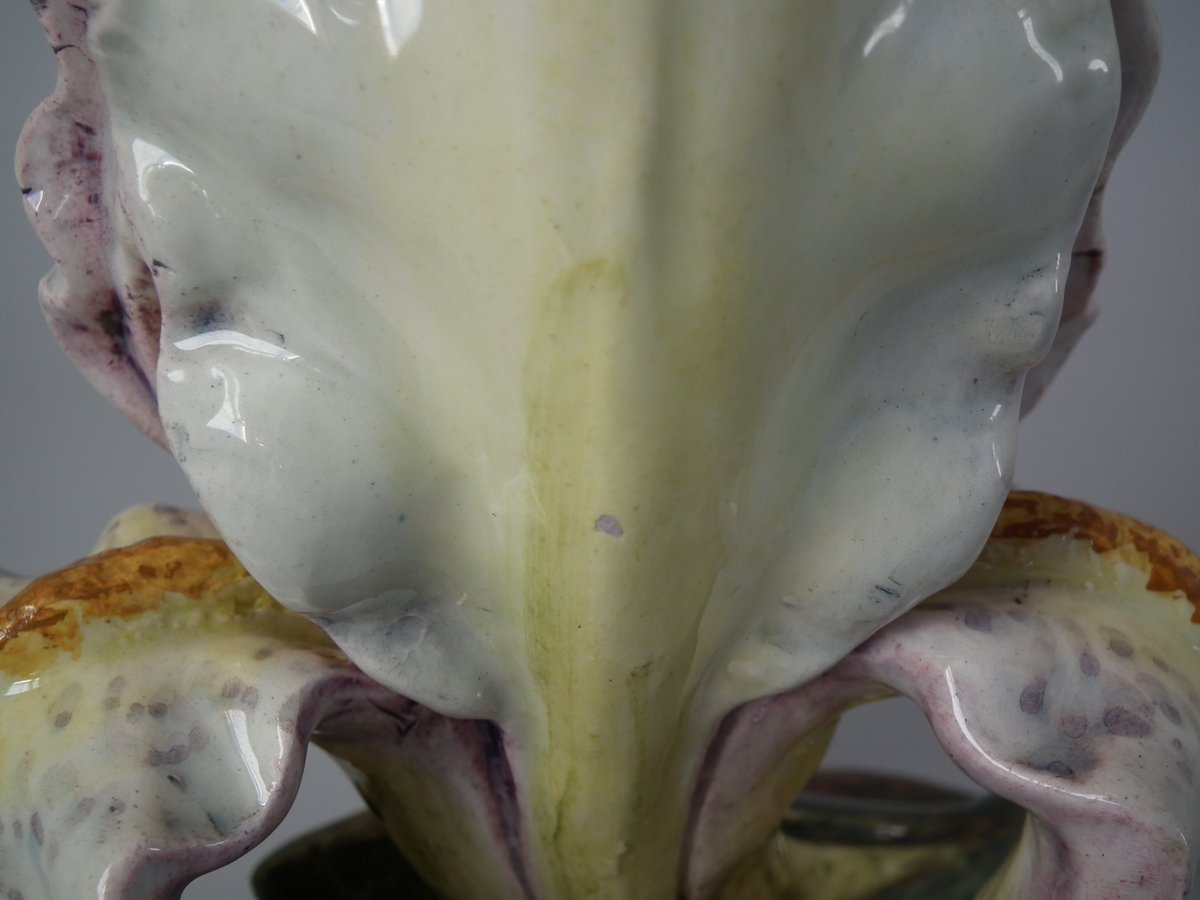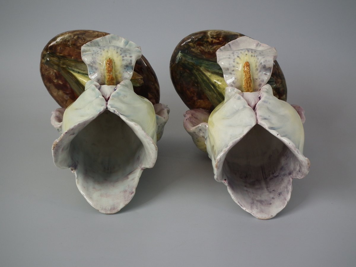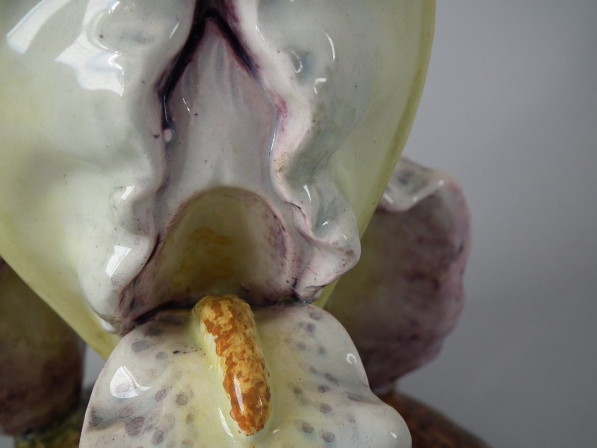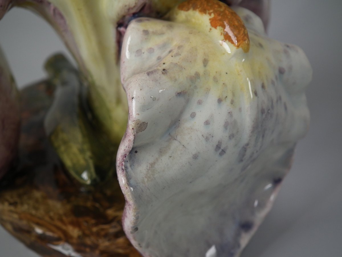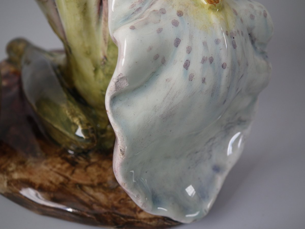 Victorian, circa 1900. Tallest is 8.5ins high, 6.3ins wide, 5.1ins depth. Pair of French Majolica vases which feature iris flowers.