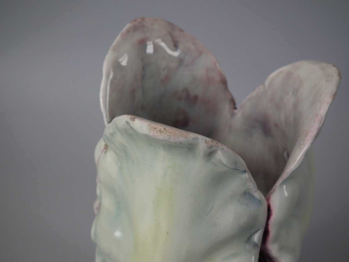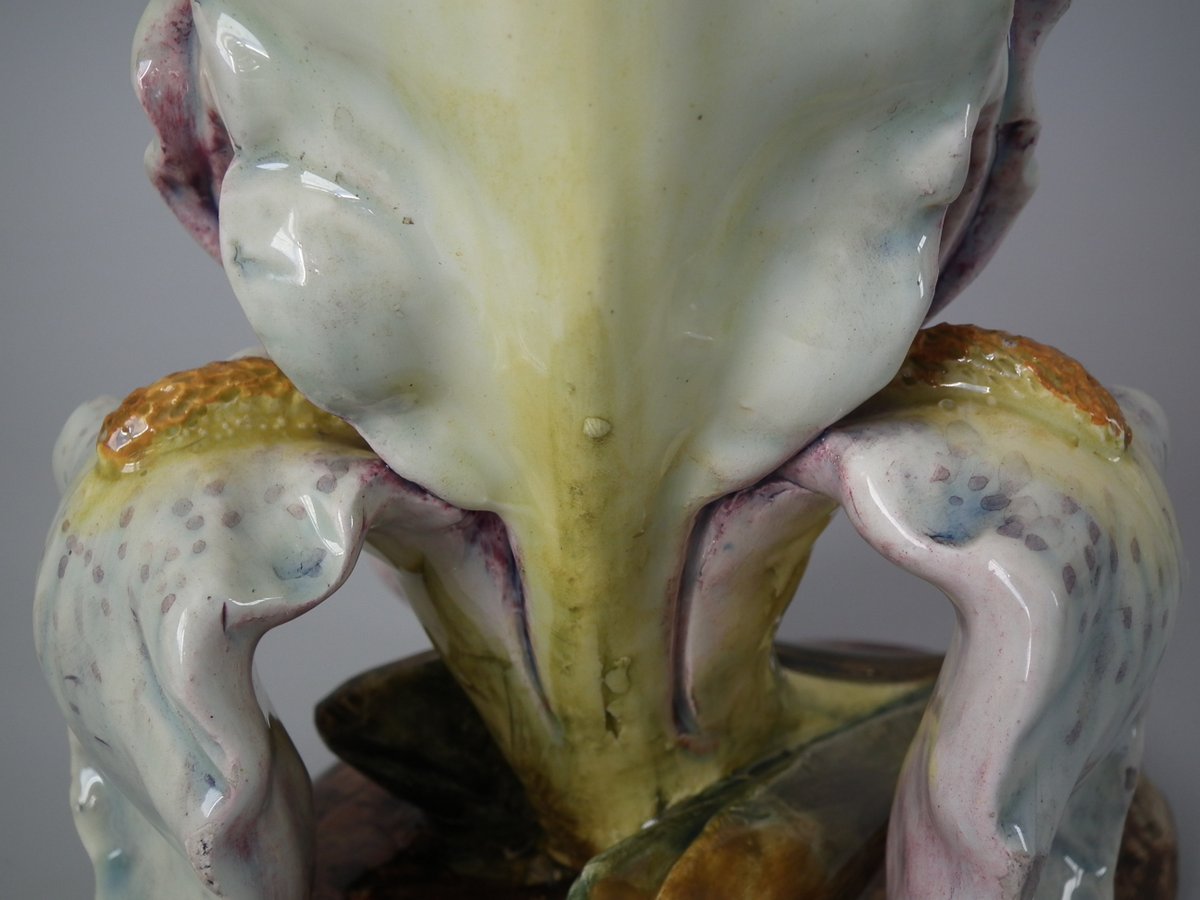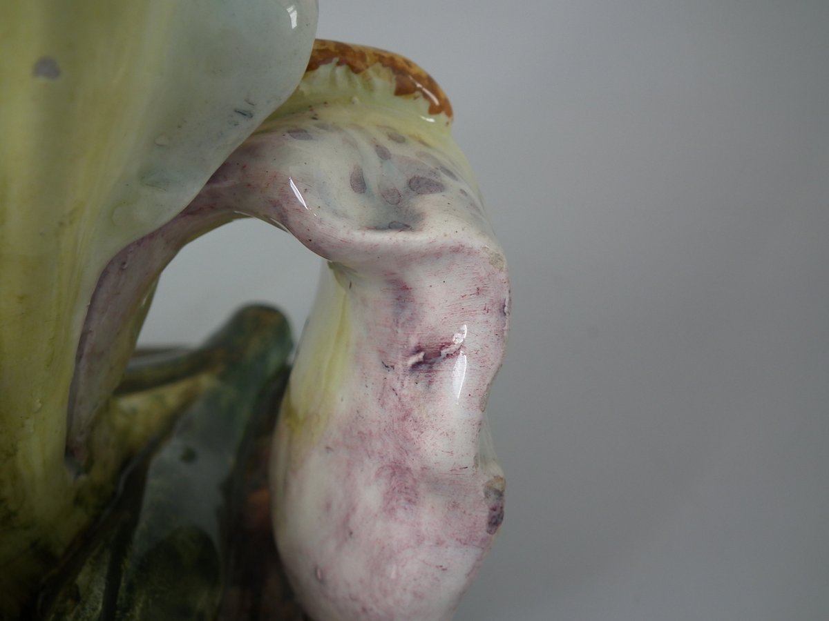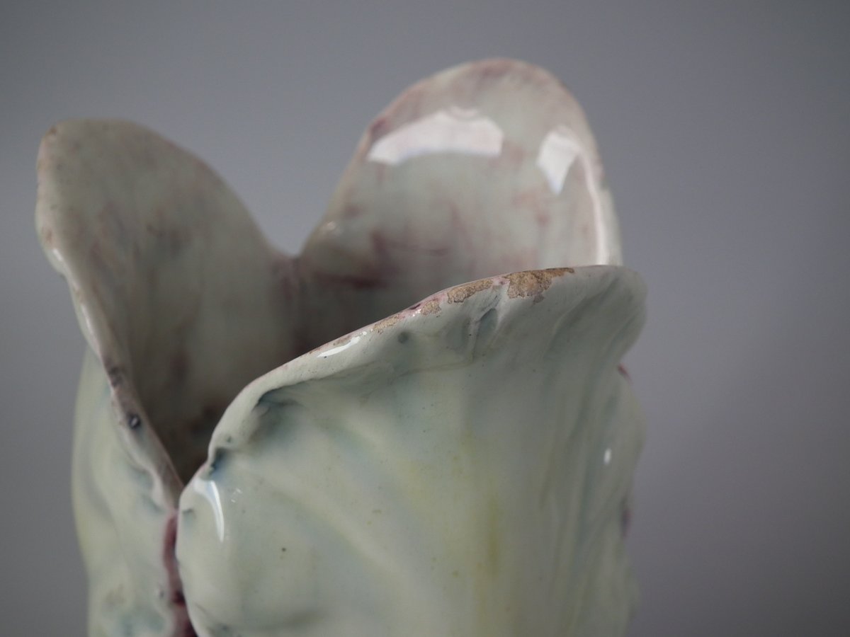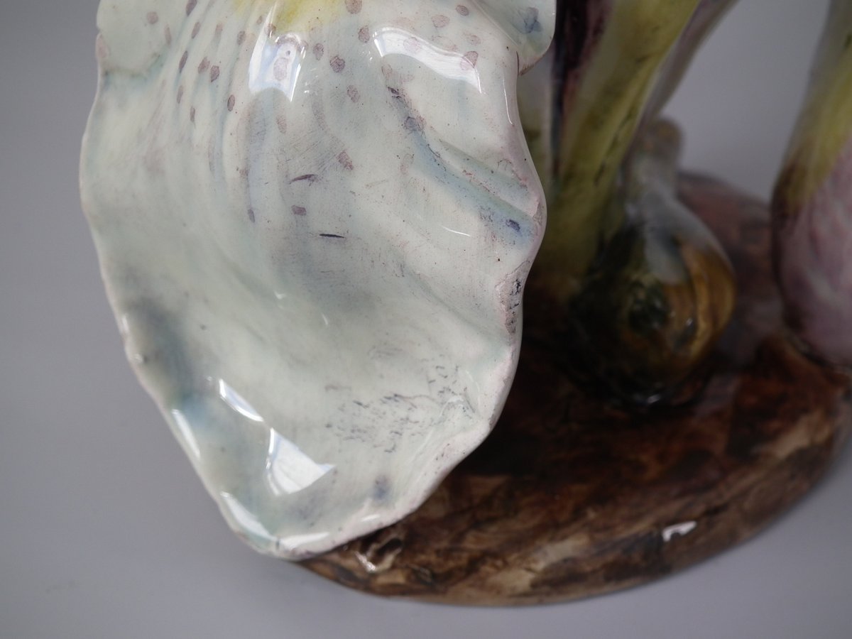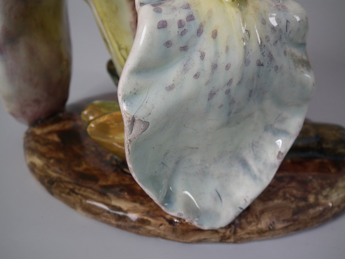 Victorian, circa 1900. Tallest is 8.5ins high, 6.3ins wide, 5.1ins depth. Pair of French Majolica vases which feature iris flowers.