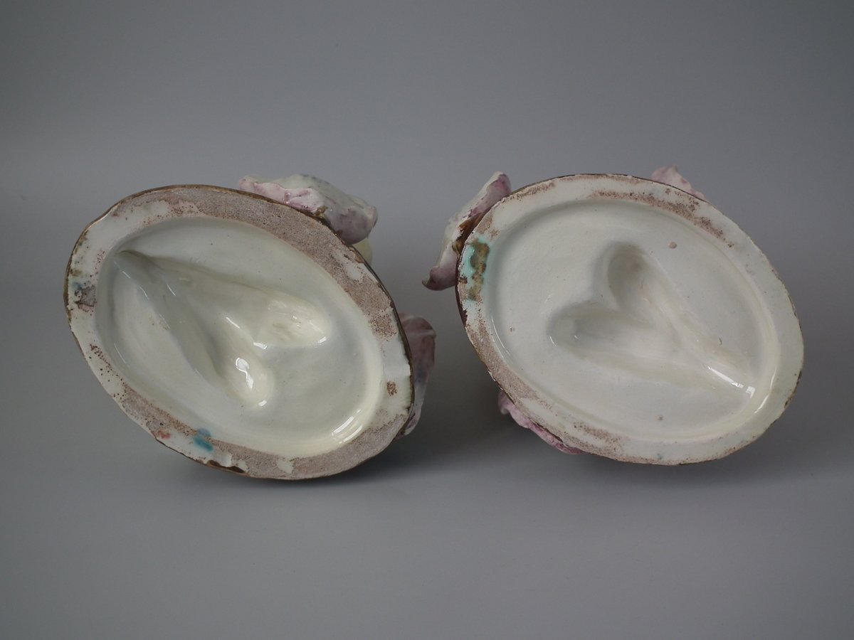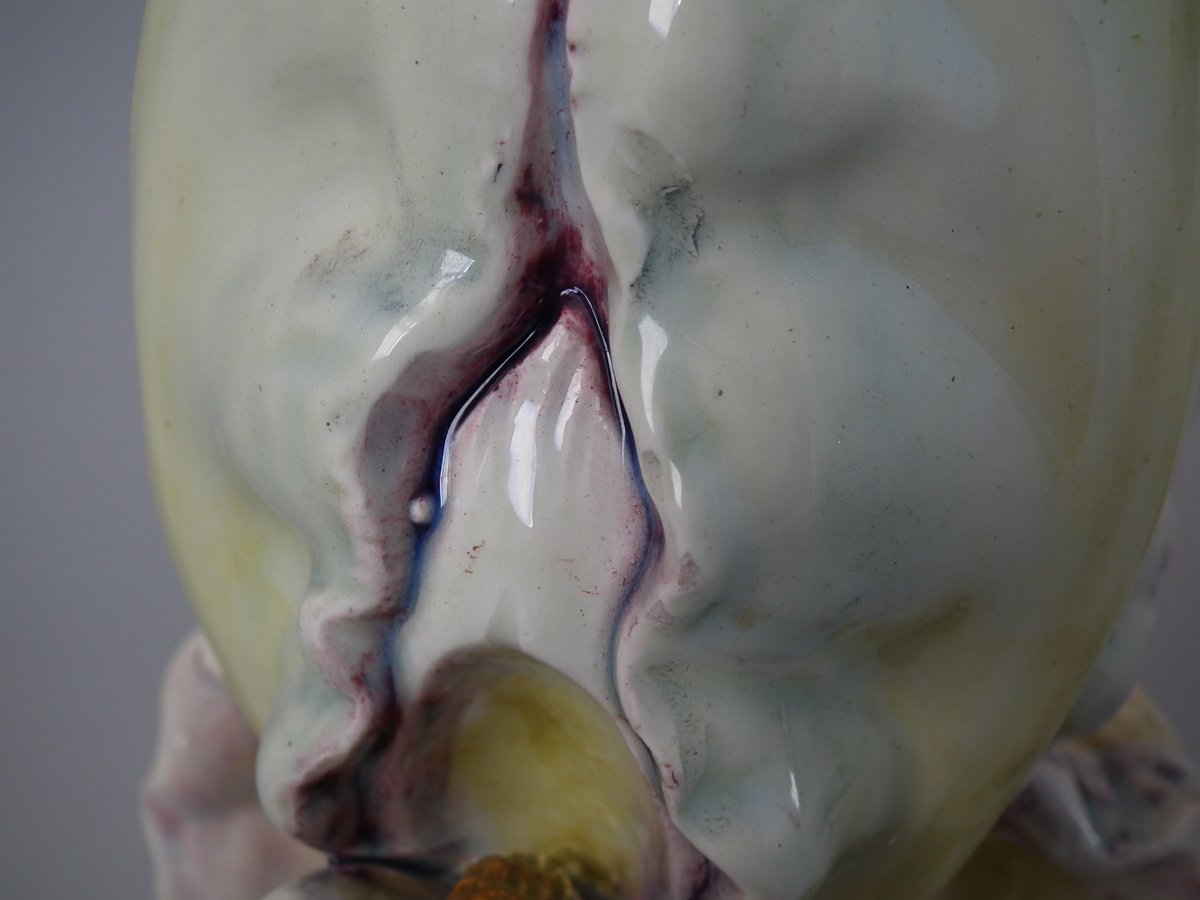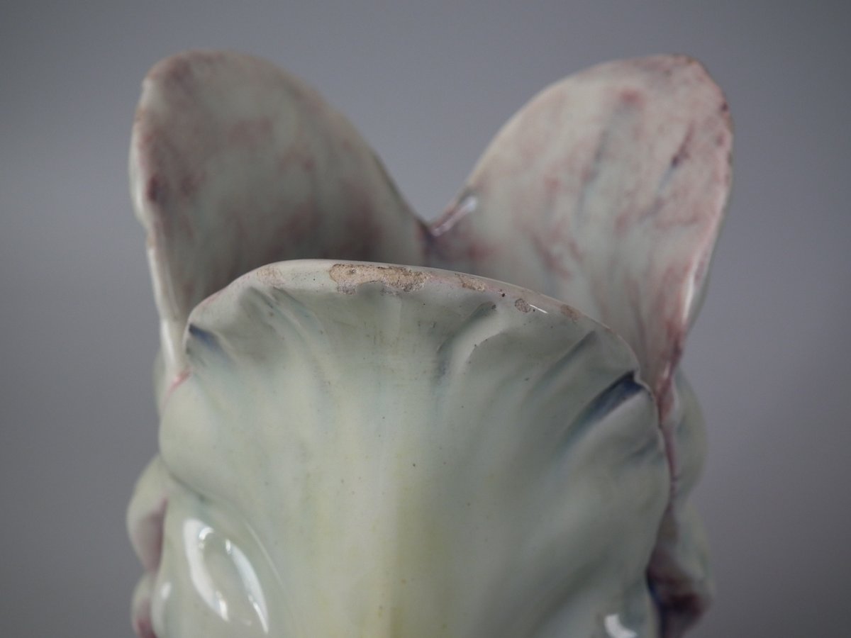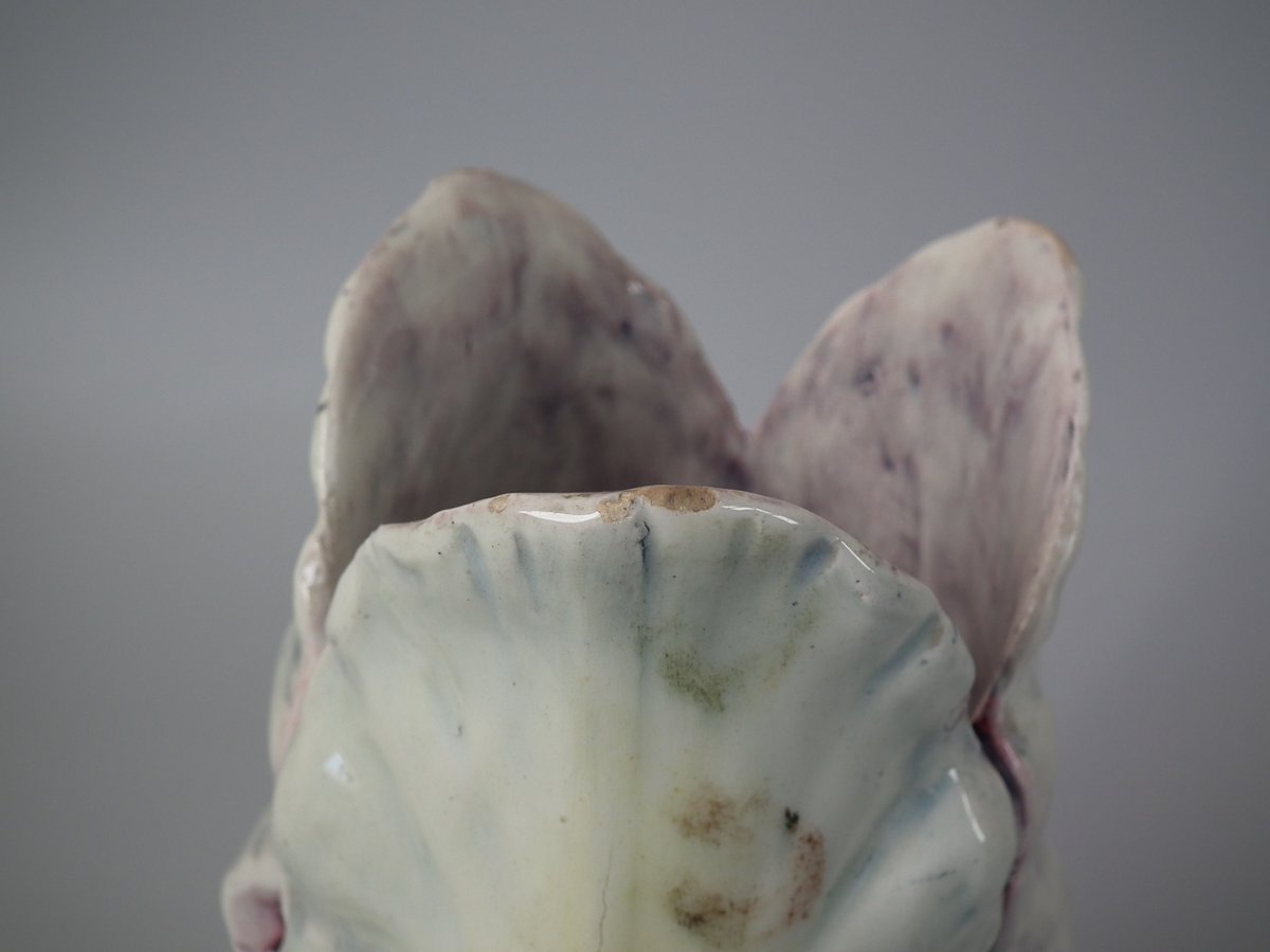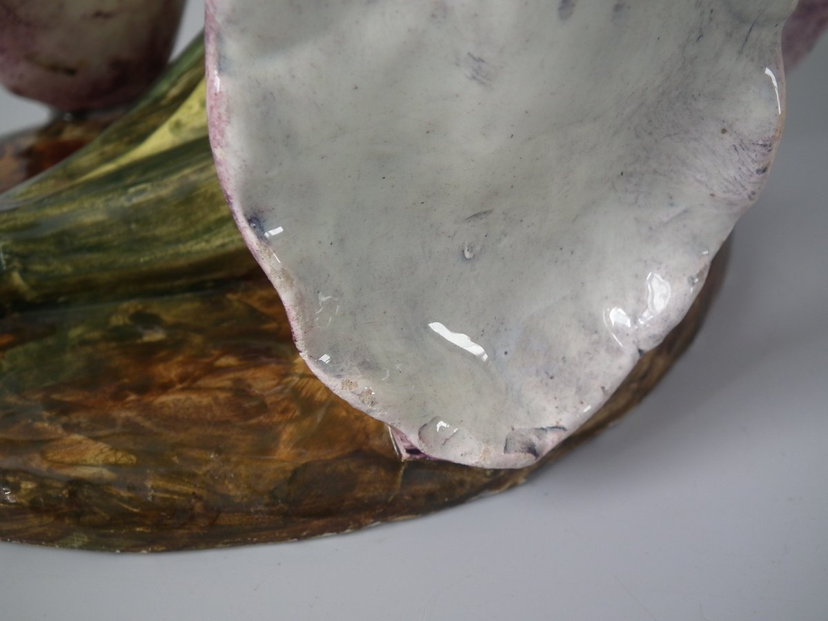 Victorian, circa 1900. Tallest is 8.5ins high, 6.3ins wide, 5.1ins depth. Pair of French Majolica vases which feature iris flowers.