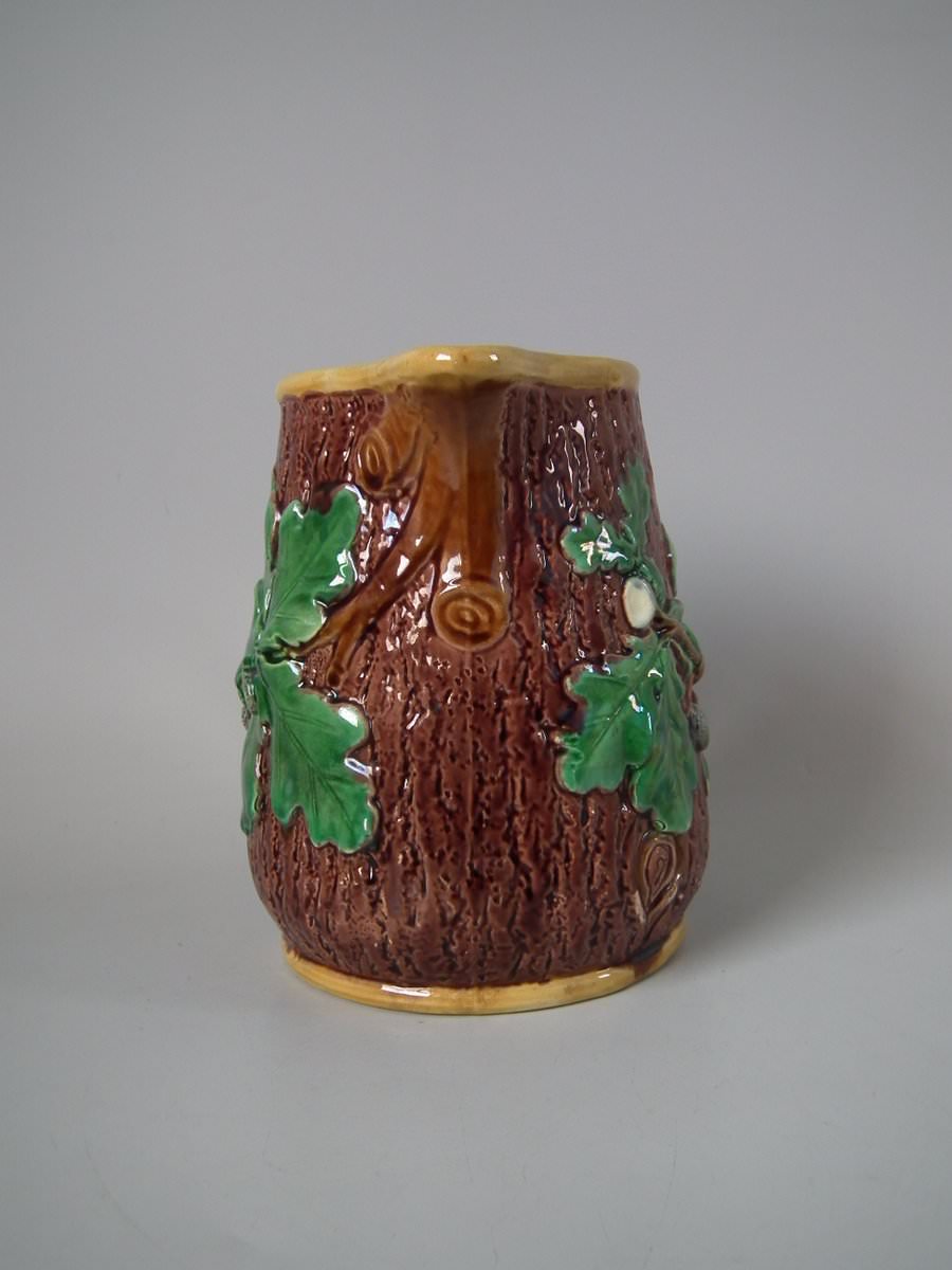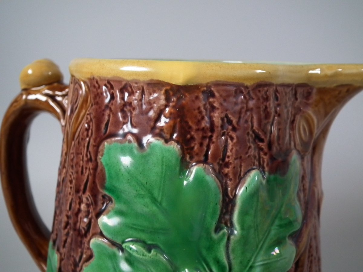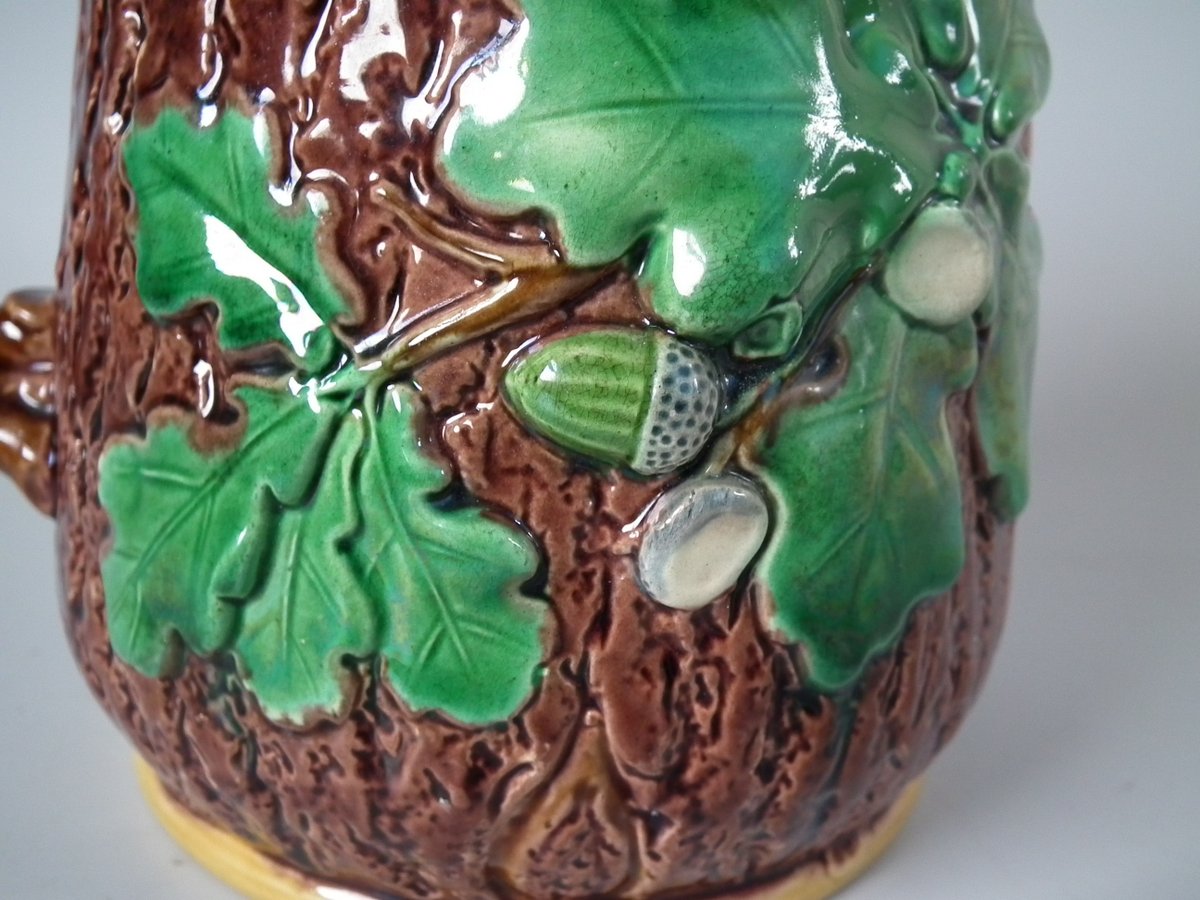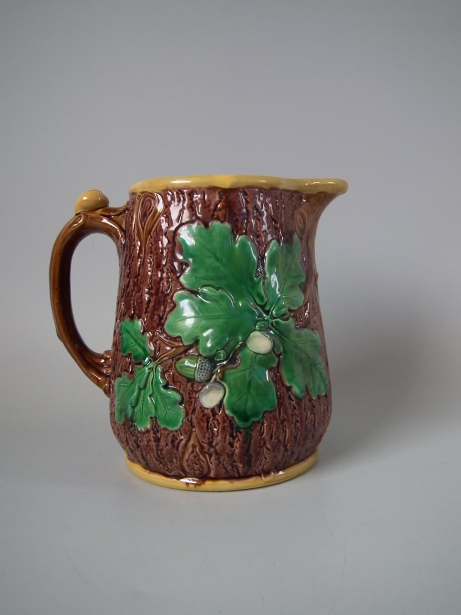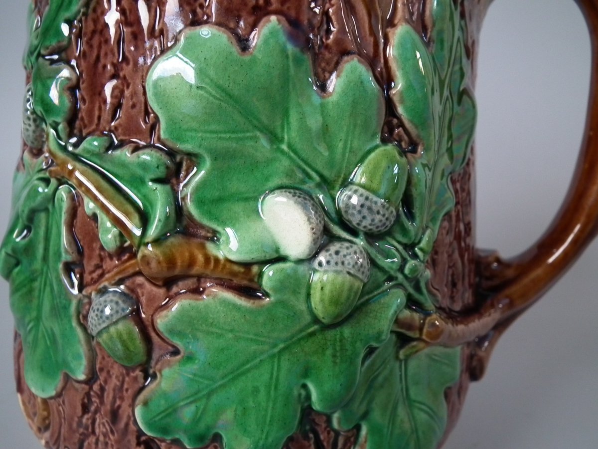 Victorian, circa 1876. 6.9ins high, 7.5ins wide, 5.1ins depth. Mintons Majolica jug/pitcher which features oak leaves and acorns to the sides and a snail to the handle. Colouration: brown, green, ochre, are predominant.