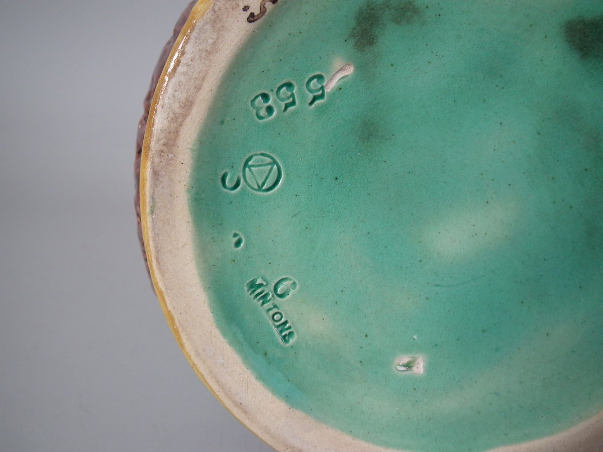 The piece bears maker's marks for the Mintons pottery. Bears a pattern number, '553'. Marks include a factory specific date cipher for the year 1876.