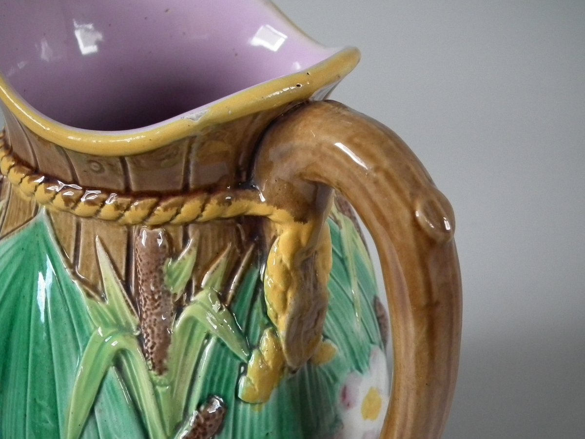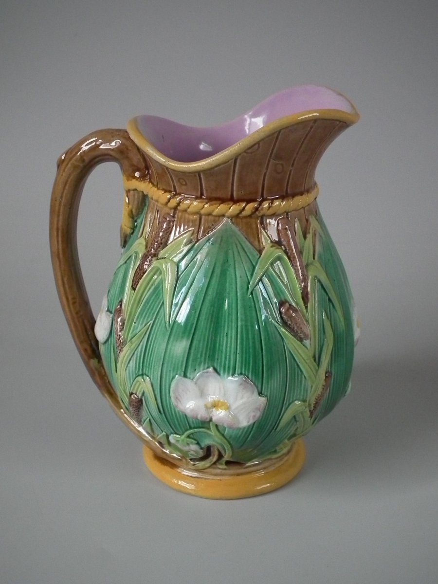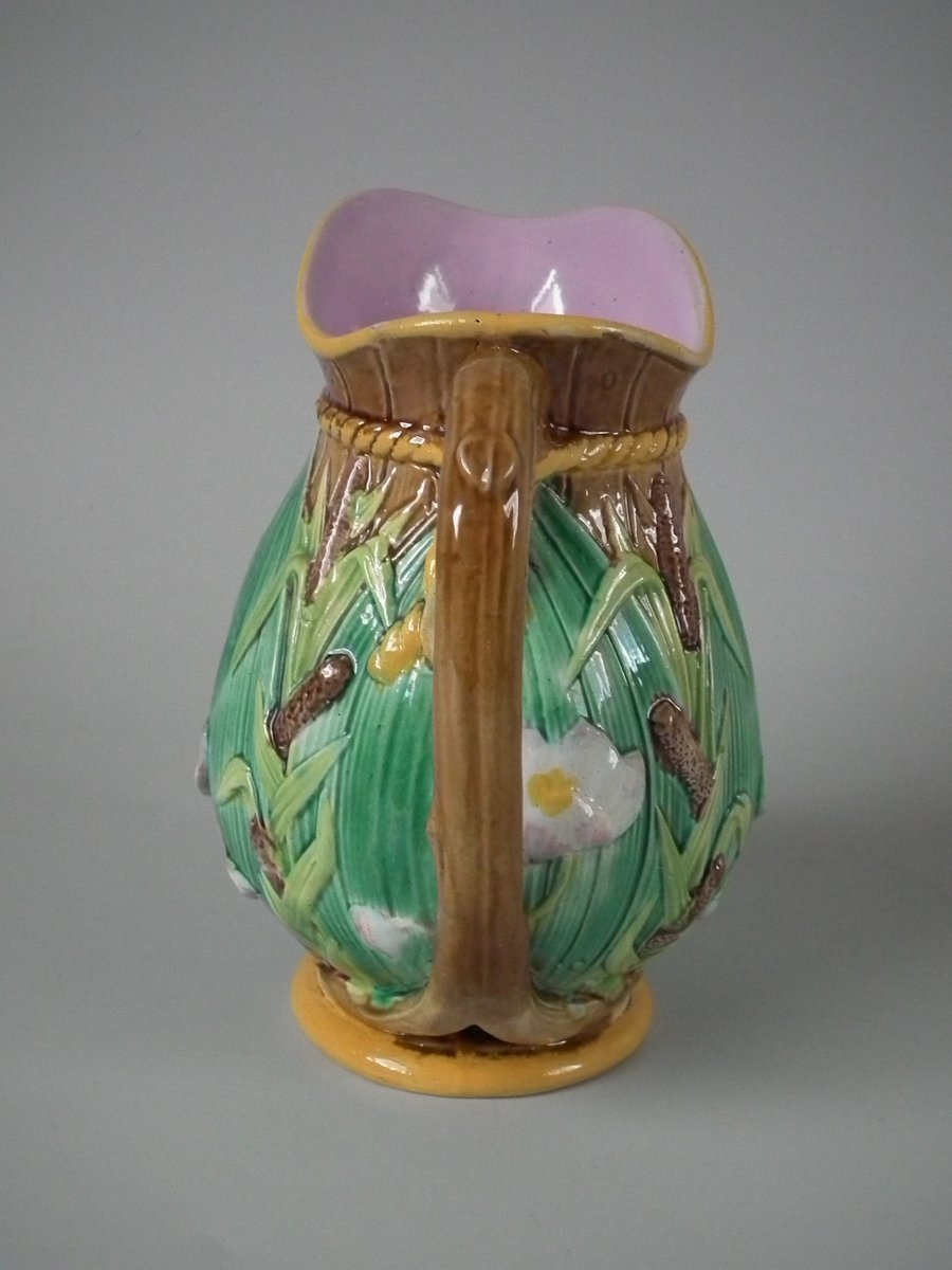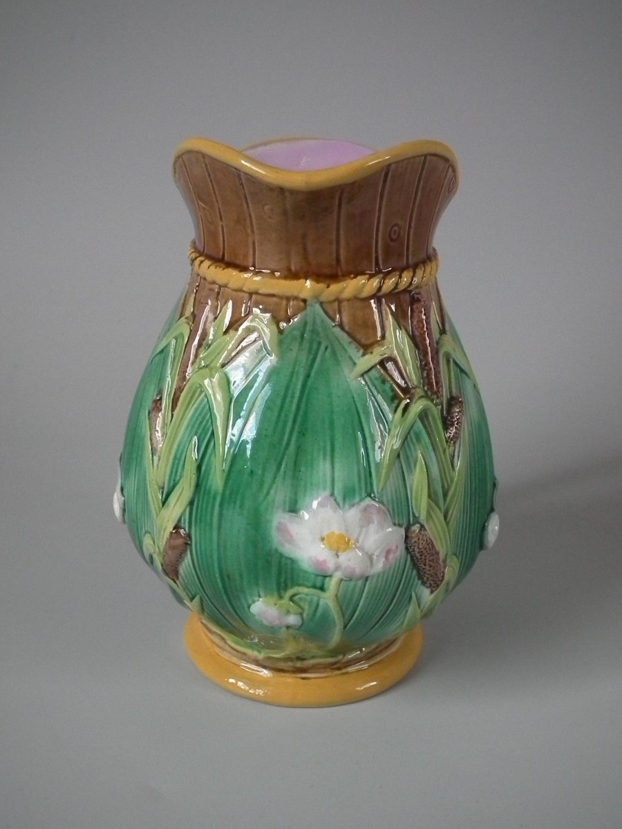 Victorian, circa 1870. 6.3ins high, 5.1ins wide, 4.3ins depth. George Jones Majolica jug/pitcher which features green leaves, bulrushes/cattails and water lilies.