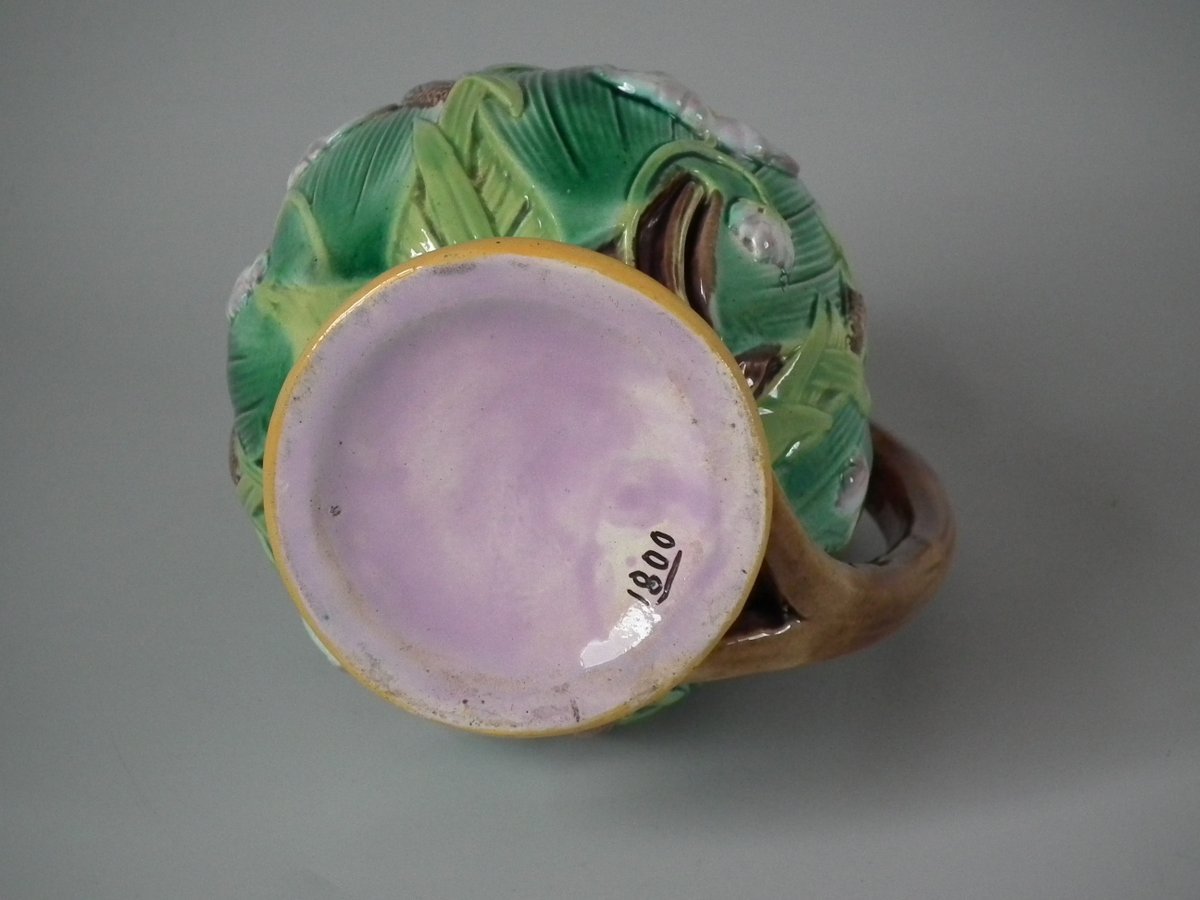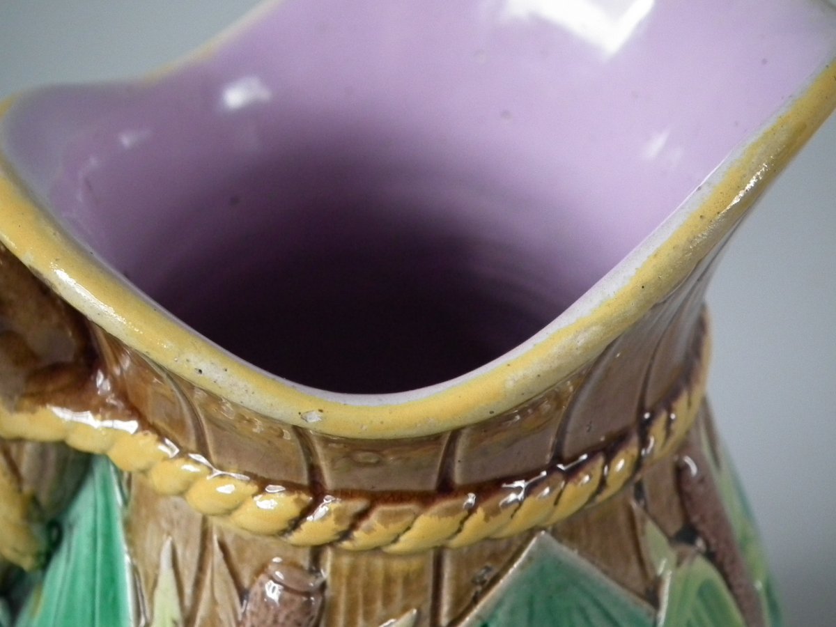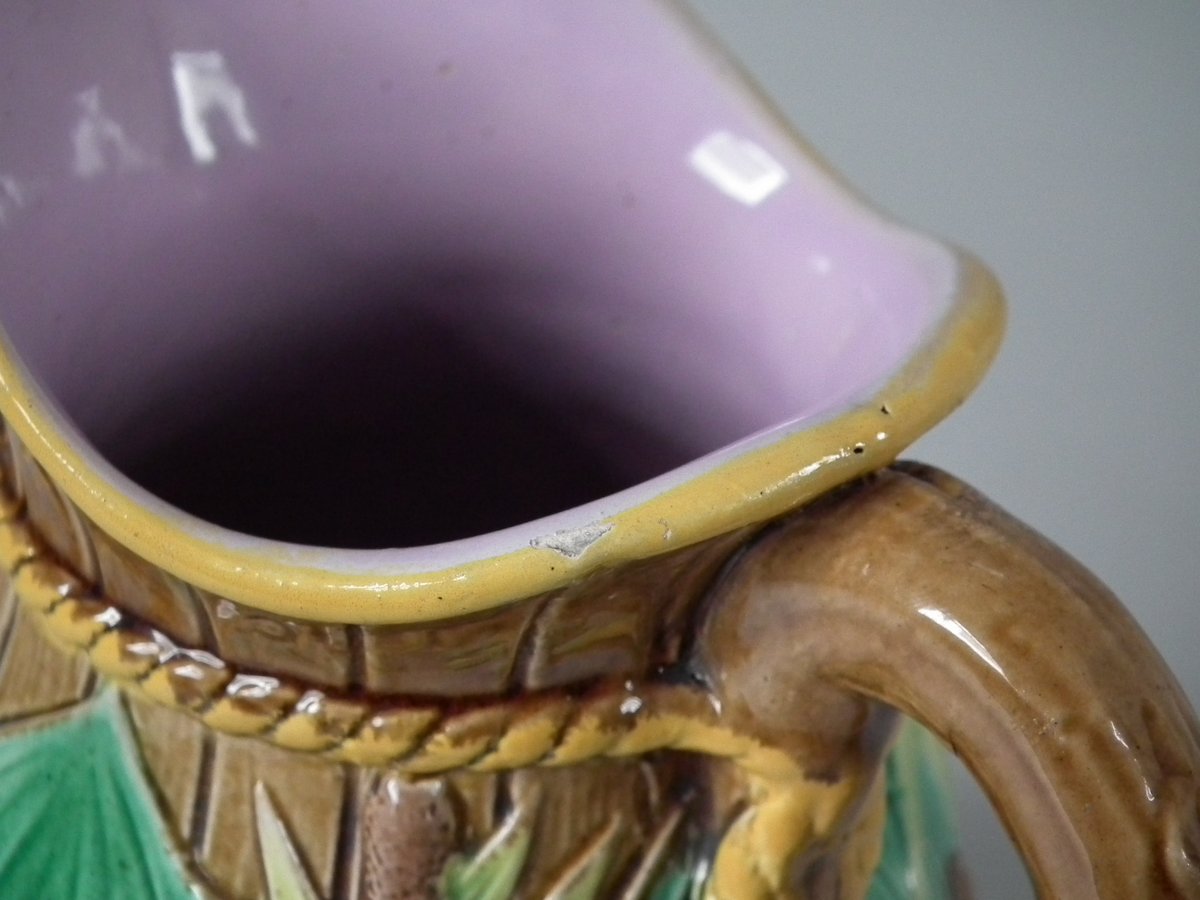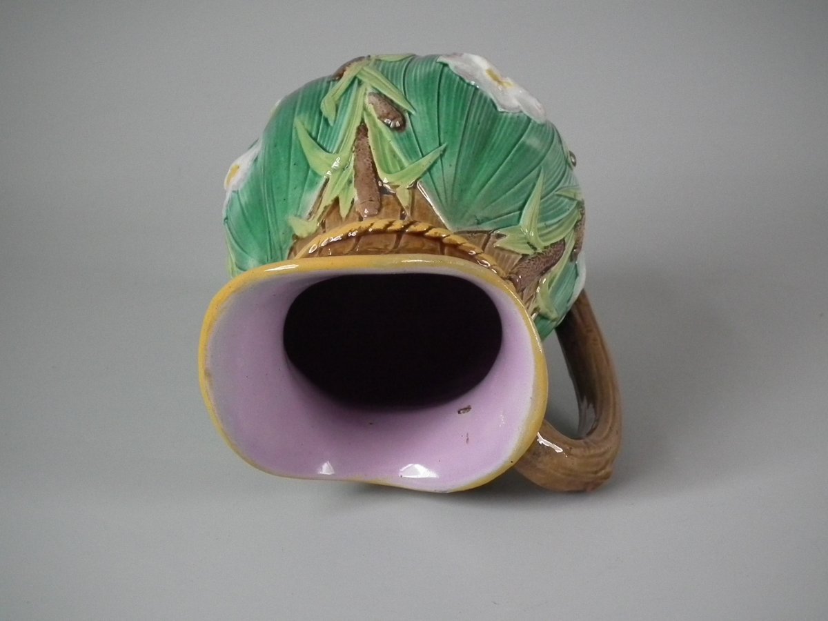 Victorian, circa 1870. 6.3ins high, 5.1ins wide, 4.3ins depth. George Jones Majolica jug/pitcher which features green leaves, bulrushes/cattails and water lilies.