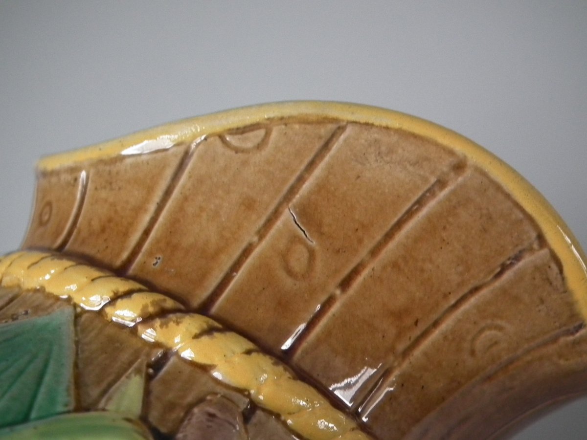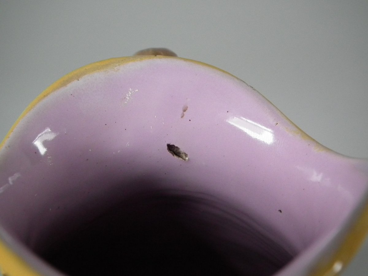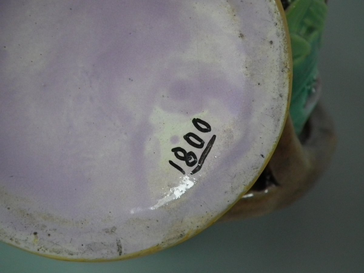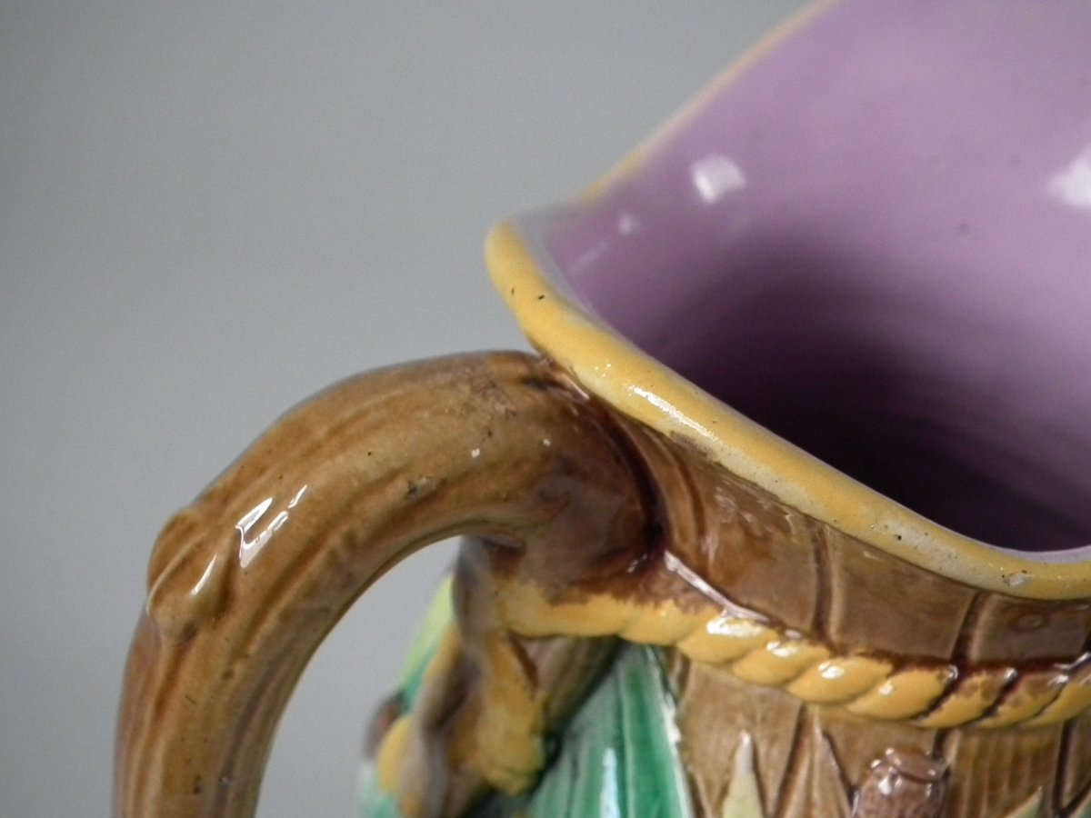 Victorian, circa 1870. 6.3ins high, 5.1ins wide, 4.3ins depth. George Jones Majolica jug/pitcher which features green leaves, bulrushes/cattails and water lilies.
