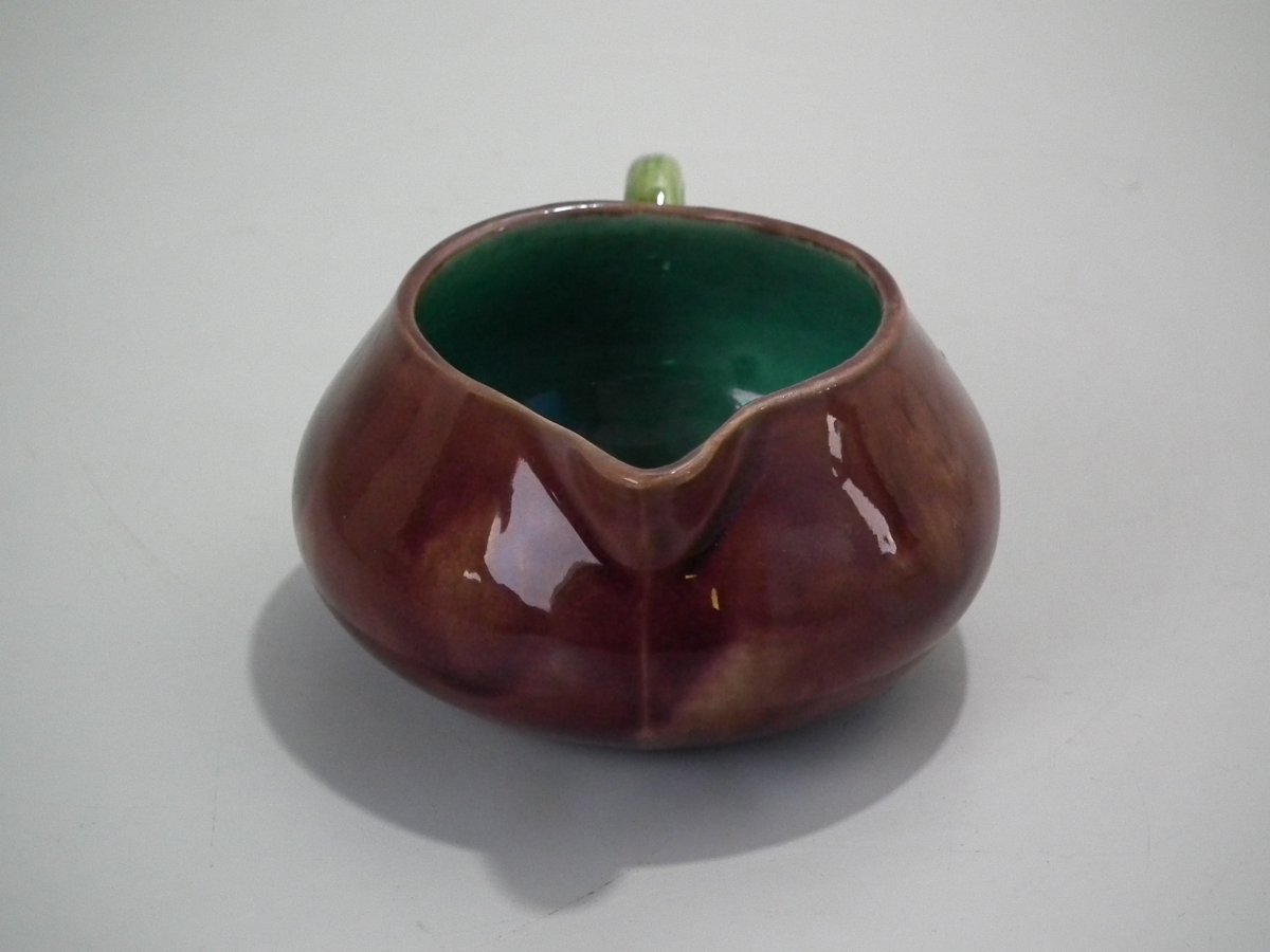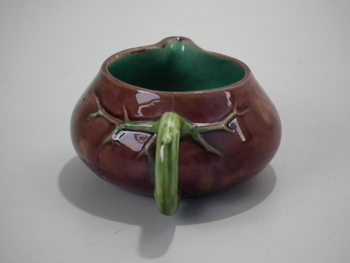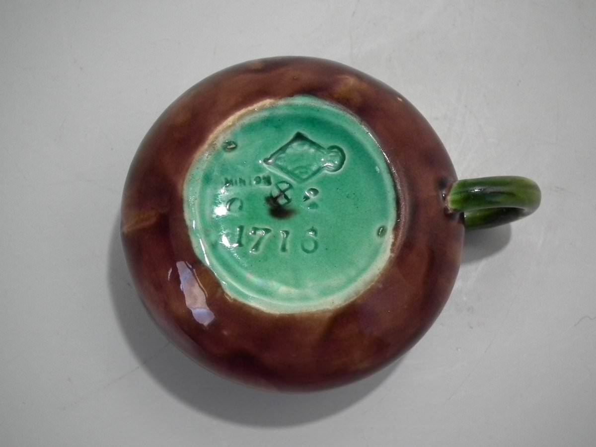 Victorian, circa 1872. 1.9ins high, 4.4ins wide, 3.5ins depth. Minton Majolica creamer which features a branch handle.