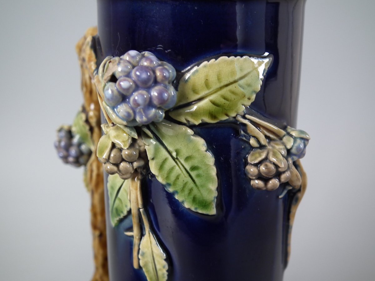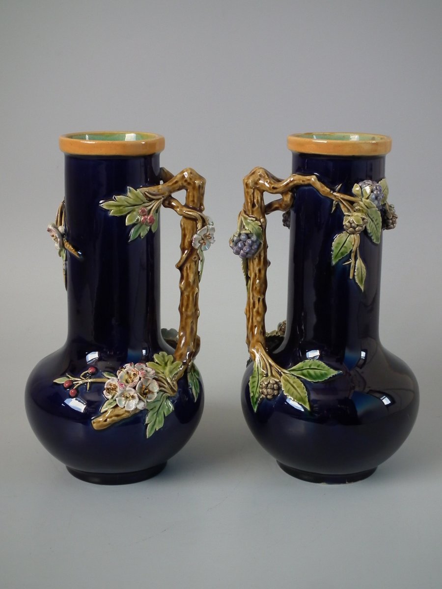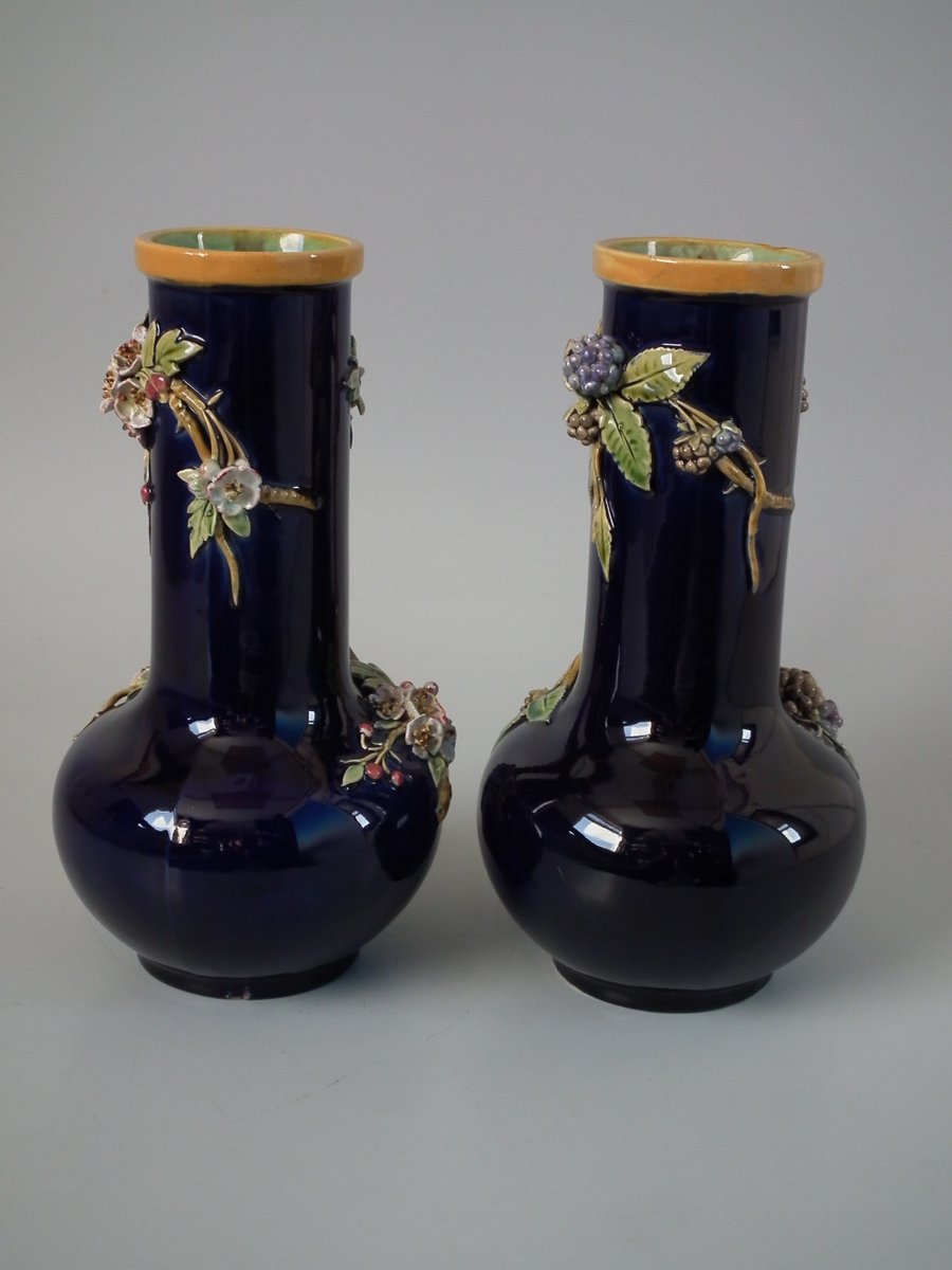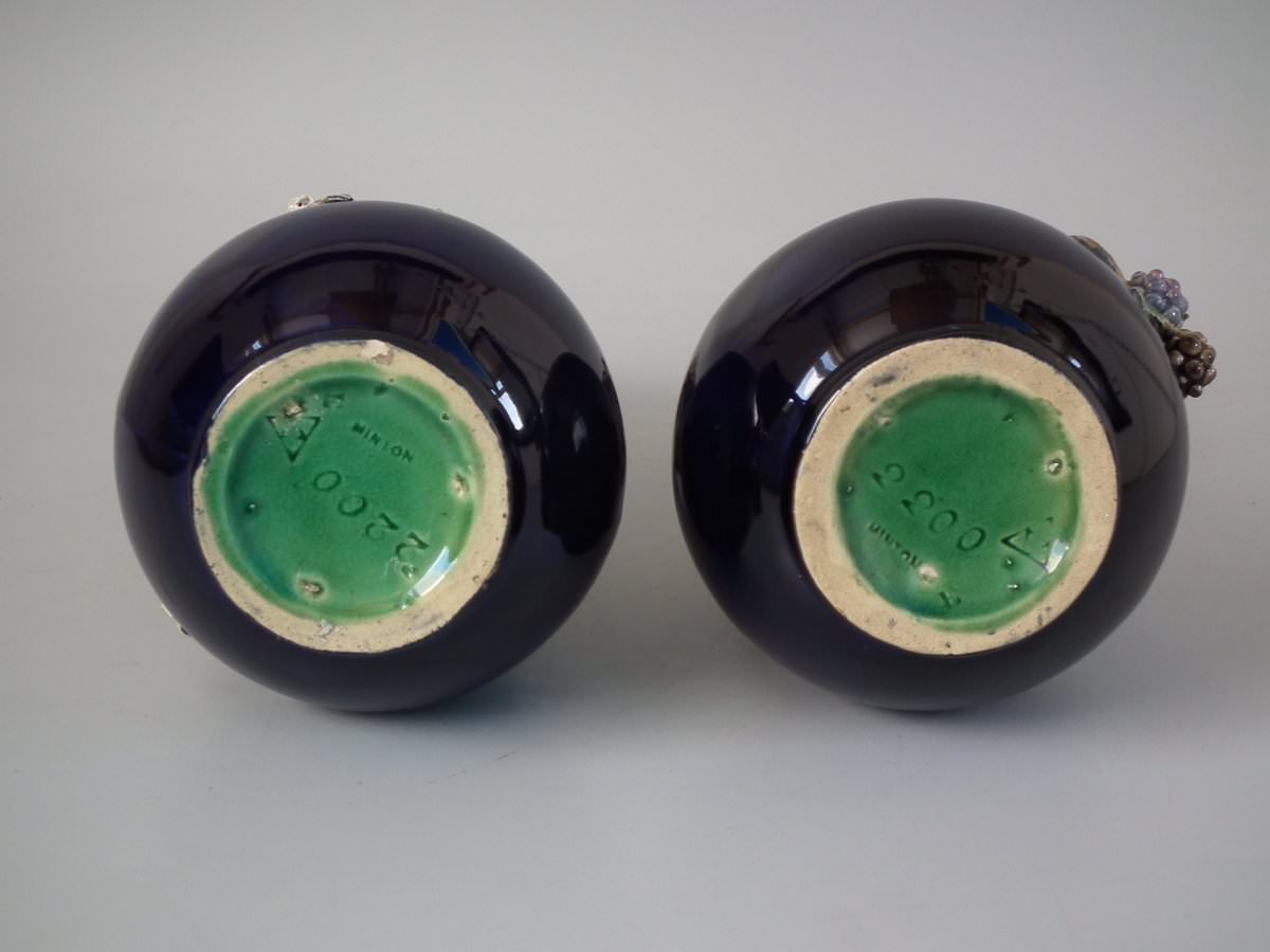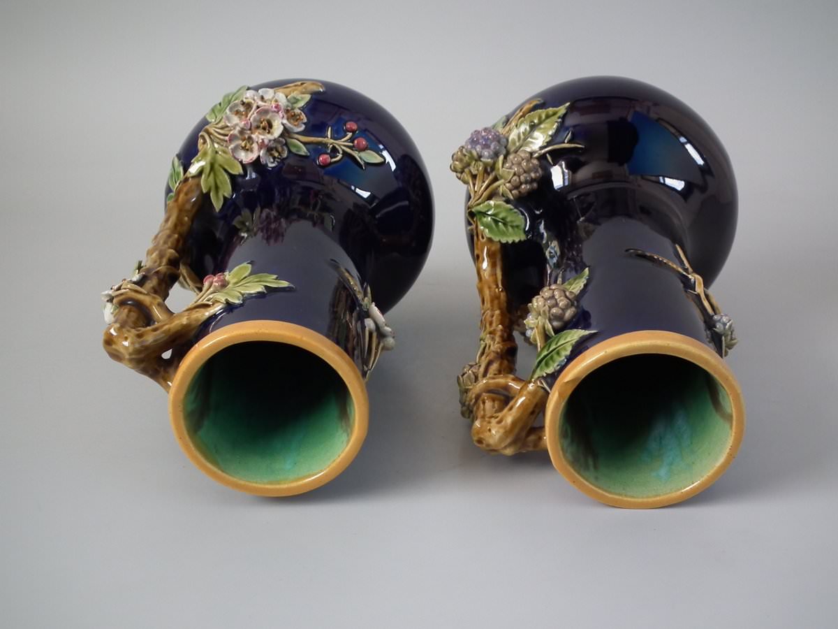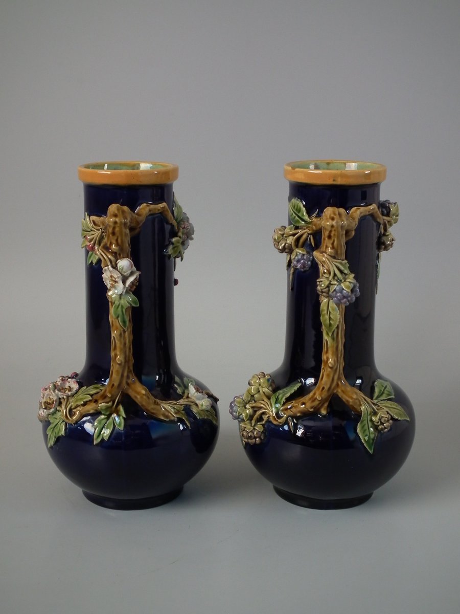 Victorian, circa 1879. Tallest is 8.3ins high, 4.3ins wide, 4.3ins depth. Pair of Minton Majolica vases which feature leaves, flowers, berries and a branch handle (one vase has blackberries, the other has hawthorn).