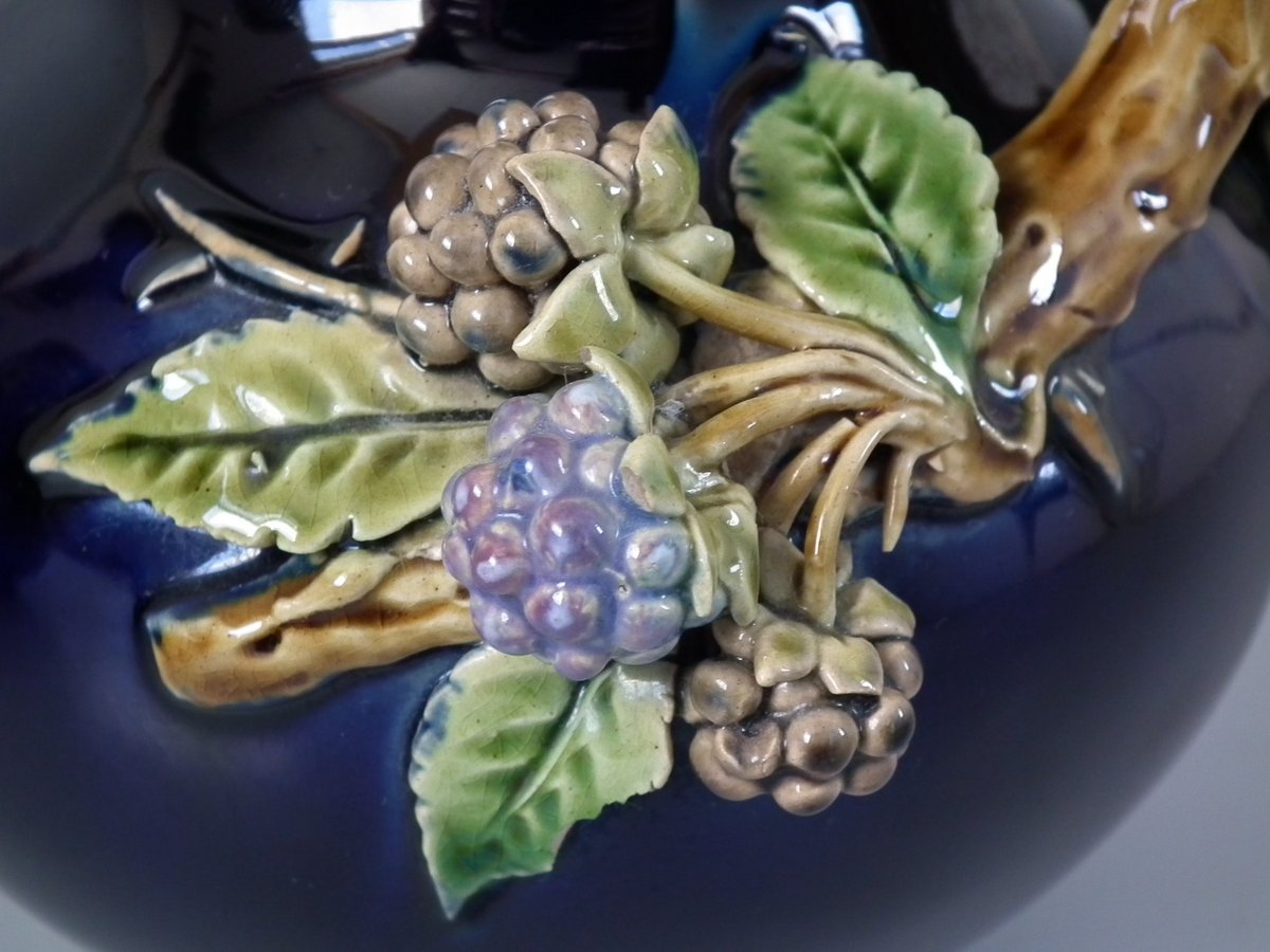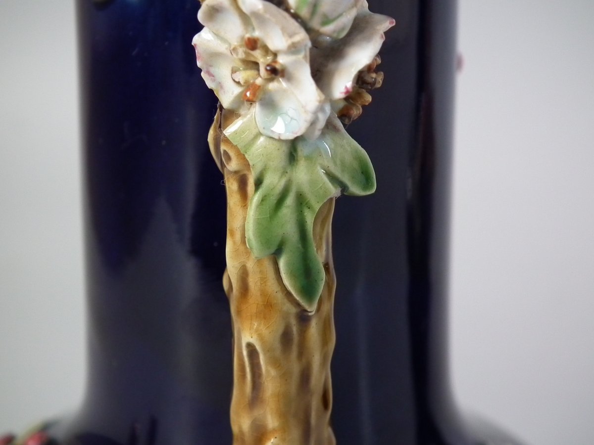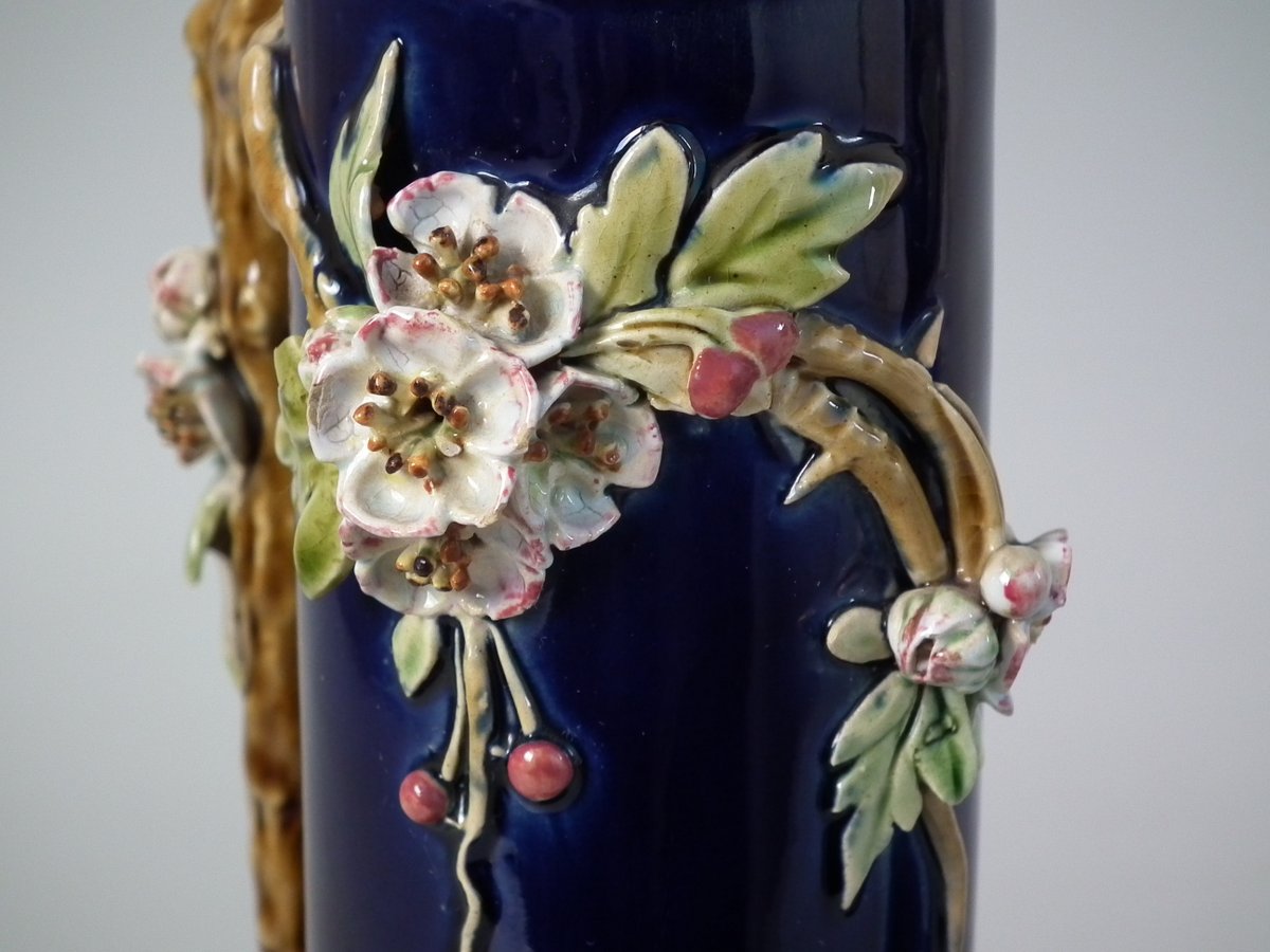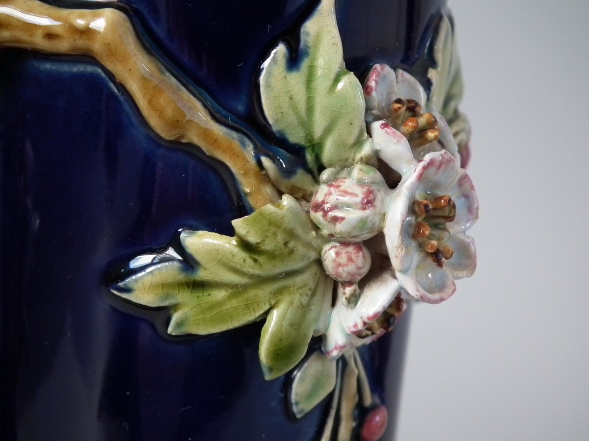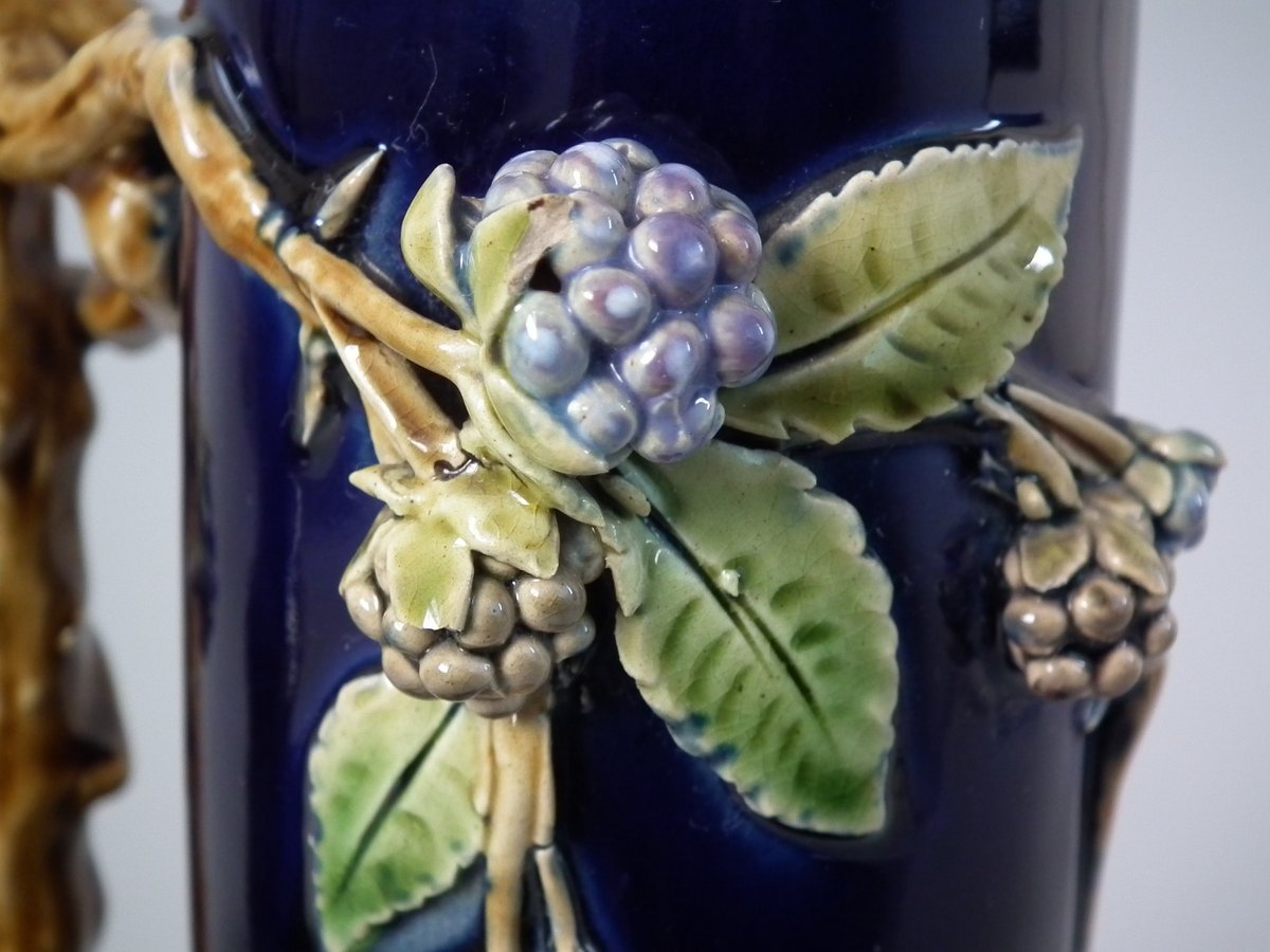 Victorian, circa 1879. Tallest is 8.3ins high, 4.3ins wide, 4.3ins depth. Pair of Minton Majolica vases which feature leaves, flowers, berries and a branch handle (one vase has blackberries, the other has hawthorn).