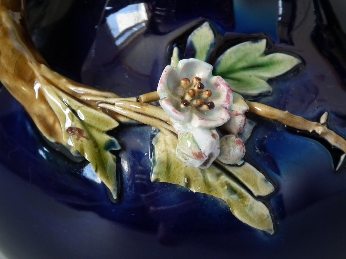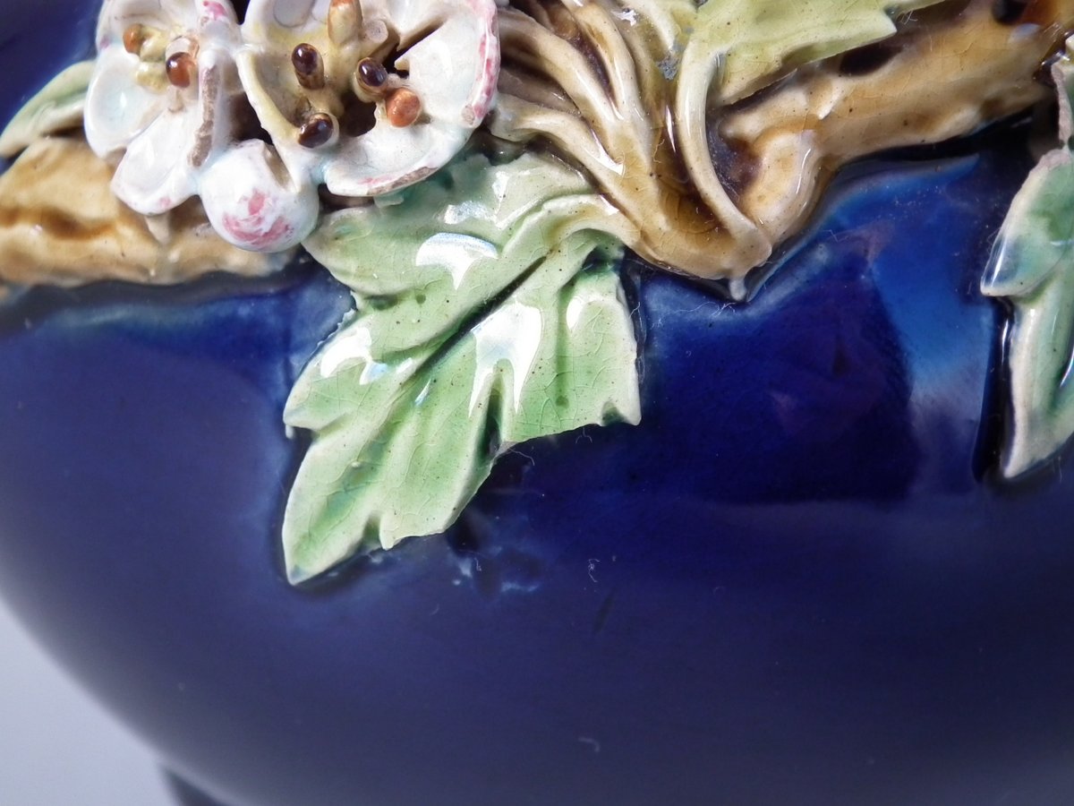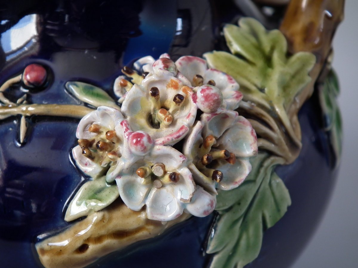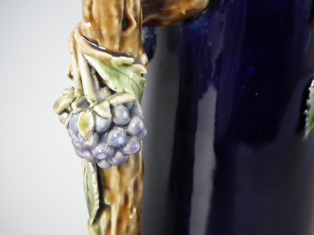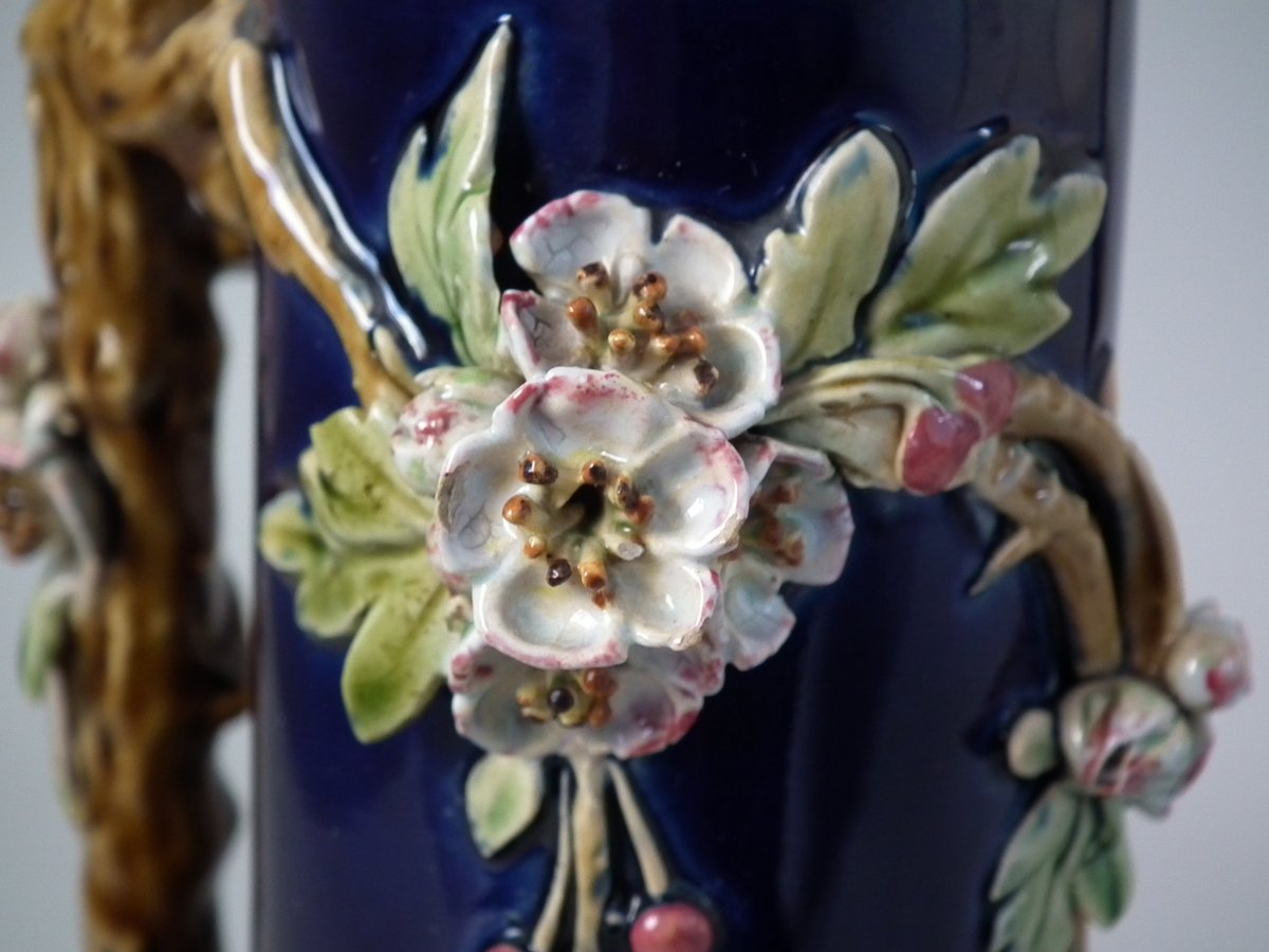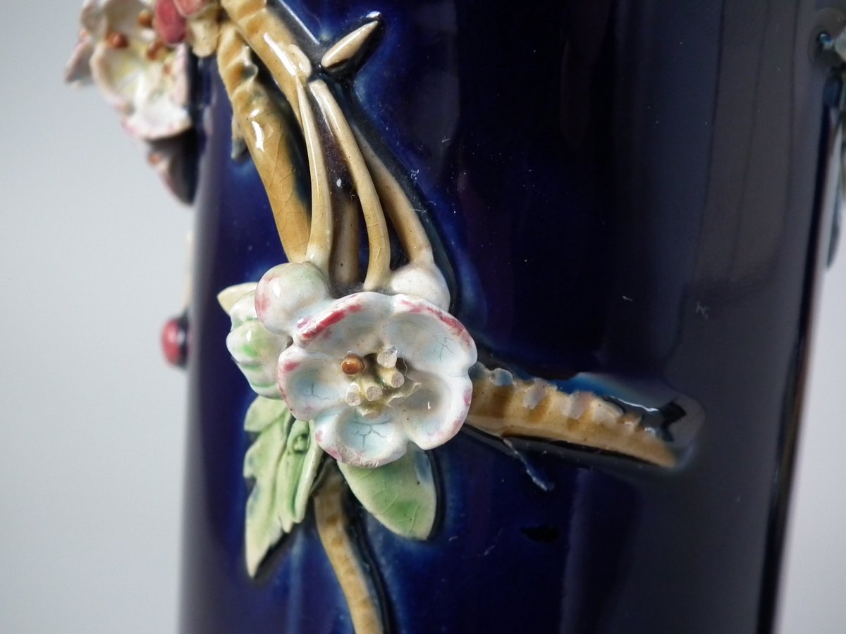 Victorian, circa 1879. Tallest is 8.3ins high, 4.3ins wide, 4.3ins depth. Pair of Minton Majolica vases which feature leaves, flowers, berries and a branch handle (one vase has blackberries, the other has hawthorn).