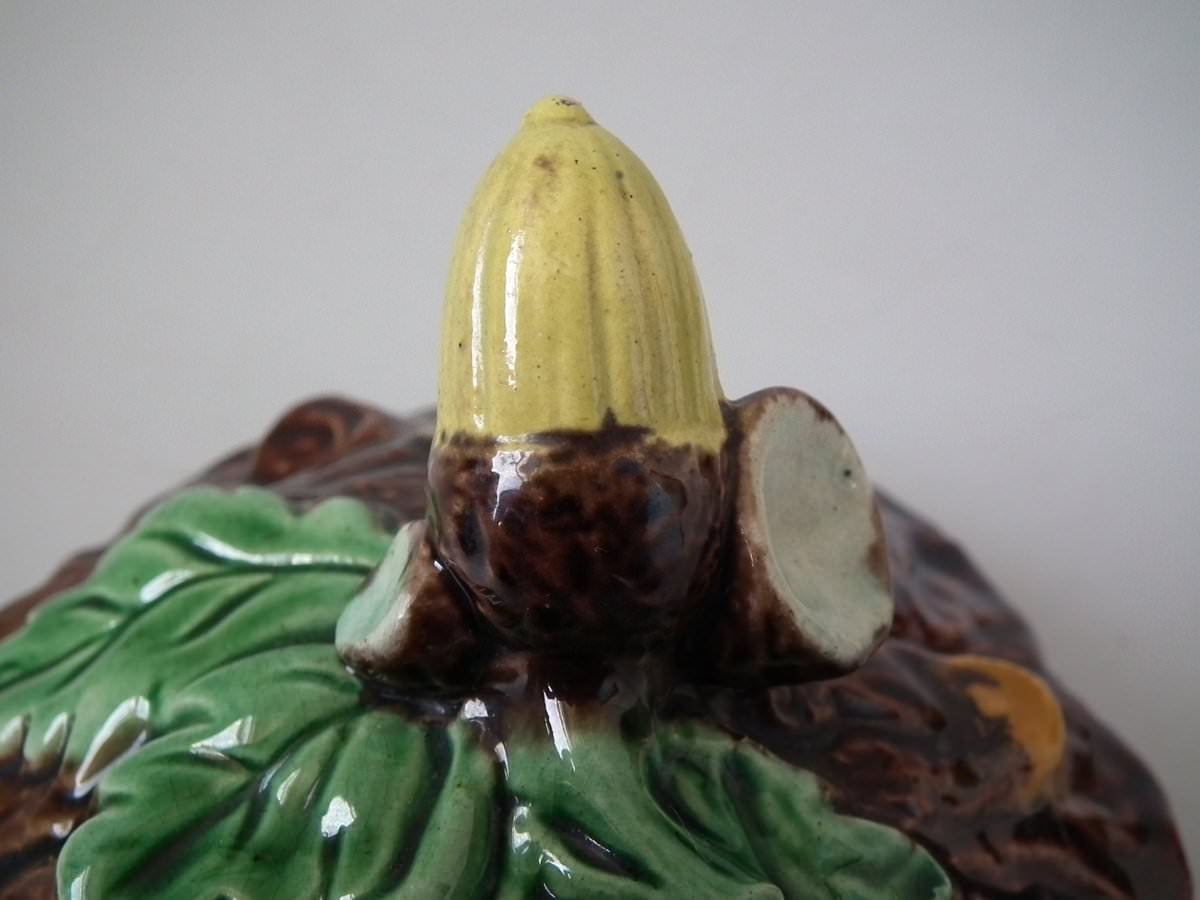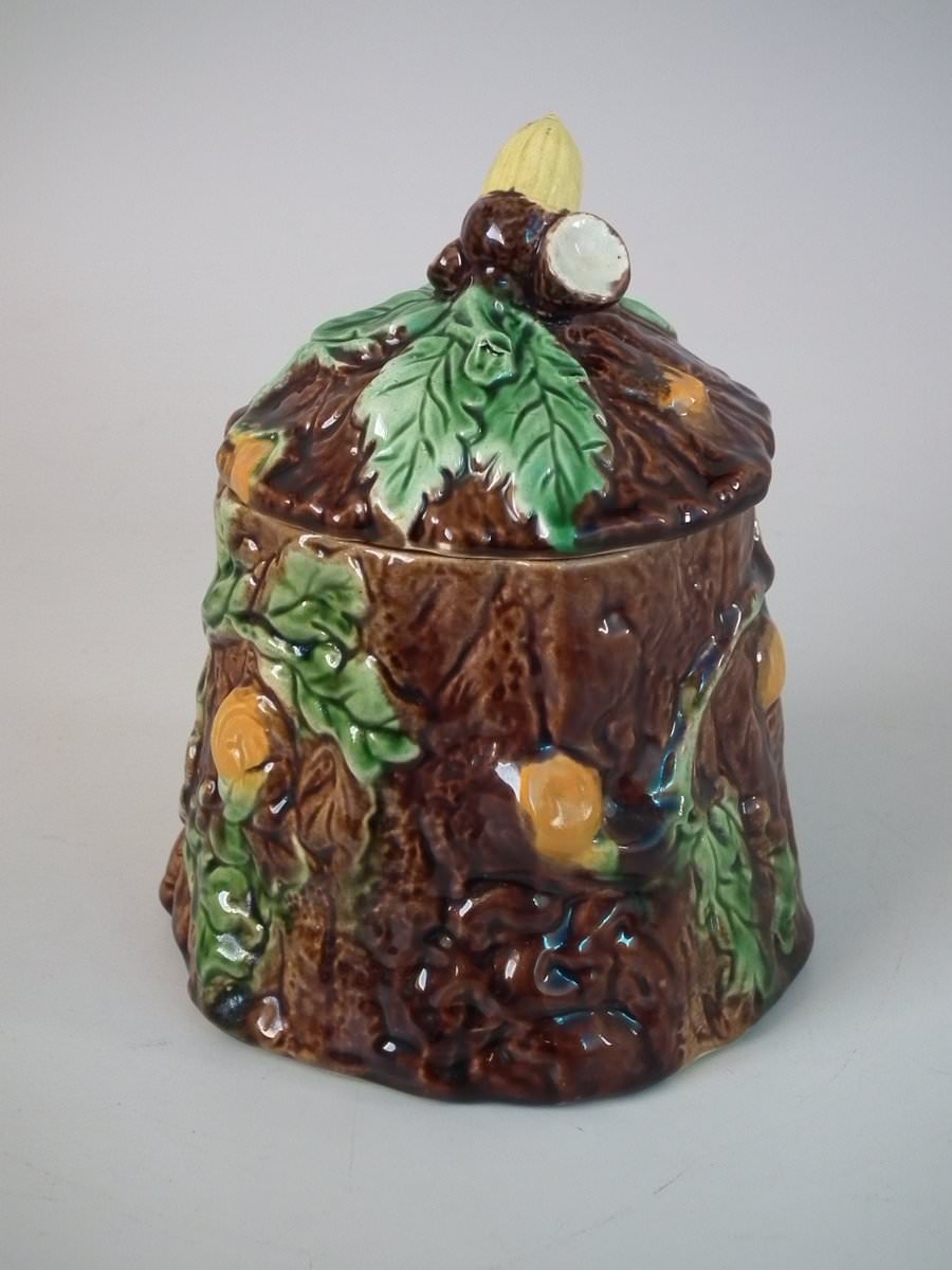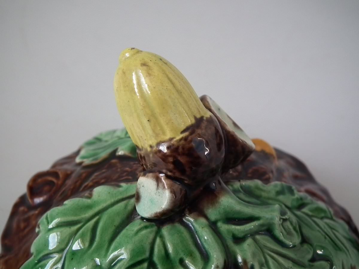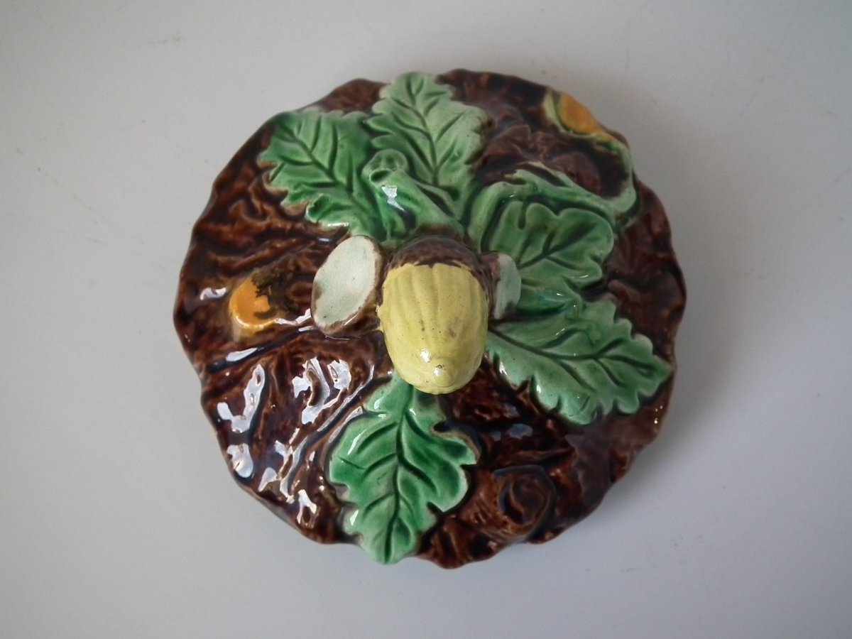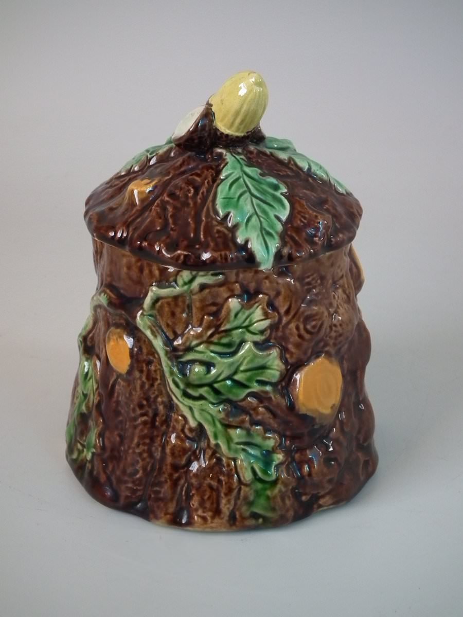 Victorian, circa 1880. 6.1ins high, 4.7ins wide, 4.9ins depth. Majolica pot and cover which features oak leaves and acorns on a bark ground.