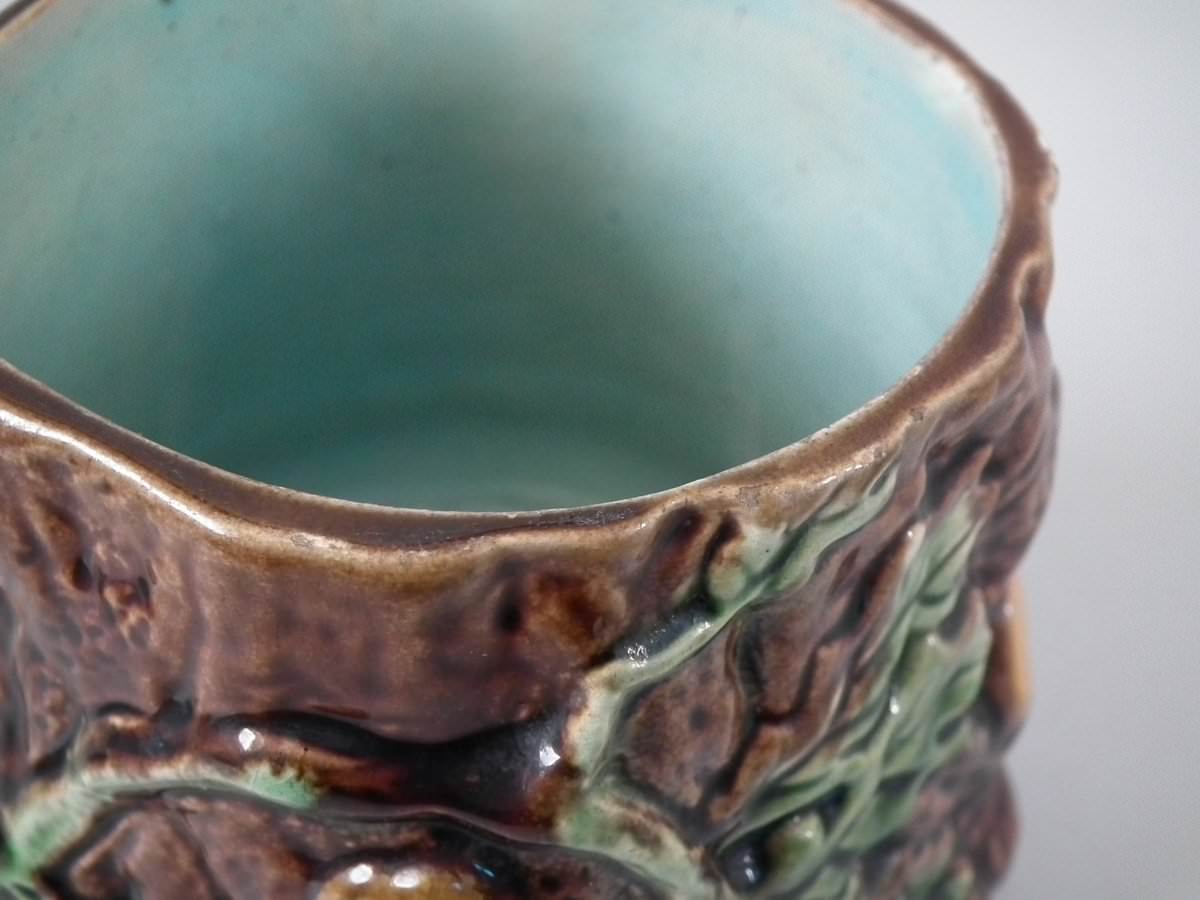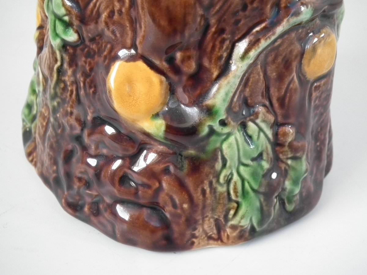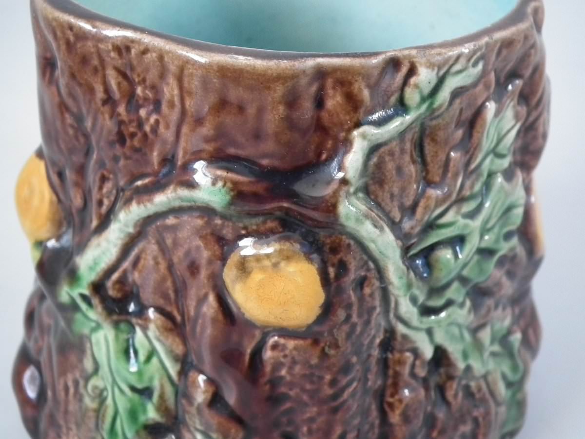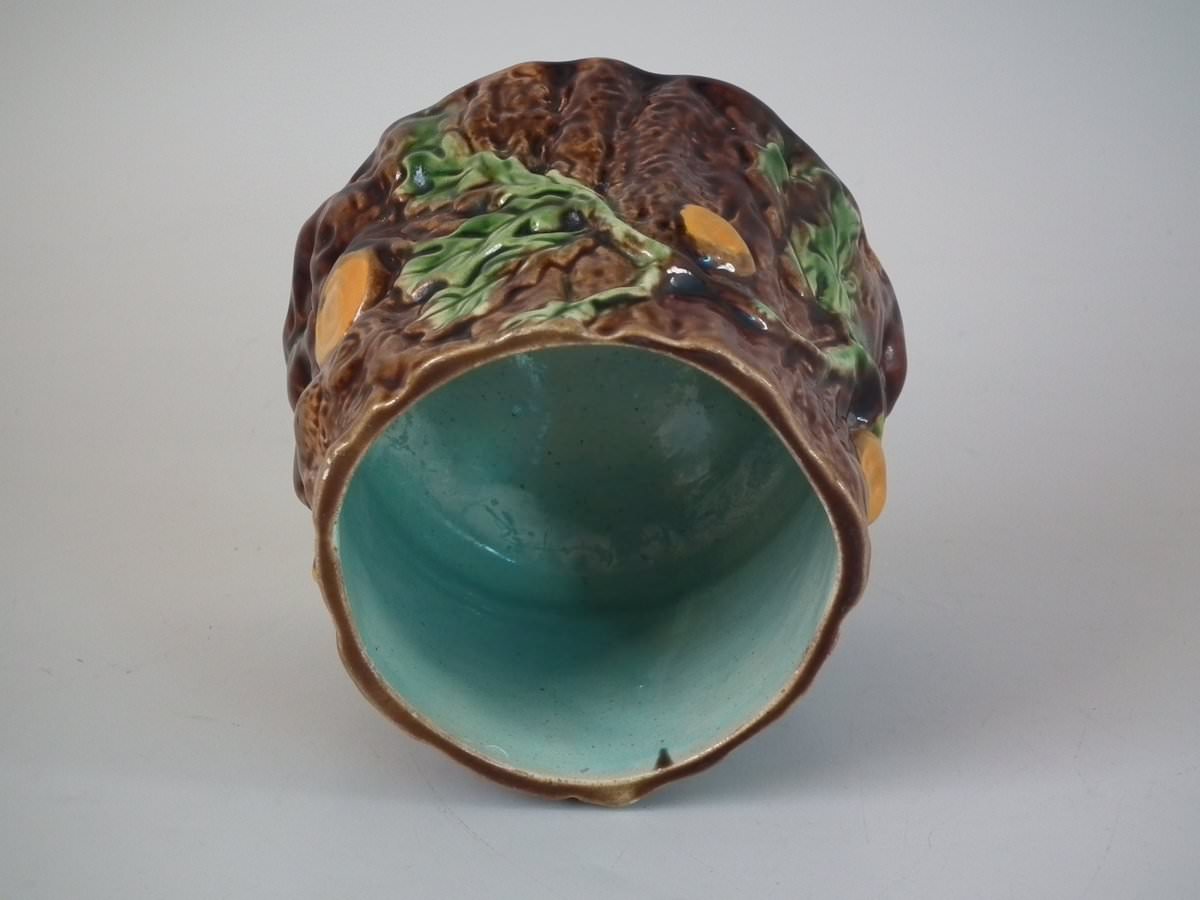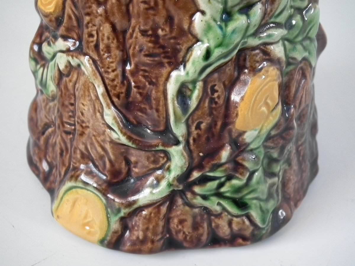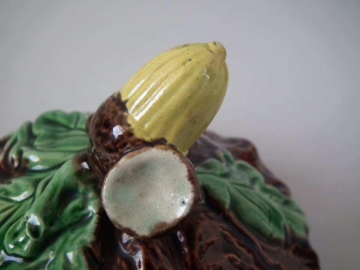 Victorian, circa 1880. 6.1ins high, 4.7ins wide, 4.9ins depth. Majolica pot and cover which features oak leaves and acorns on a bark ground.
