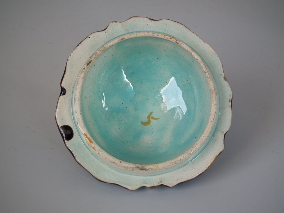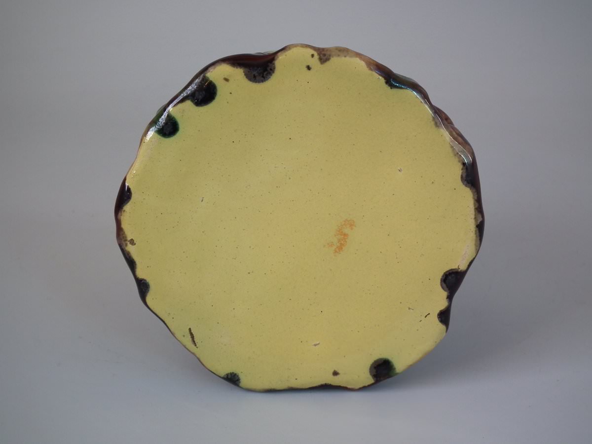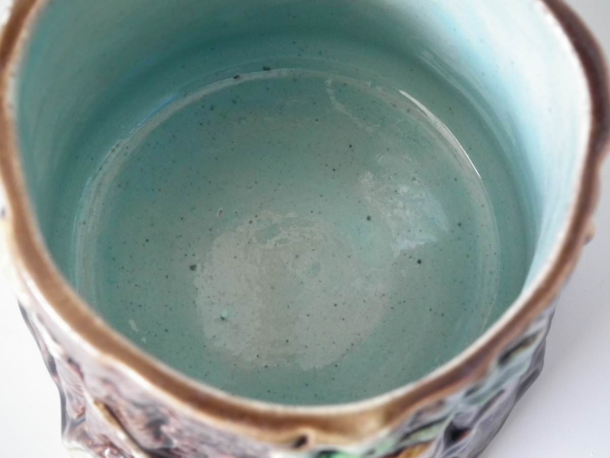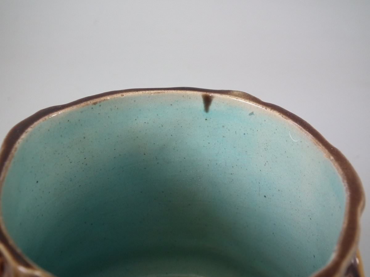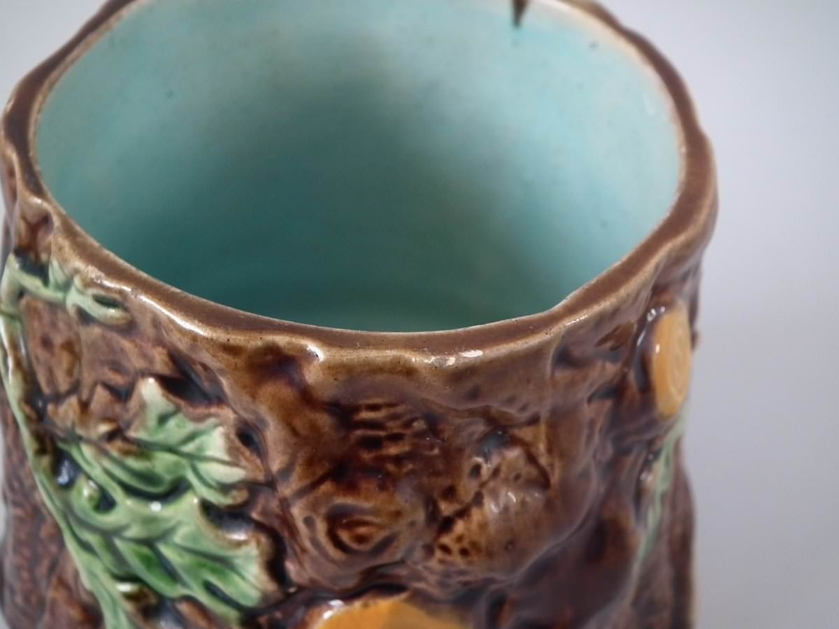 Victorian, circa 1880. 6.1ins high, 4.7ins wide, 4.9ins depth. Majolica pot and cover which features oak leaves and acorns on a bark ground.