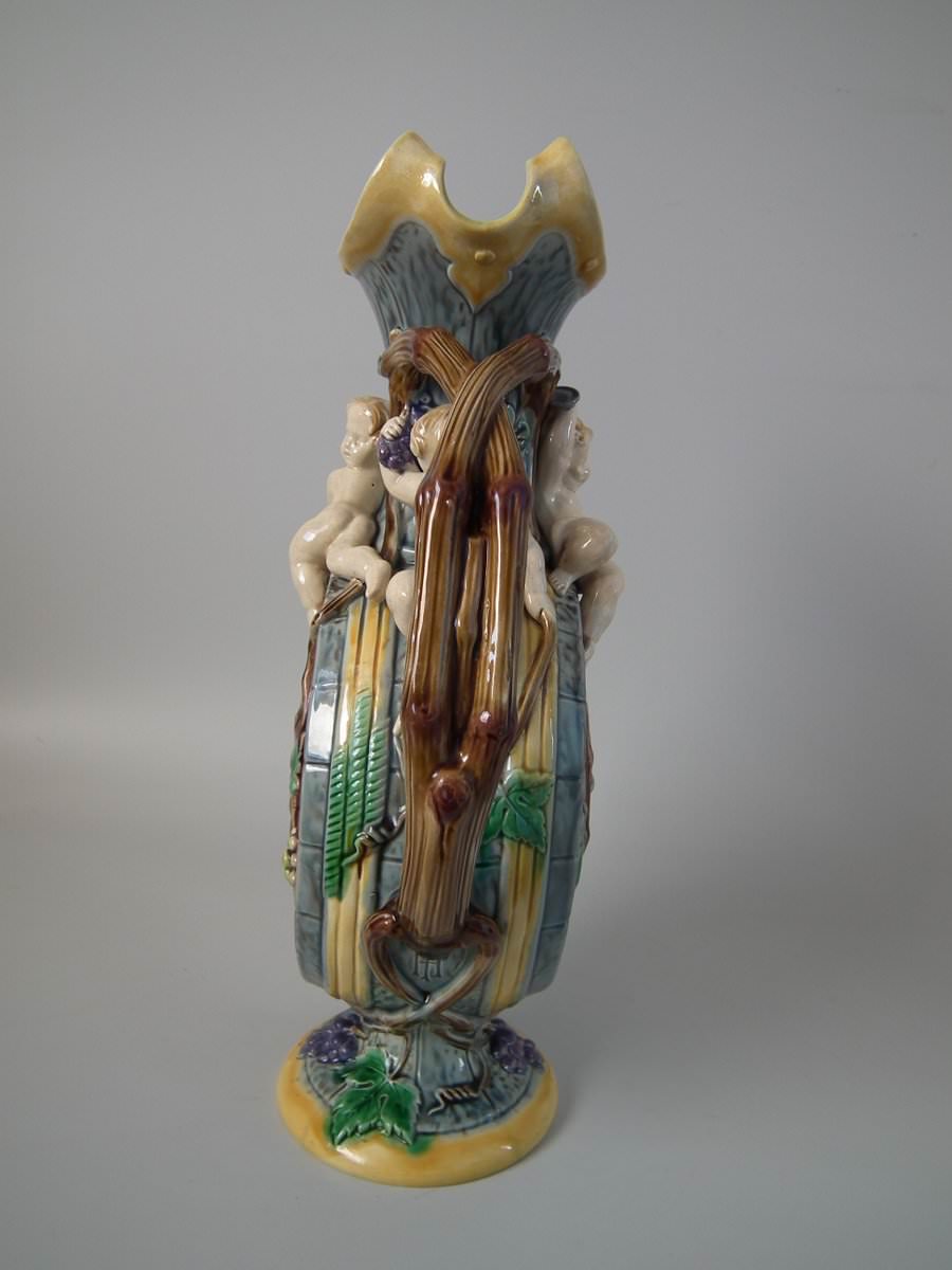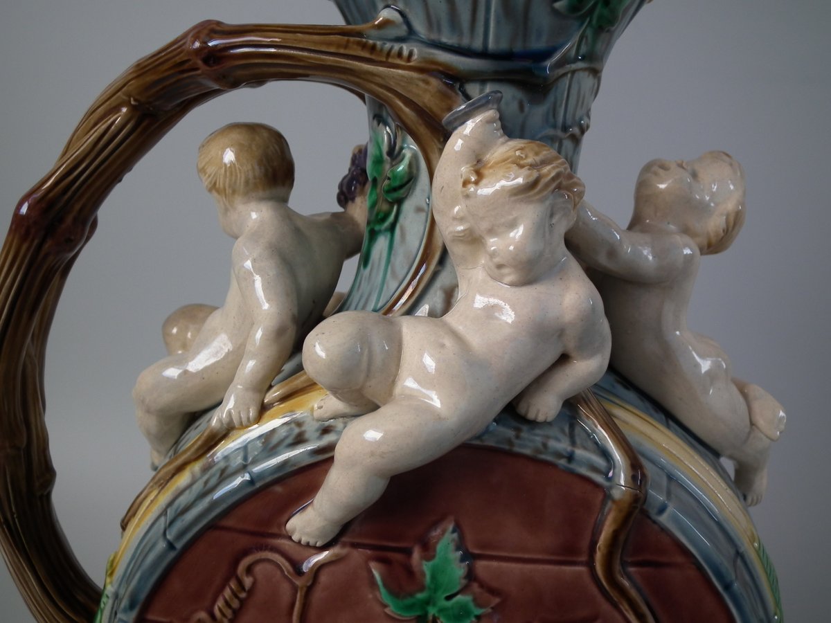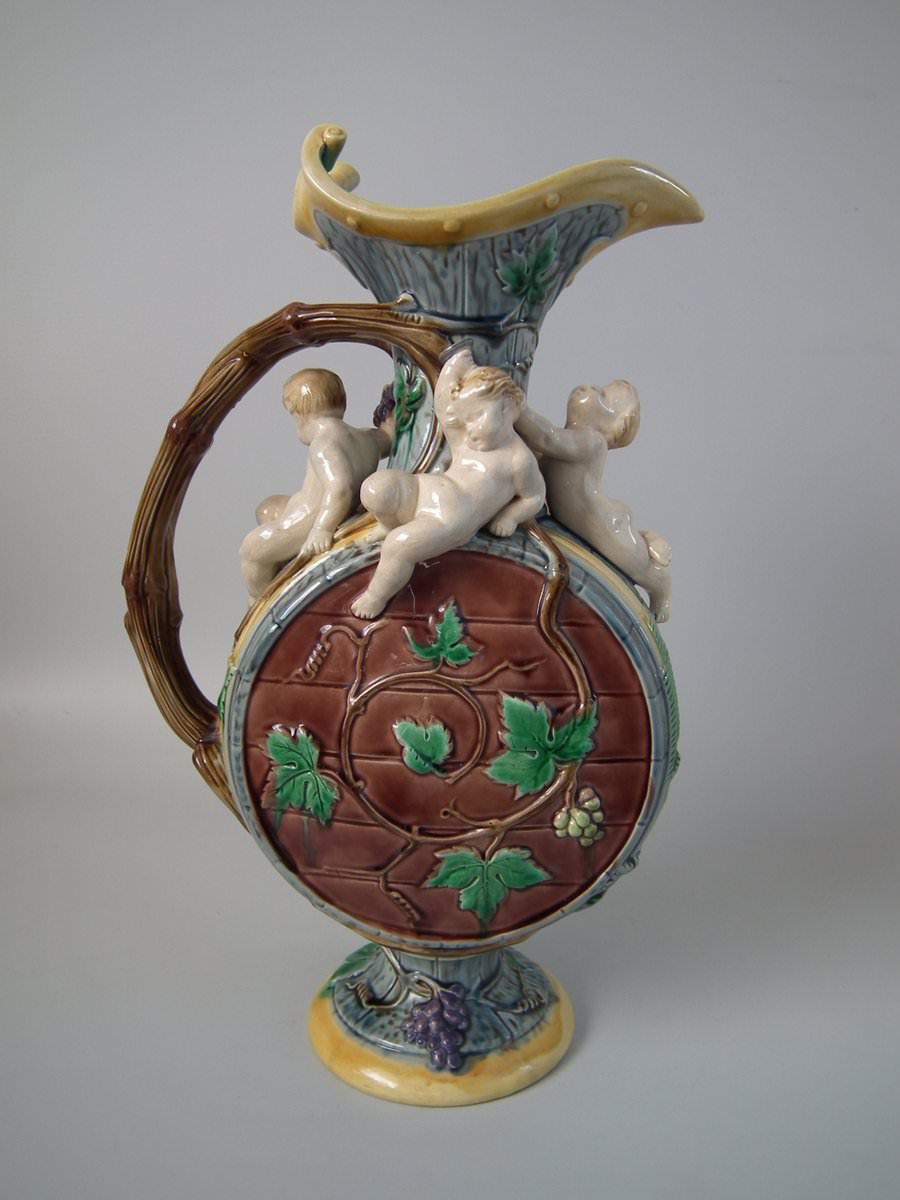 Victorian, circa 1860. 14.6ins high, 9.1ins wide, 4.3ins depth. Minton Majolica ewer which features a central barrel decorated with fruiting grape vines and four putti seated around a tapered neck.