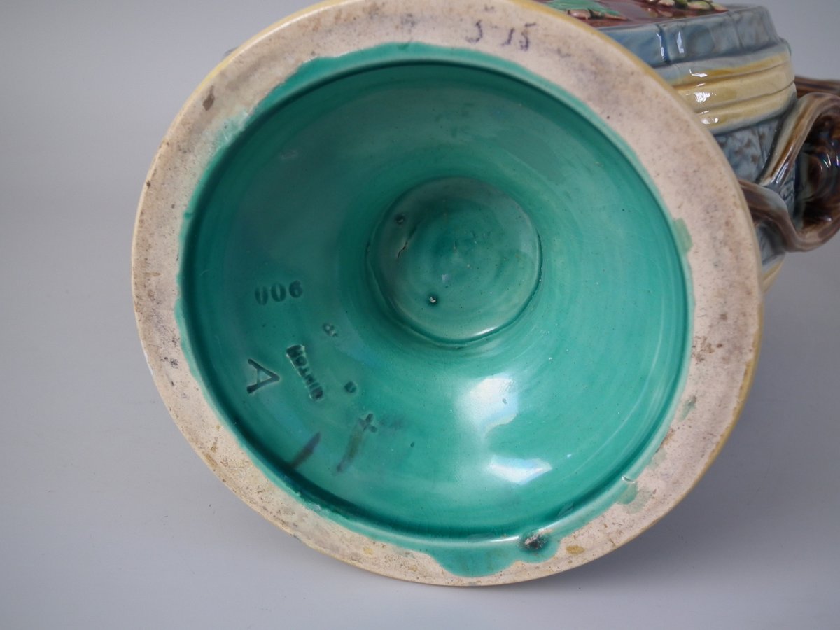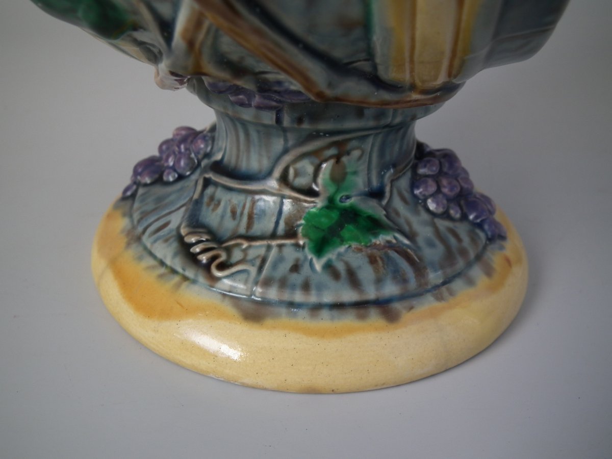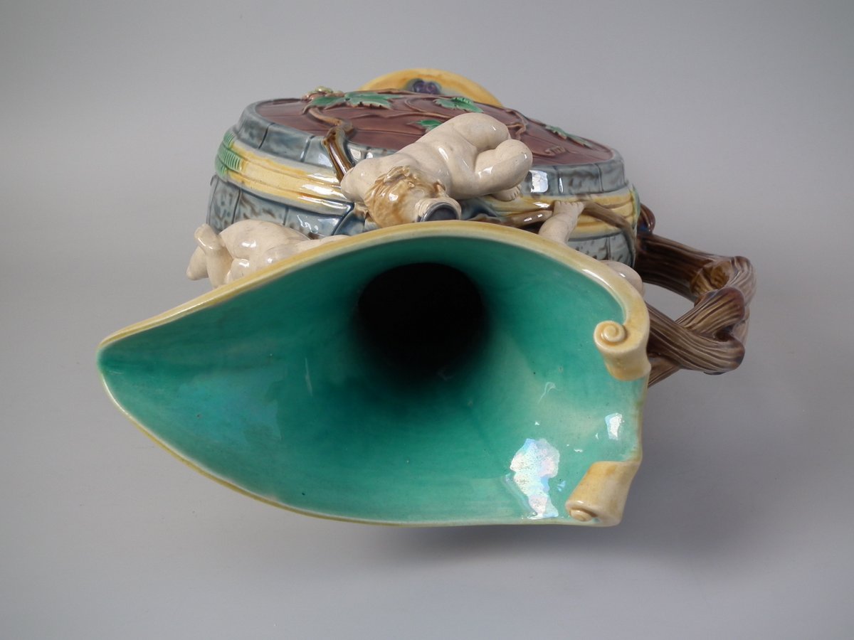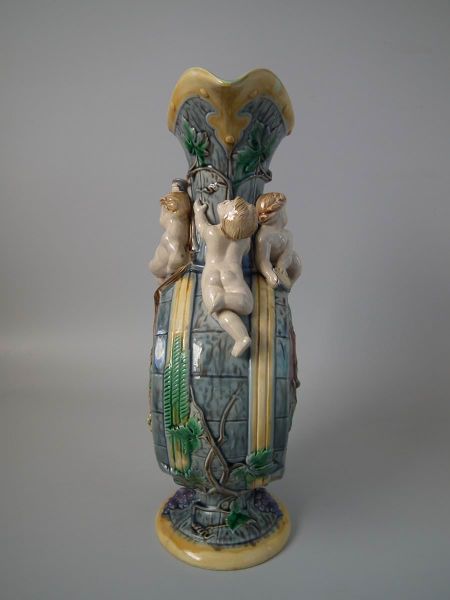 Victorian, circa 1860. 14.6ins high, 9.1ins wide, 4.3ins depth. Minton Majolica ewer which features a central barrel decorated with fruiting grape vines and four putti seated around a tapered neck.