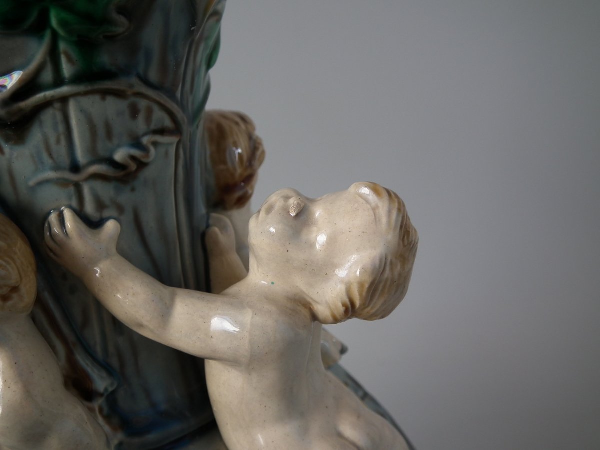 KILN EFFECTS: piece of kiln detritus caught in the glaze to one putti's face.