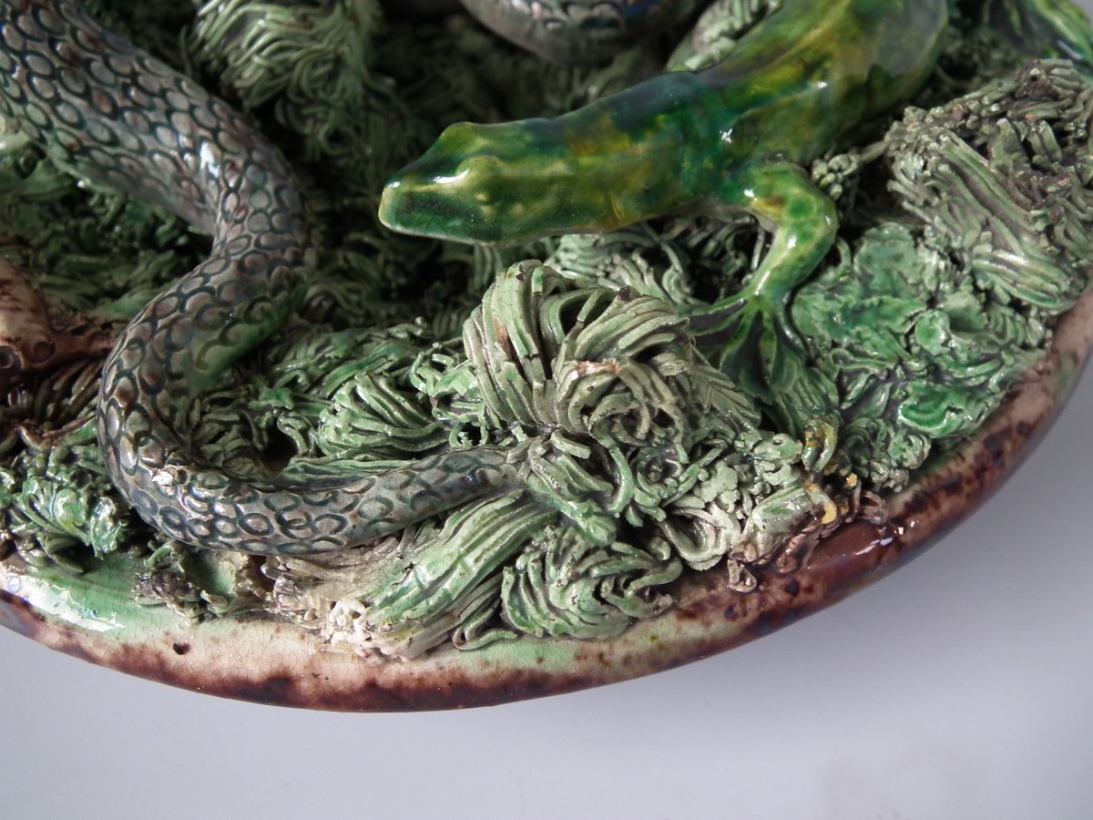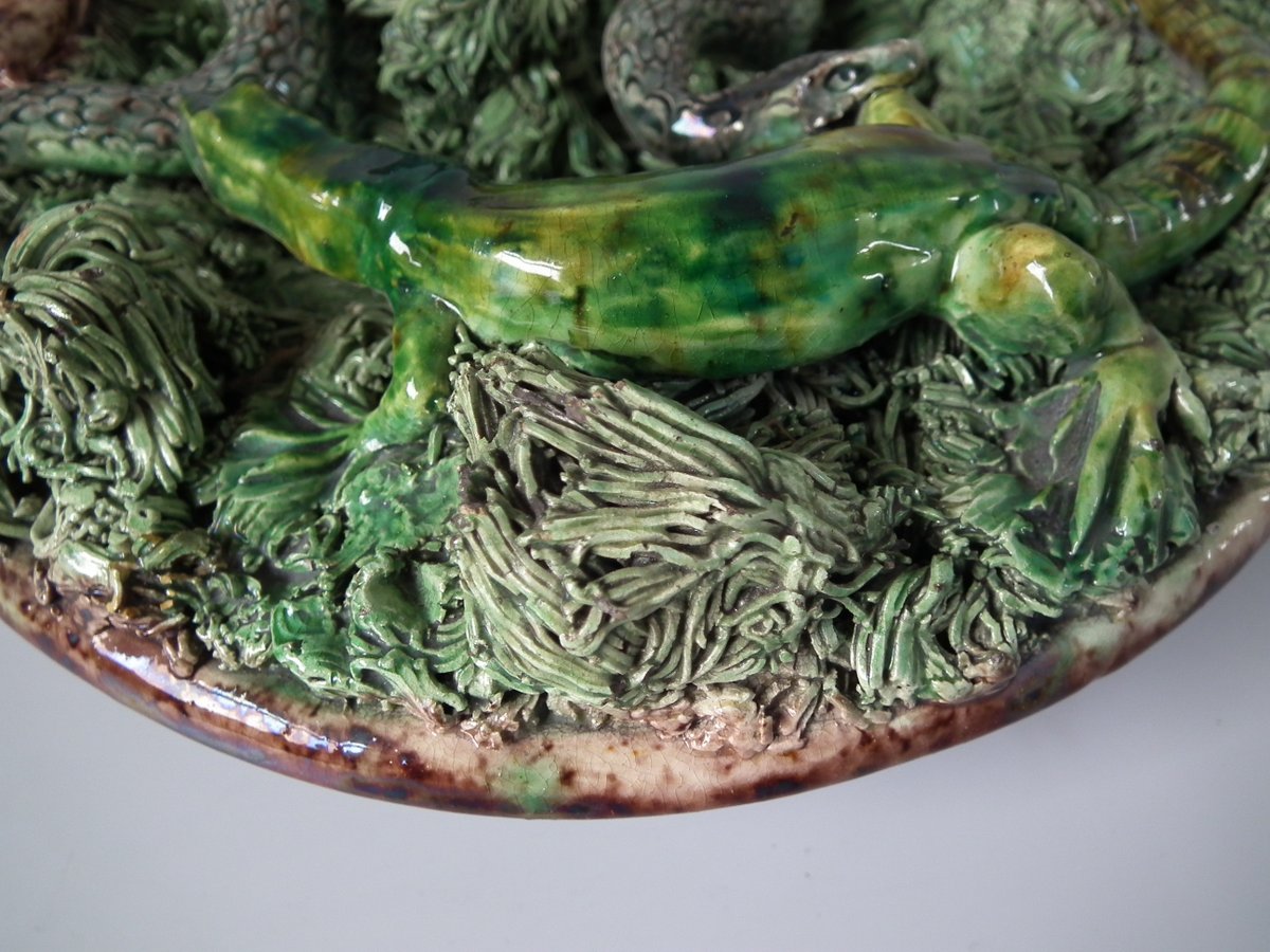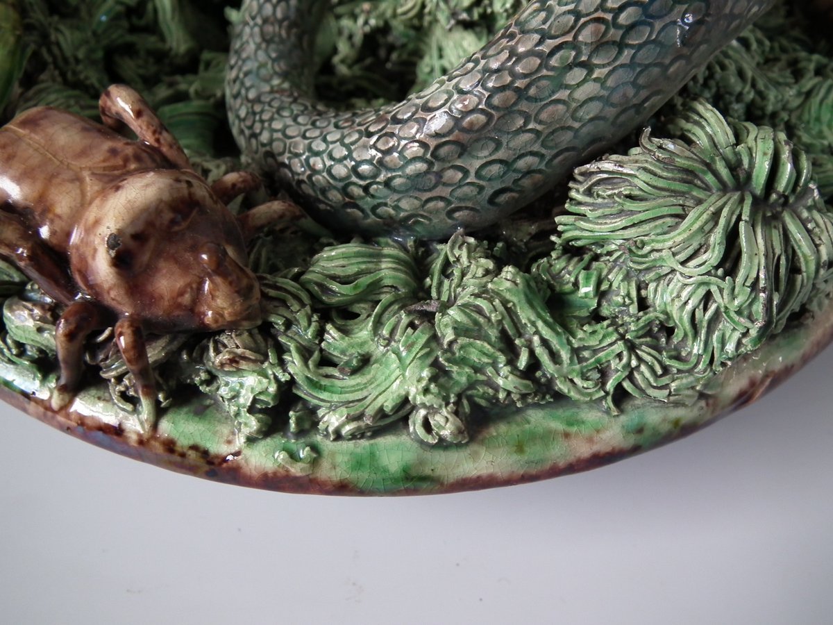 Circa 1890. 8.3ins high, 8.3ins wide, 2.8ins depth. Mafra Portuguese Palissy Majolica wall plate which features a lizard, a snake, beetle and a grub.