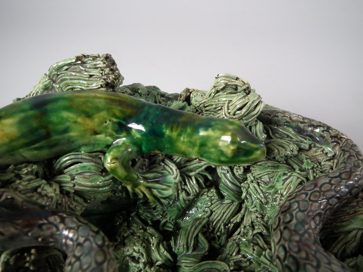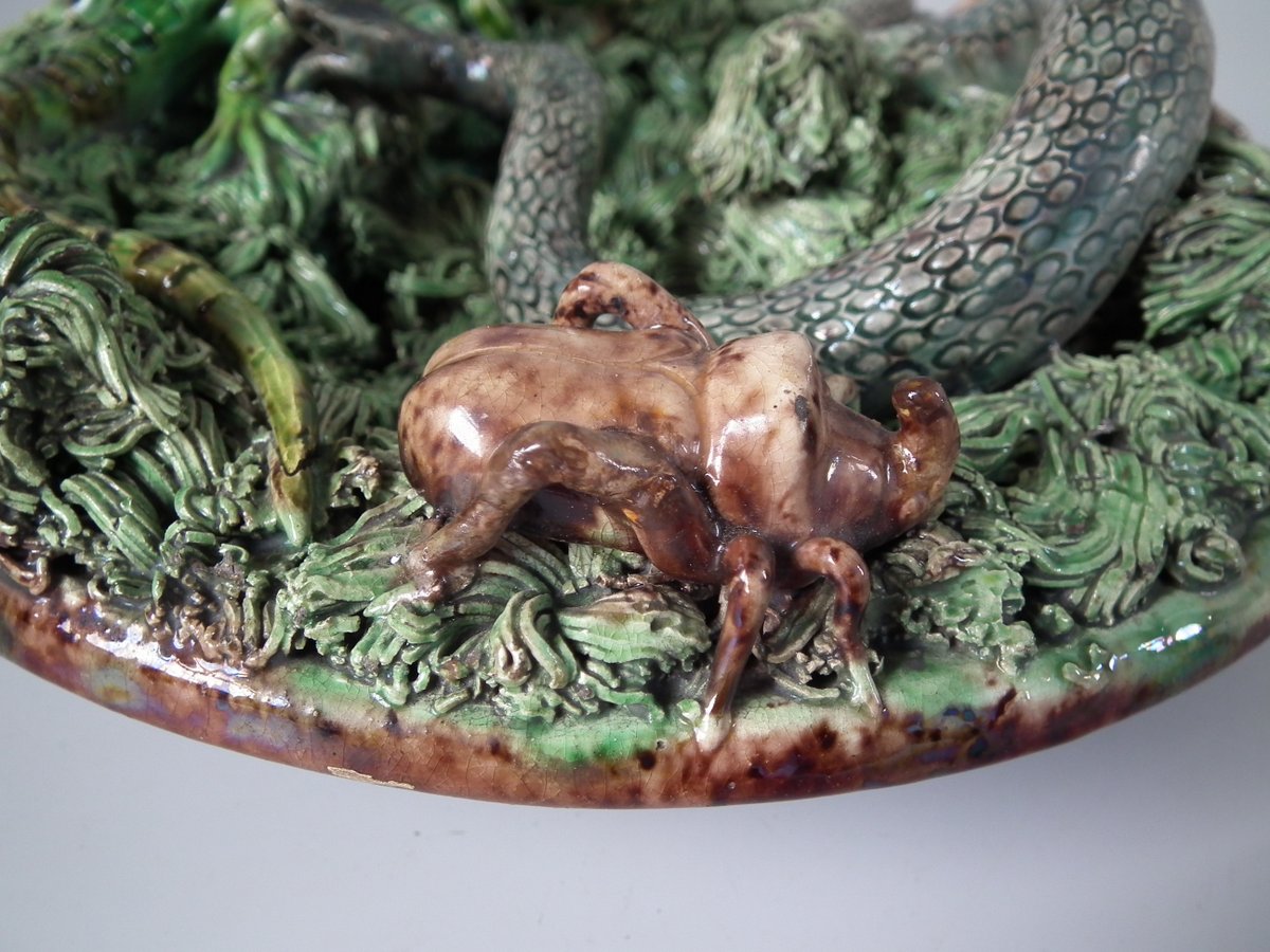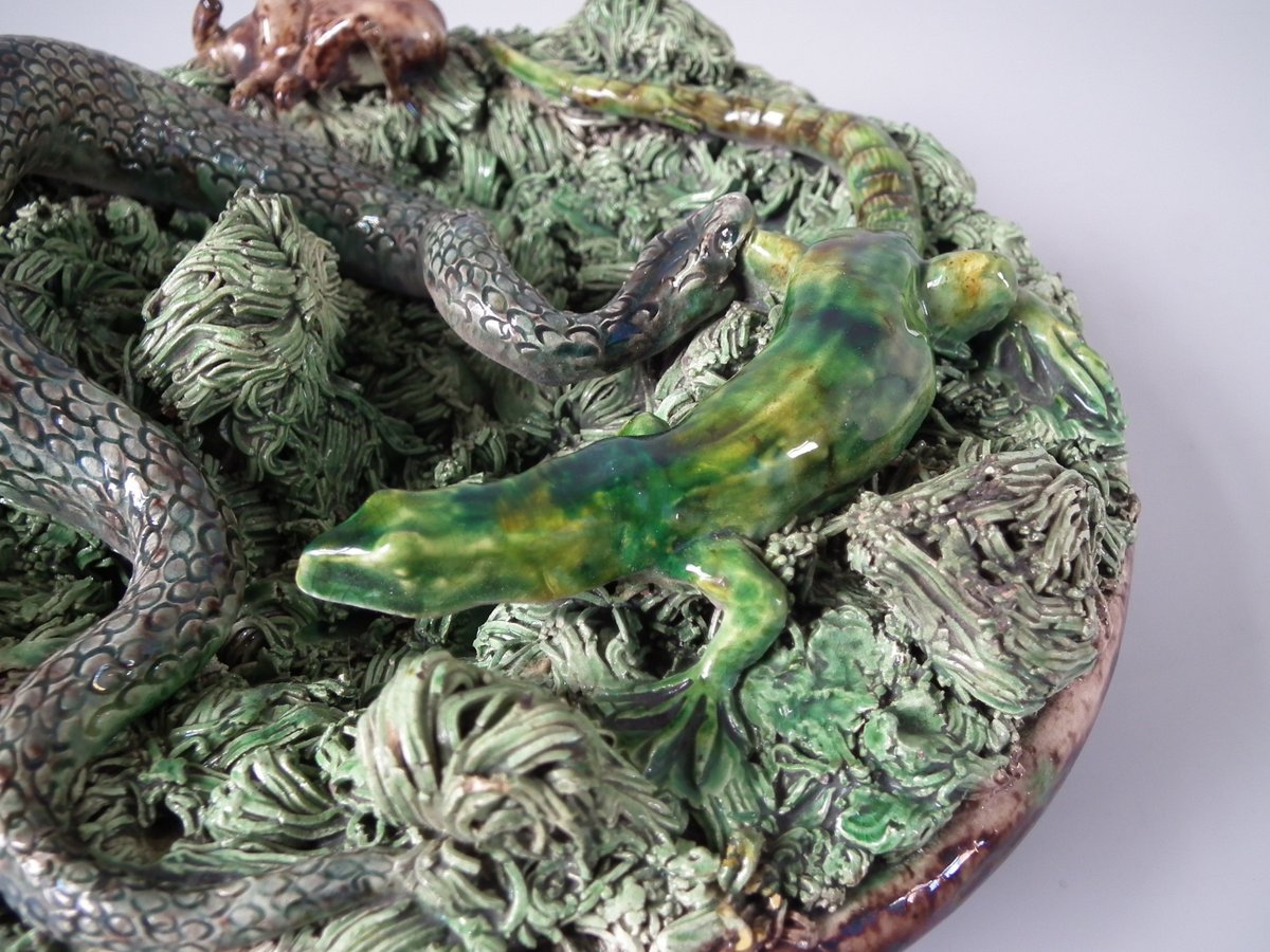 Circa 1890. 8.3ins high, 8.3ins wide, 2.8ins depth. Mafra Portuguese Palissy Majolica wall plate which features a lizard, a snake, beetle and a grub.