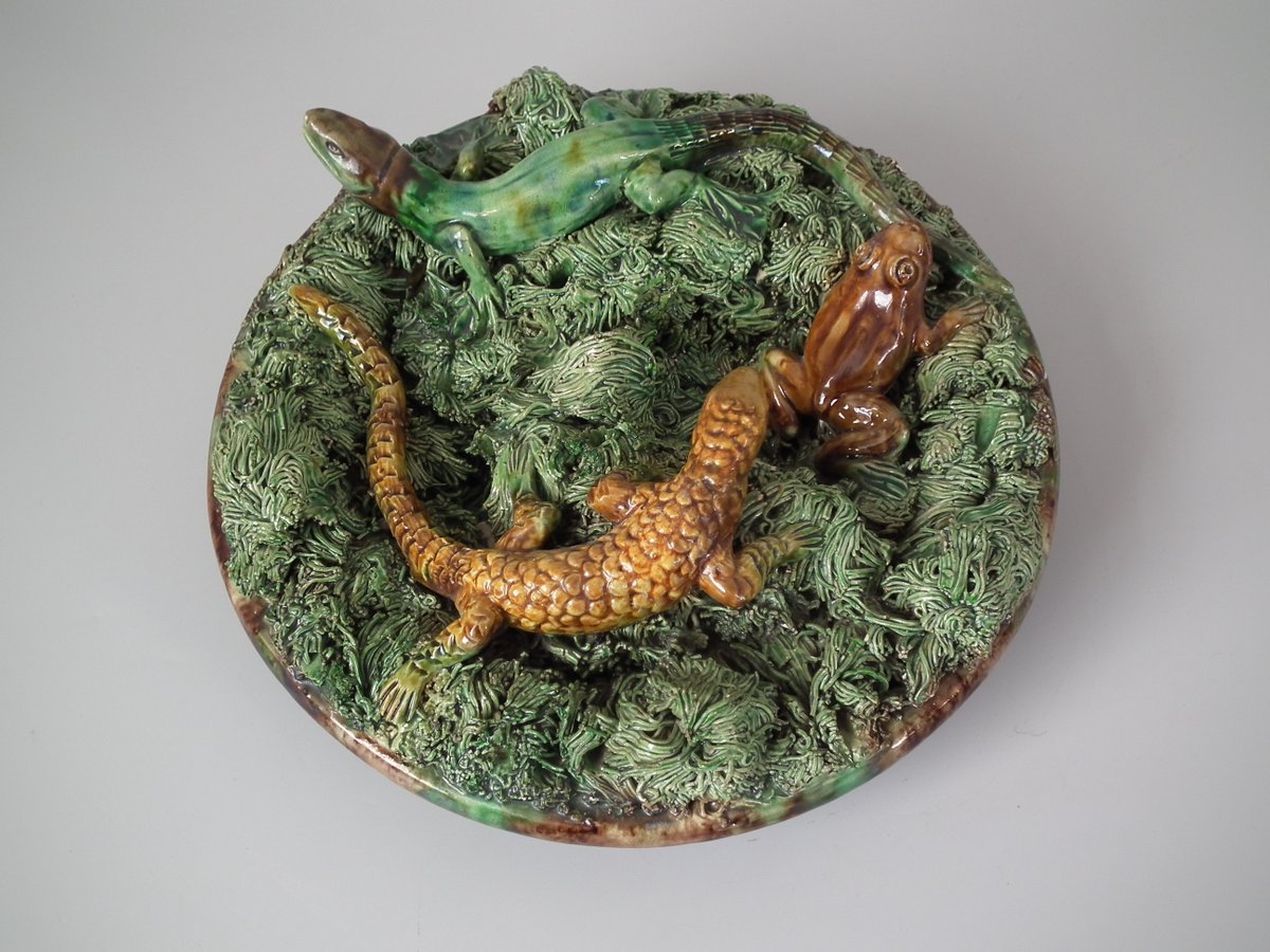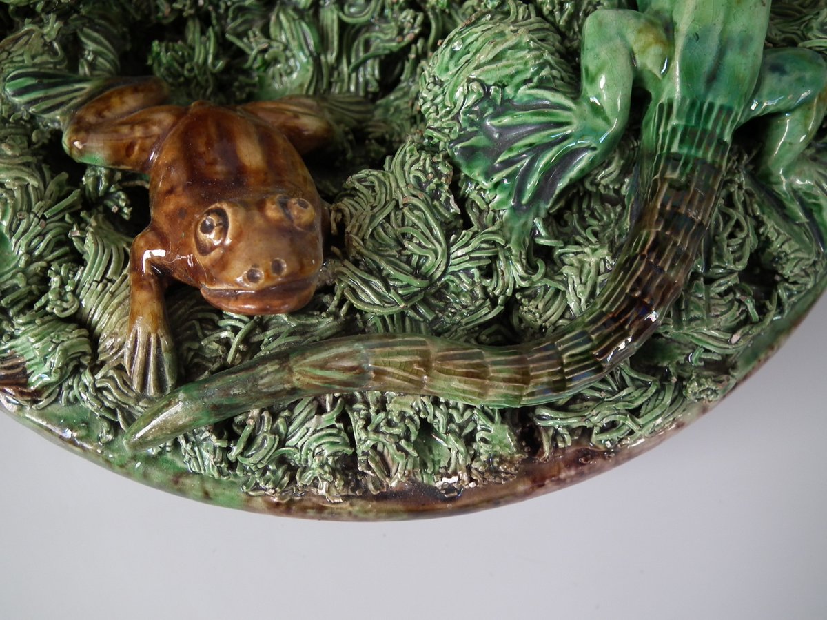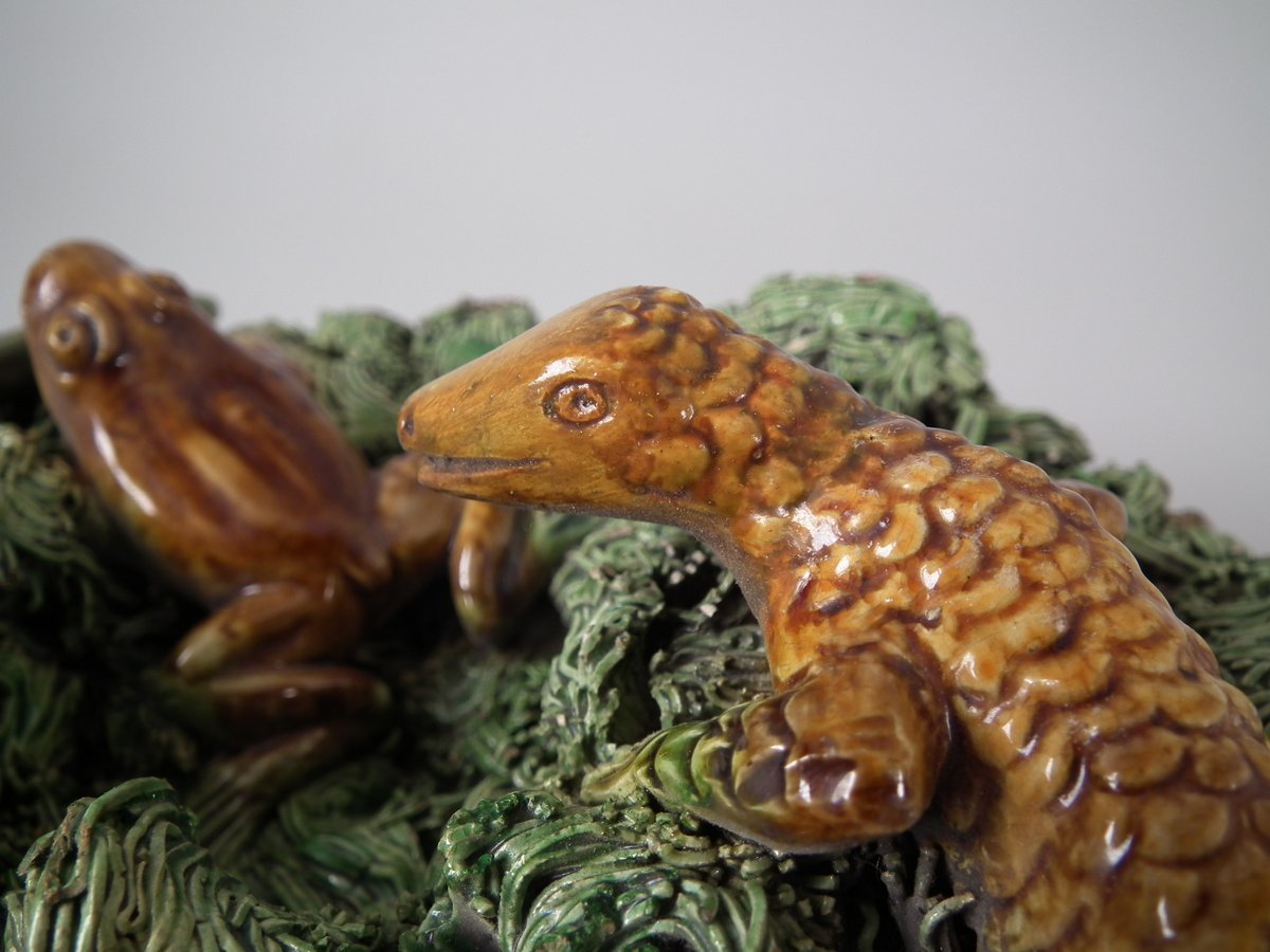 Circa 1890. 8.1ins high, 8.1ins wide, 3.1ins depth. Mafra Portuguese Palissy Majolica wall plate which features a frog, lizard and salamander.
