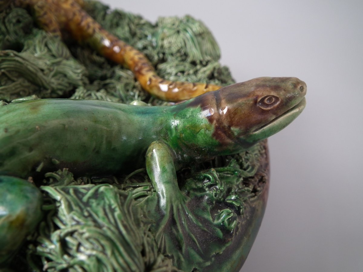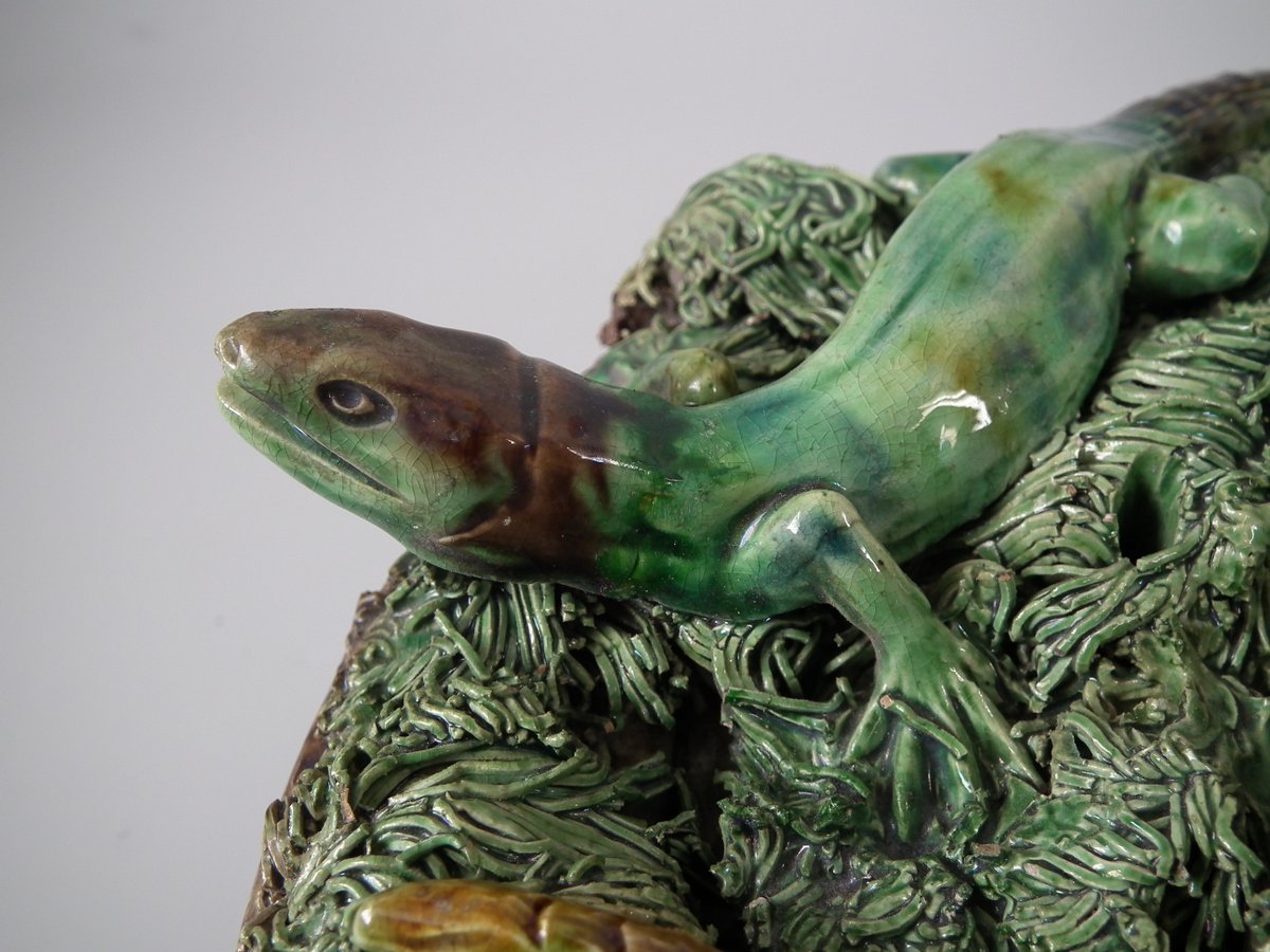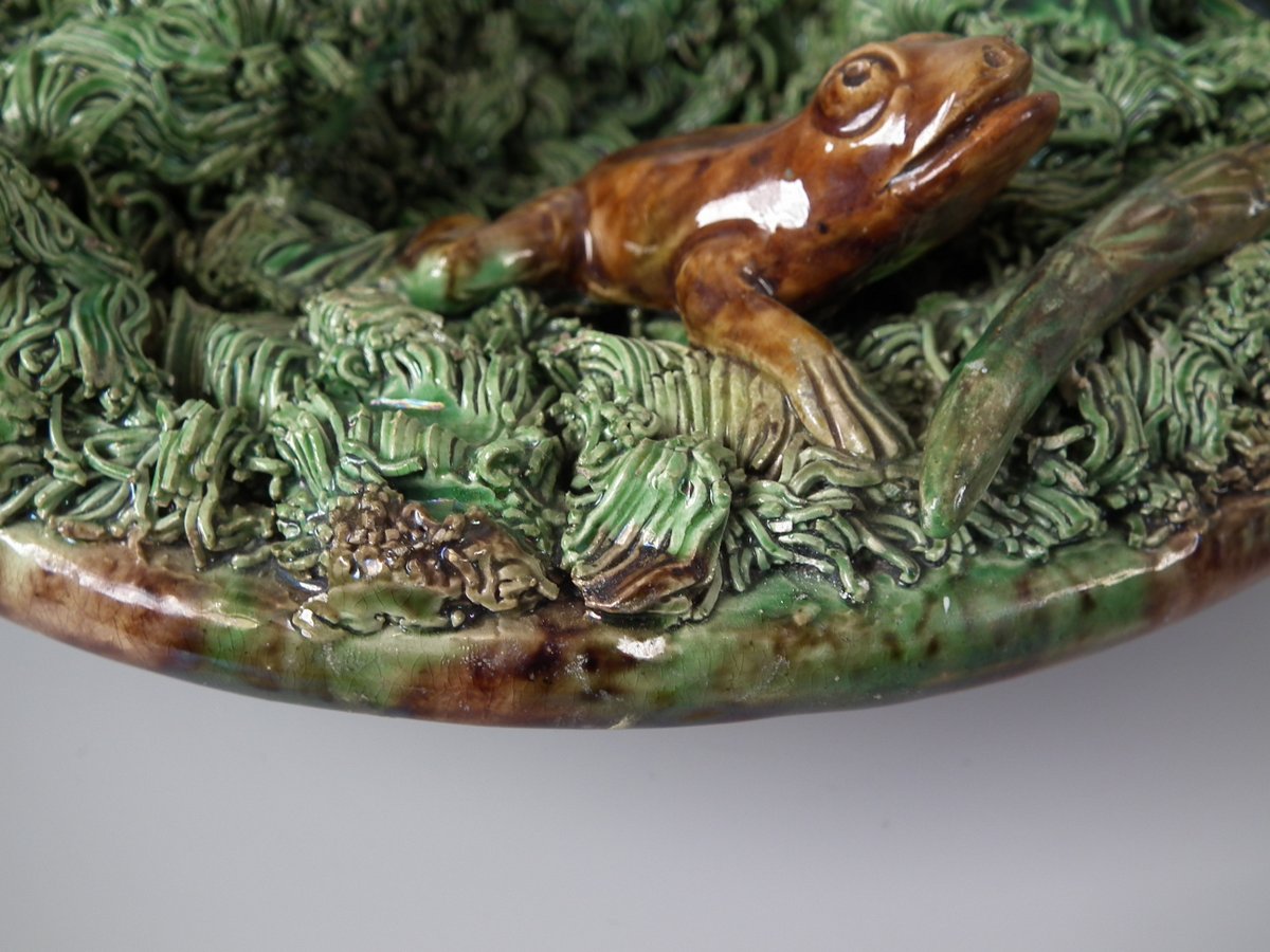 Circa 1890. 8.1ins high, 8.1ins wide, 3.1ins depth. Mafra Portuguese Palissy Majolica wall plate which features a frog, lizard and salamander.