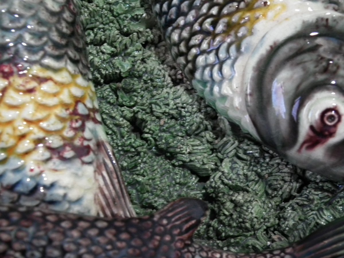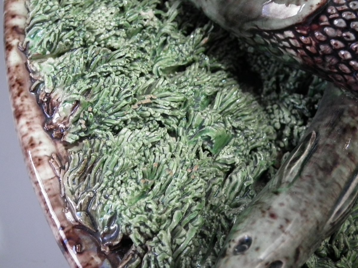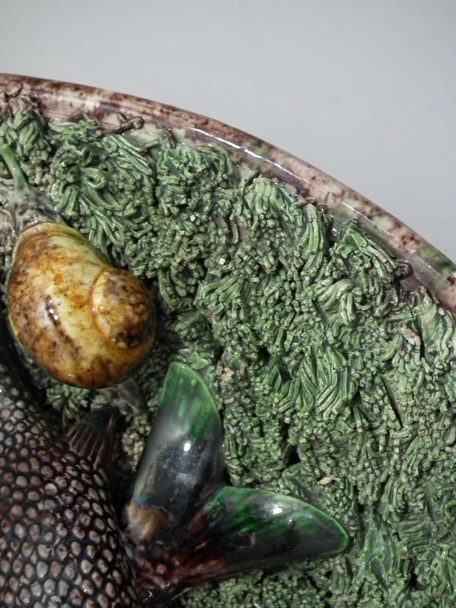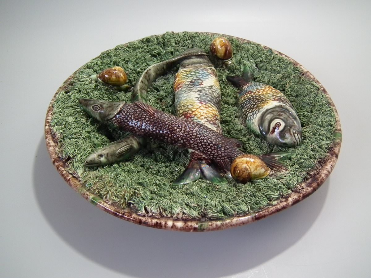 Circa 1890. 12.2ins high, 12.2ins wide, 3.3ins depth. Mafra Portuguese Palissy Majolica wall plate which features fish, an eel and snails.
