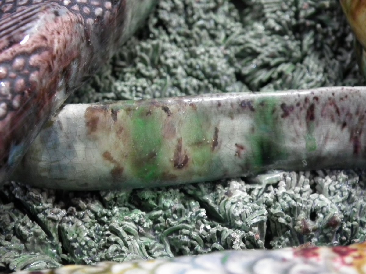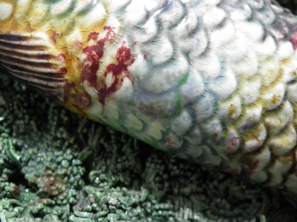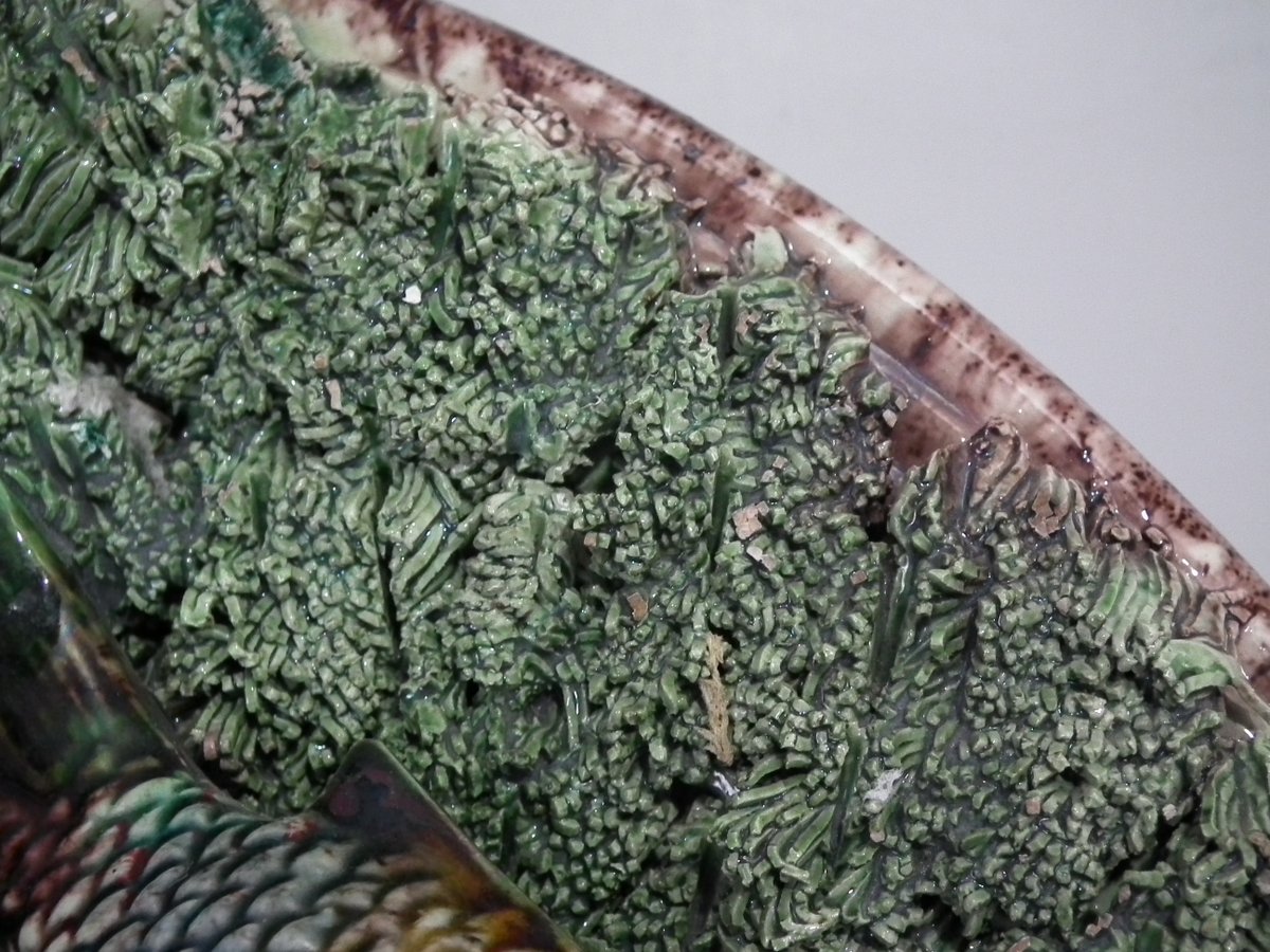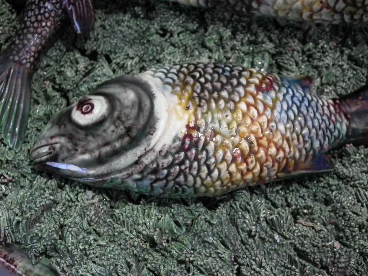 Circa 1890. 12.2ins high, 12.2ins wide, 3.3ins depth. Mafra Portuguese Palissy Majolica wall plate which features fish, an eel and snails.