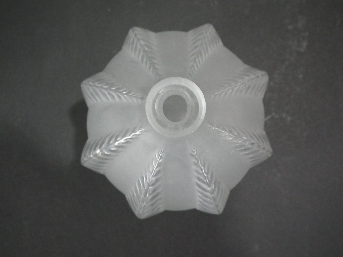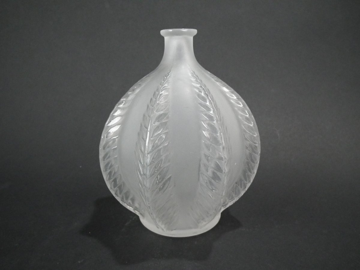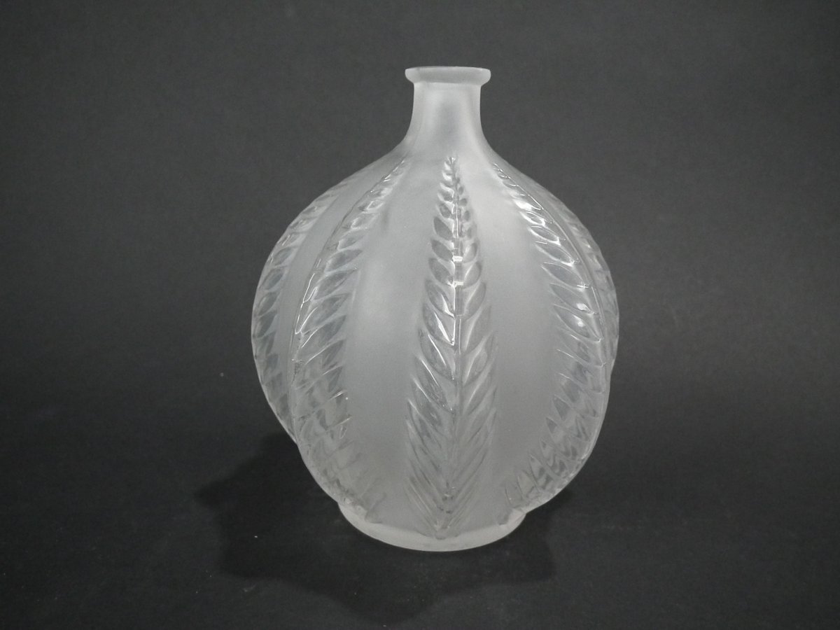 Introduced in 1924. Height: 13cm (5.12ins). Width: 10cm (3.94ins). Depth: 10cm (3.94ins).. Rene Lalique clear & frosted glass 'Malines' vase. Pattern features fern fronds, climbing up the sides.