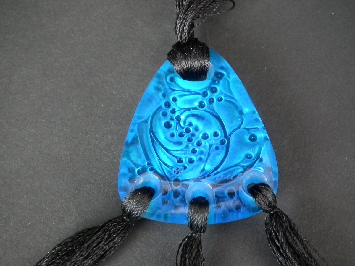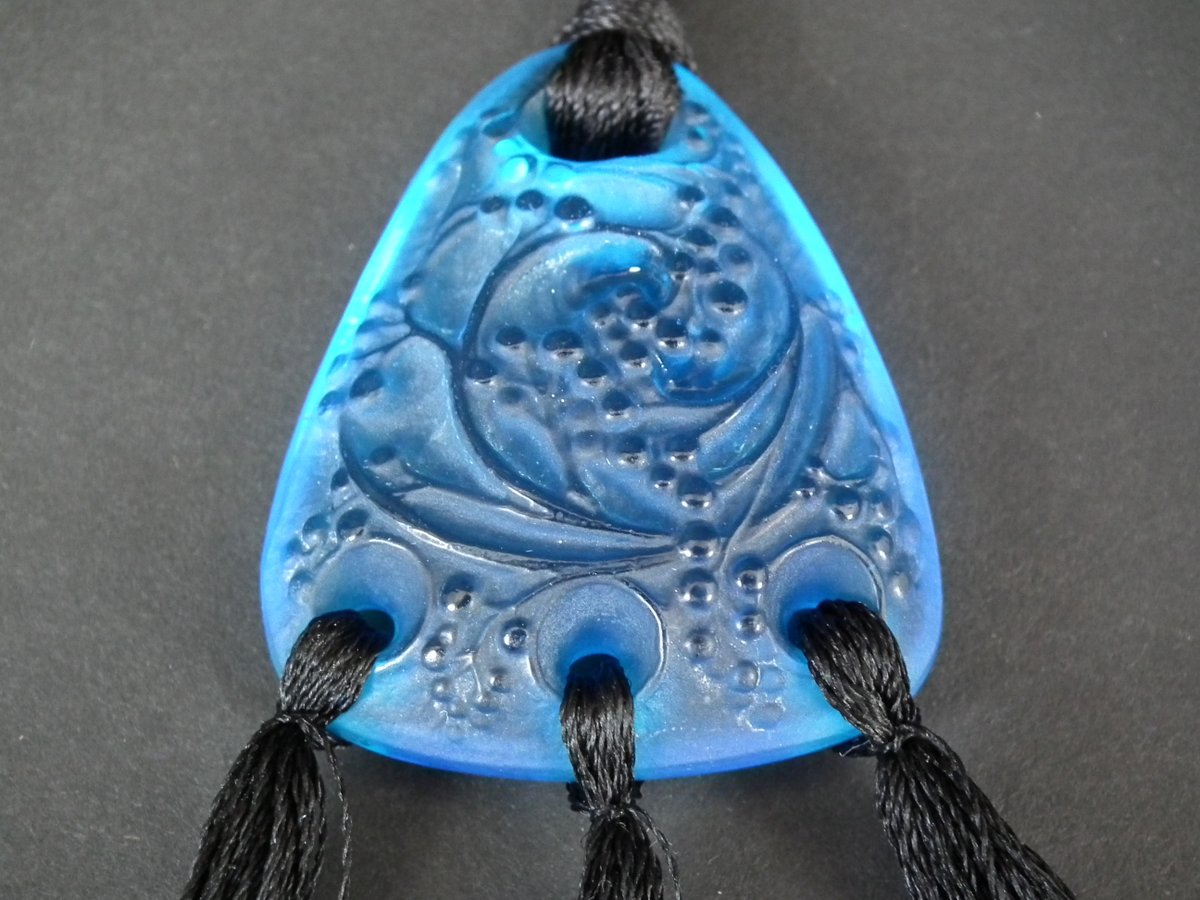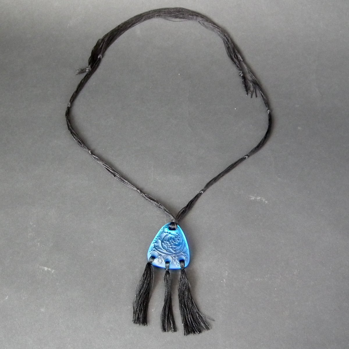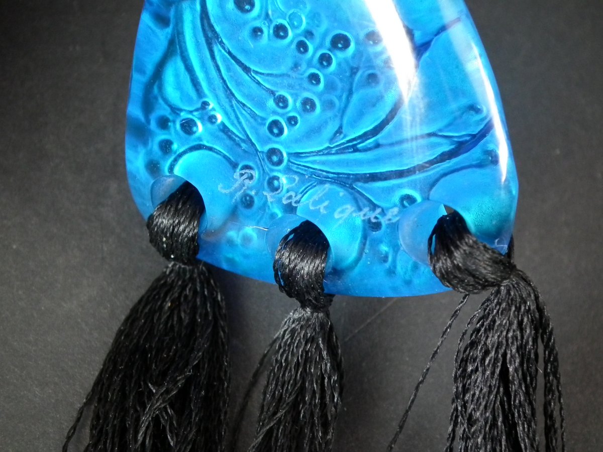 Introduced in 1920. Height: 5cm (1.97ins). Width: 4cm (1.57ins). Depth: 1cm (0.39ins).. Rene Lalique Electric blue Glass 'Graines' Pendant.
